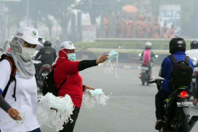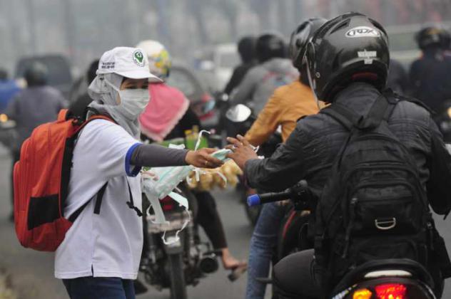 Seorang petugas dari Dinas Kesehatan Pemprov Jambi membagikan masker gratis kepada pengendara yang melintasi Jalan A. Rahman Saleh, Jambi, Rabu (9/9). Pembagian masker itu untuk mengantisipasi dampak kabut asap yang menyebabkan timbulnya penyakit infeksi saluran pernafasan atas (ISPA). ANTARA FOTO/Wahyu Putro A
