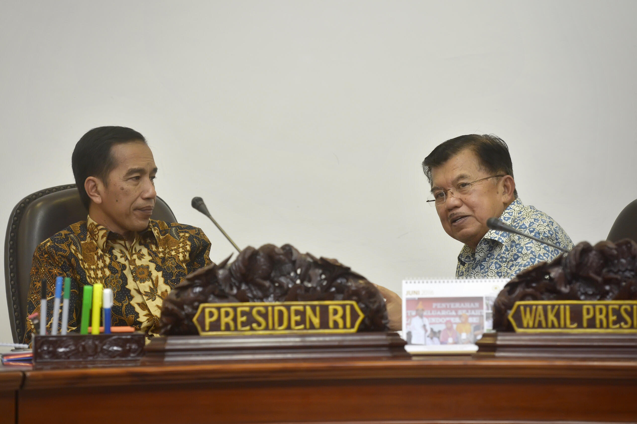 Presiden Joko Widodo (kiri) berdiskusi dengan Wapres Jusuf Kalla (kanan) saat memimpin Rapat Terbatas Kabinet membahas Kawasan Ekonomi Khusus Papua di Kantor Presiden, Jakarta, Selasa (14/6). Sebagai persiapan pembangunan Kawasan Ekonomi Khusus (KEK) di Sorong, Papua Barat, Presiden menginstruksikan agar jajarannya memastikan kesiapan lokasi, zonasi, lahan dan lain sebagainya, untuk menentukan apakah wilayah tersebut saat ini sudah benar-benar layak untuk disiapkan menjadi sebuah KEK untuk memajukan wilayah Papua. ANTARA FOTO/Yudhi Mahatma/ama/16