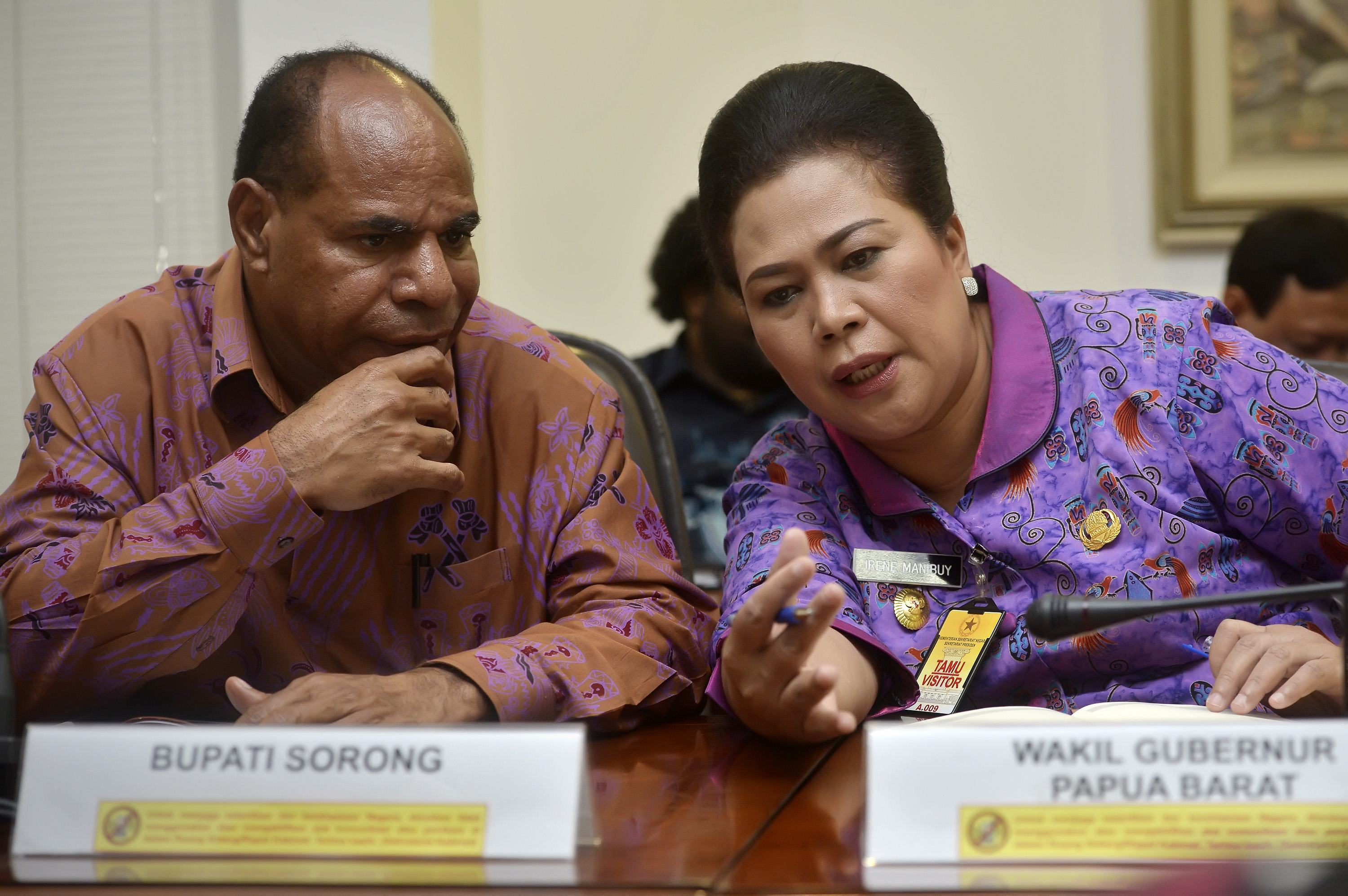 Wakil Gubernur Papua Barat Irene Manibuy (kanan) berdiskusi dengan Bupati Sorong Steve Malak (kiri) saat Rapat Terbatas Kabinet membahas Kawasan Ekonomi Khusus Papua di Kantor Presiden, Jakarta, Selasa (14/6). Sebagai persiapan pembangunan Kawasan Ekonomi Khusus (KEK) di Sorong, Papua Barat, Presiden menginstruksikan agar jajarannya memastikan kesiapan lokasi, zonasi, lahan dan lain sebagainya, untuk menentukan apakah wilayah tersebut saat ini sudah benar-benar layak untuk disiapkan menjadi sebuah KEK untuk memajukan wilayah Papua. ANTARA FOTO/Yudhi Mahatma/ama/16