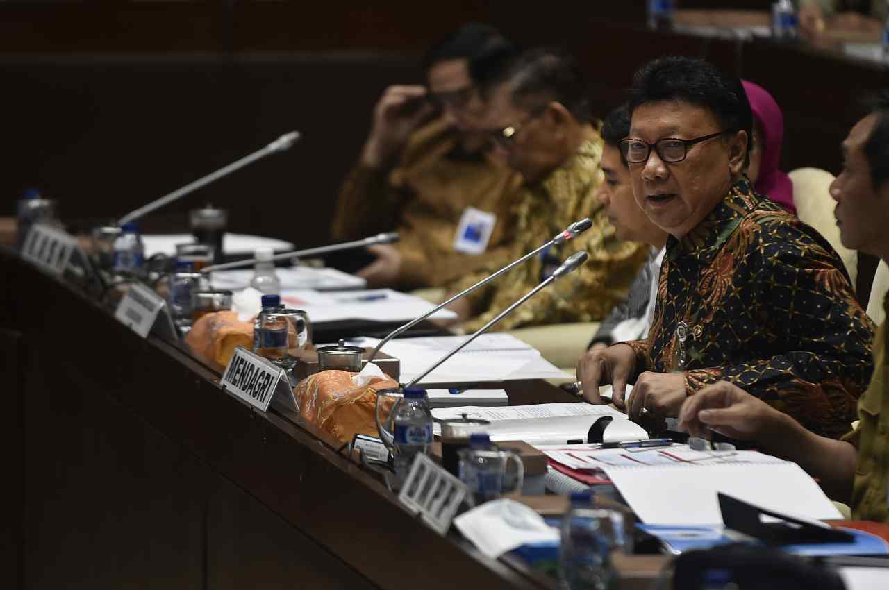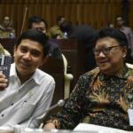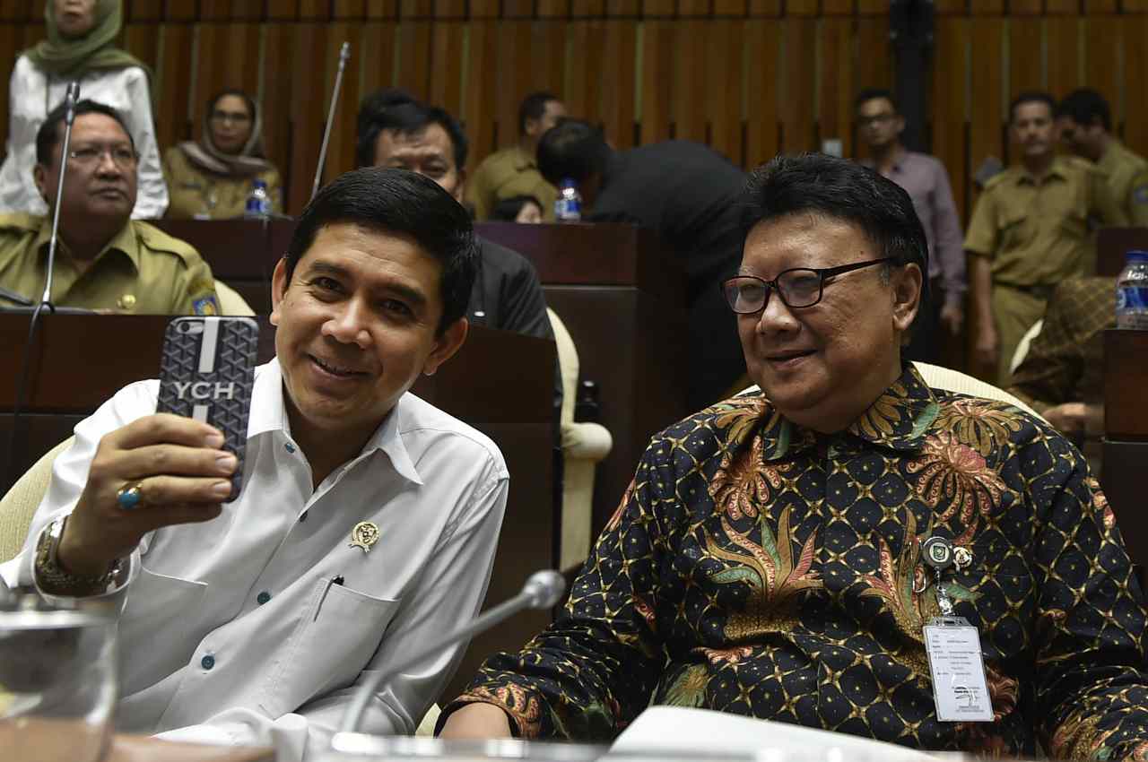 Mendagri Tjahjo Kumolo (kanan) bersama Menteri Pemberdayaan Aparatur Negara dan Reformasi Birokrasi Yuddy Chrisnandi mengikuti rapat dengan Komisi II di Komplek Parlemen Senayan, Jakarta, Selasa (19/7). Rapat kerja tersebut membahas R-APBN tahun 2017. ANTARA FOTO/Puspa Perwitasari/Spt/16