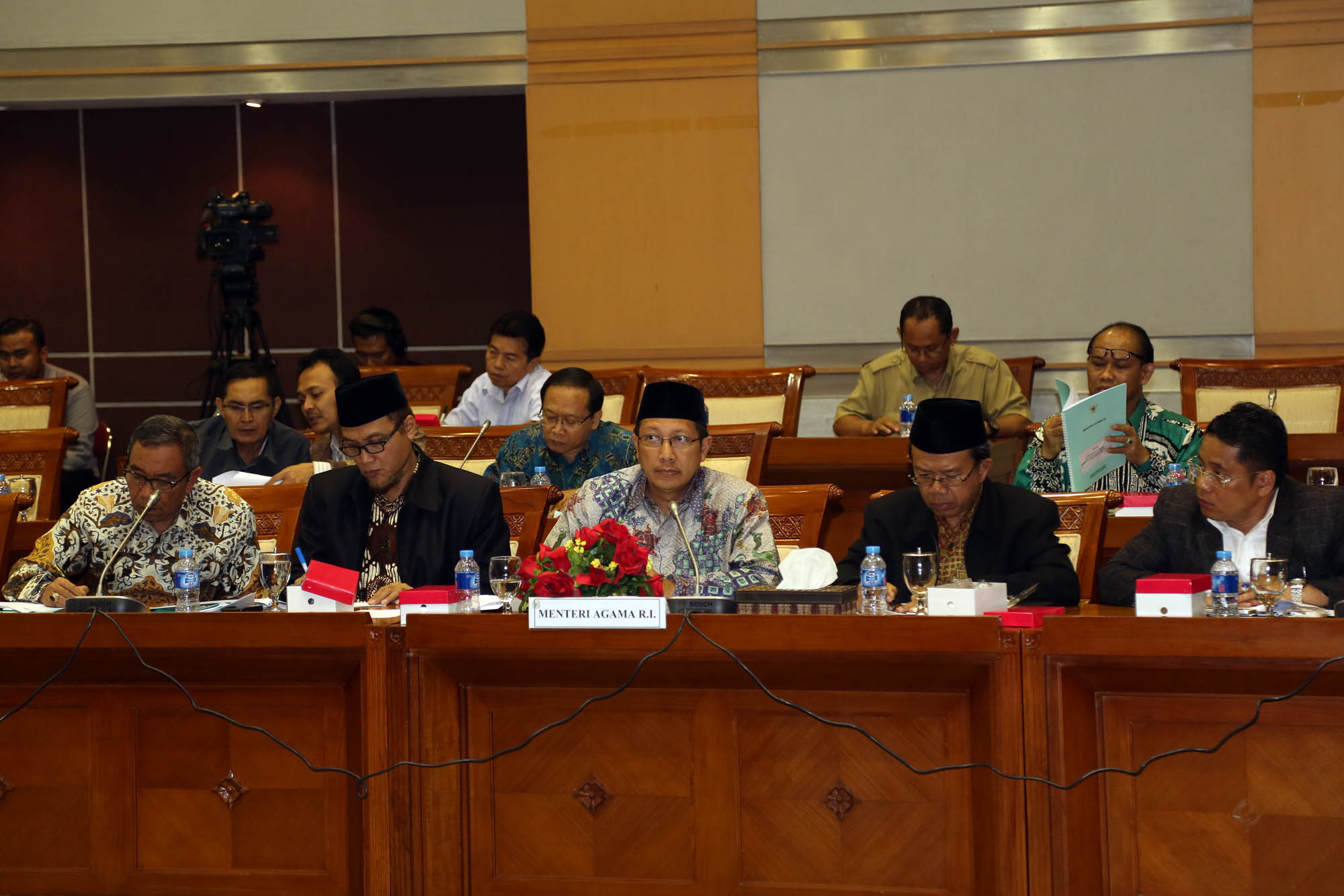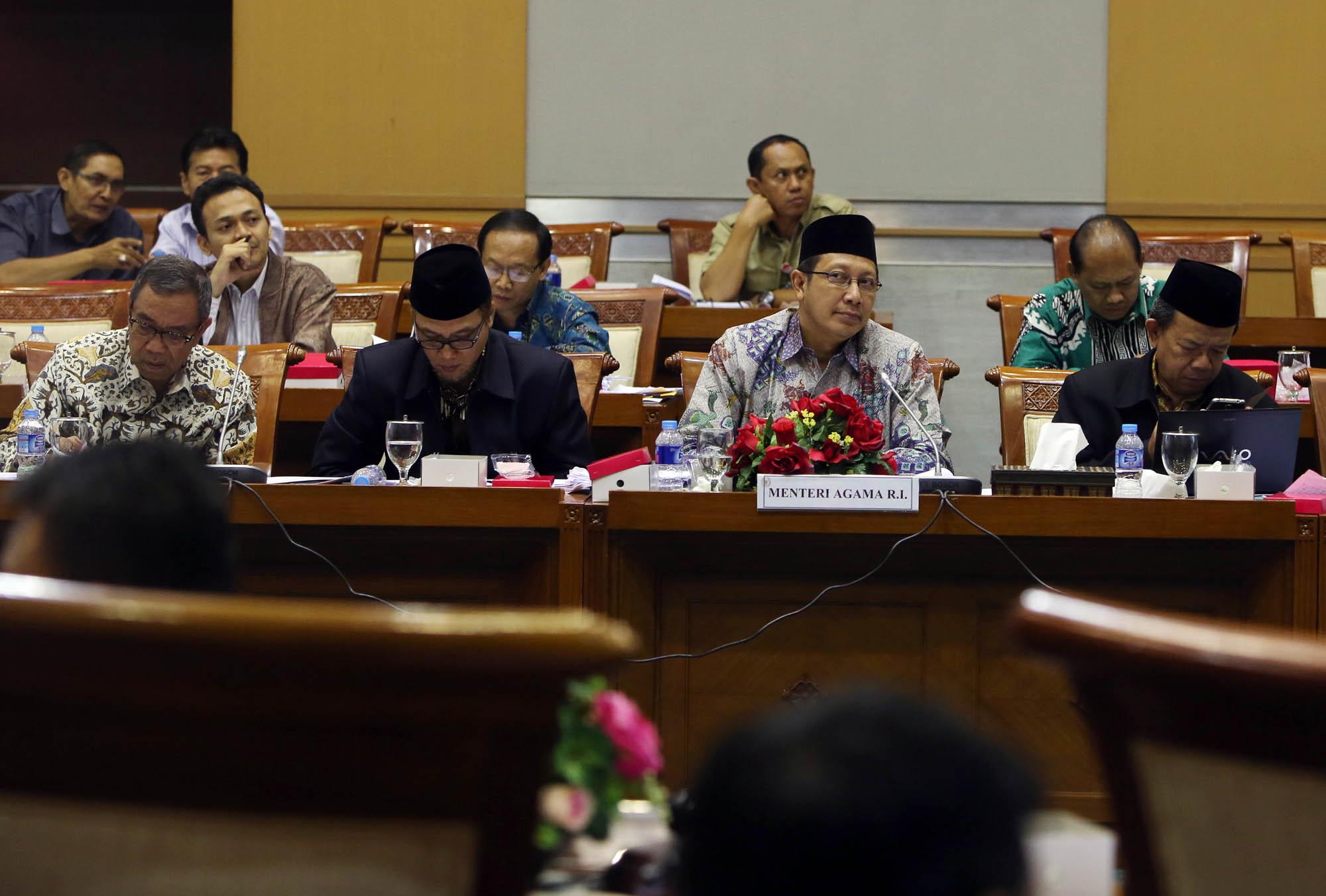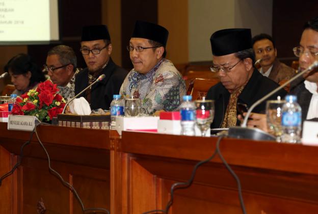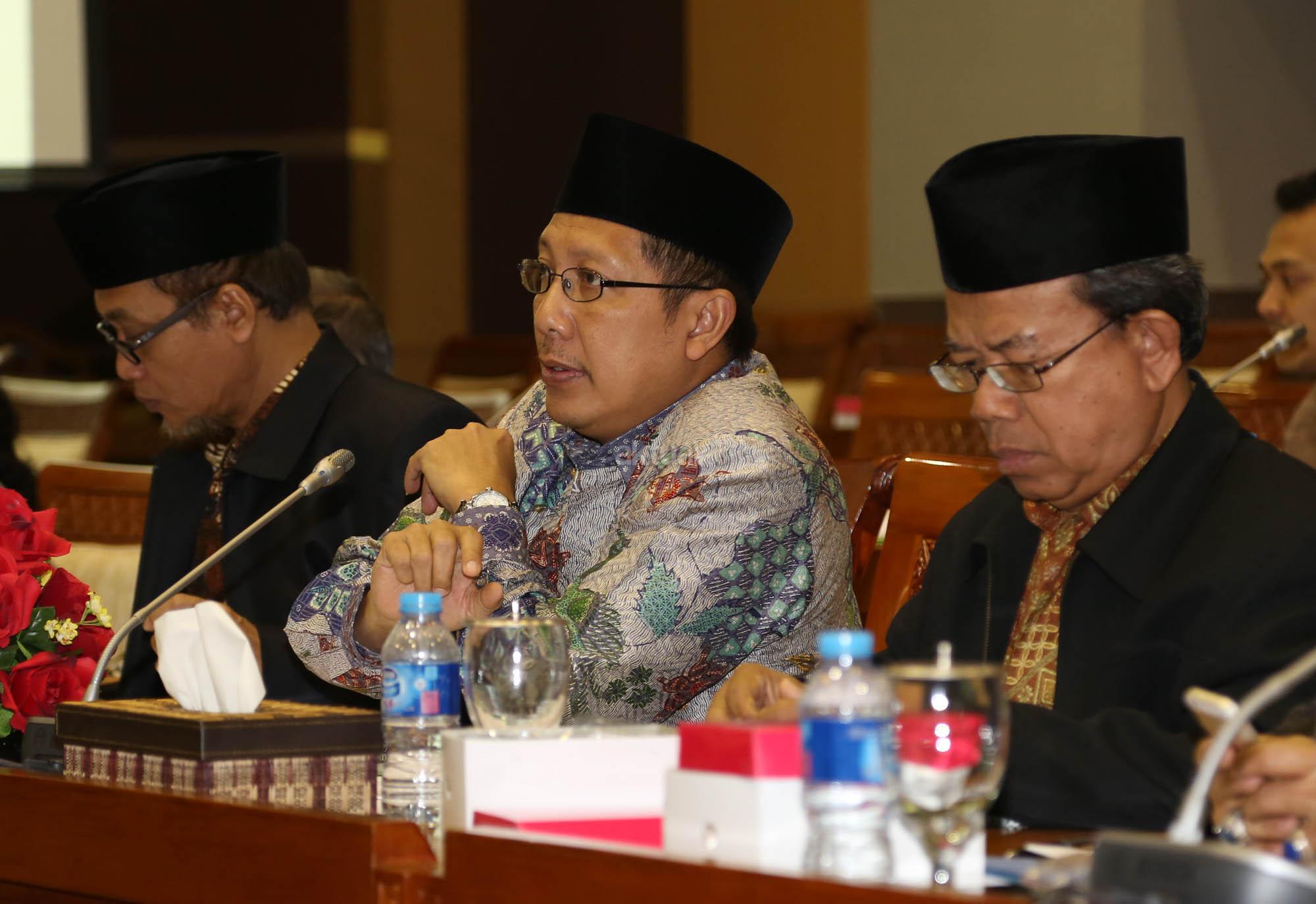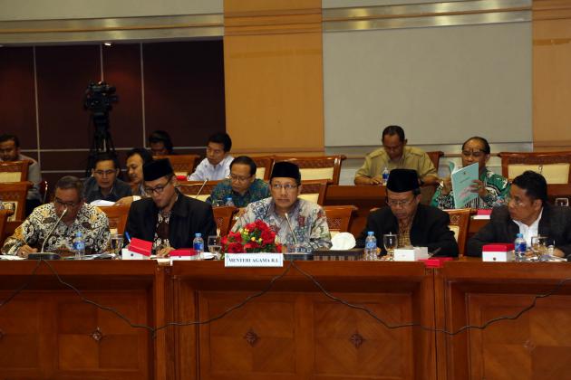 Menteri Agama Lukman Hakim Saifuddin mengikuti rapat kerja dengan Komisi VIII DPR di Kompleks Parlemen, Senayan, Jakarta, Rabu (9/9/2015). Rapat itu membahas Rencana Kerja & Anggaran Kementerian Lembaga (RKAKL) Kemenag Tahun 2016, Ikhtisar hasil pemeriksaan BPK RI semester satu tahun 2015, dan pembahasan pertanggungjawaban pelaksanaan APBN 2014.