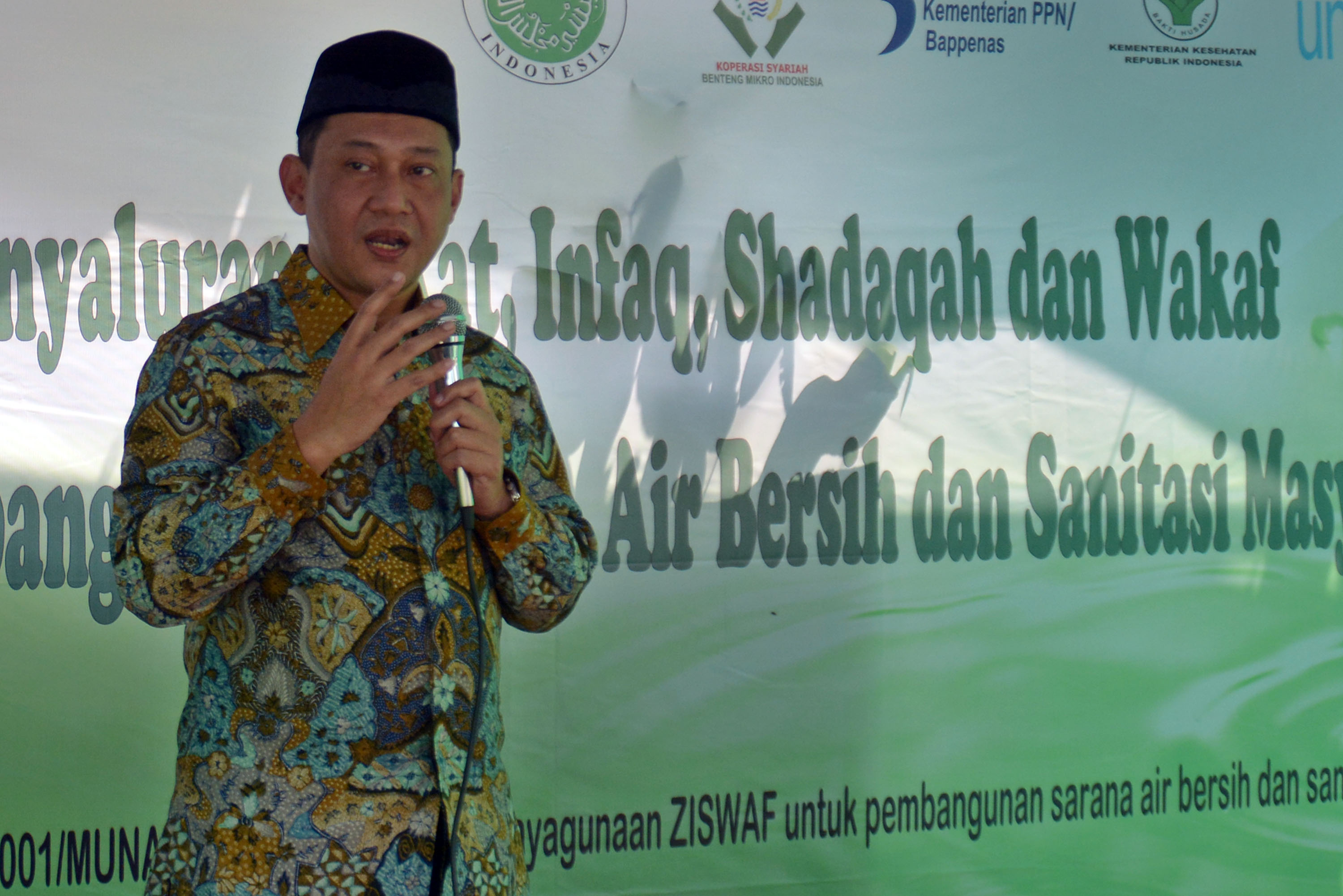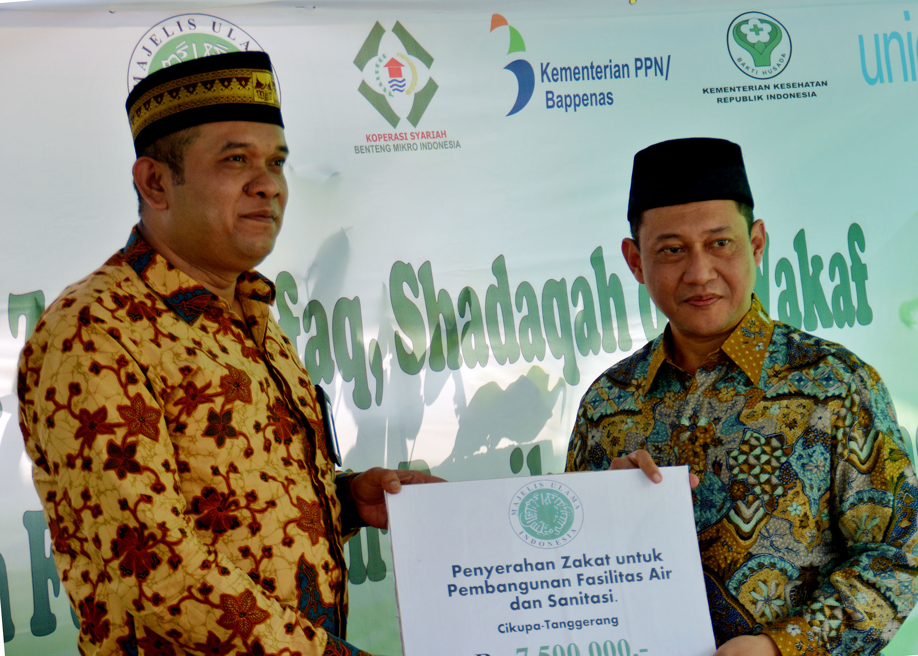 Direktur Penyehatan Lingkungan, Kementrian Kesehatan Imran Agus Nurali (kiri) menyerahkan bantuan kepada Ketua Majelis Ulama Indonesia (MUI) bidang Pemulihan Lingkungan Hidup Dan Sumber Daya Alam, Hayu Prabowo (kanan) saat acara Penyaluran ZISWAF Untuk Pemulian Air Dan Sanitasi di Desa Cikupa, Tangerang, Banten, Kamis (9/1). Salah satu program kesehatan masyarakat adalah pembangunan air dan sanitasi, dalam hal ini Pemerintah Republik Indonesia (RI) telah mengadopsi pendekatan Sanitasi Total Berbasis Masyarakat (STBM). merupakan pendekatan untuk merubah perilaku higienis dan saniter melalui pemberdayaan masyarakat dengan cara pemicuan, untuk mendukung pemenuhan akses air minum dan sanitasi yang berkelanjutan. AKTUAL/IST