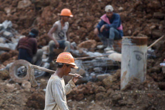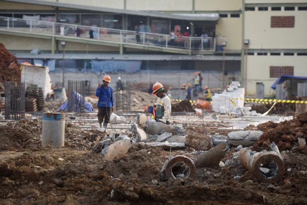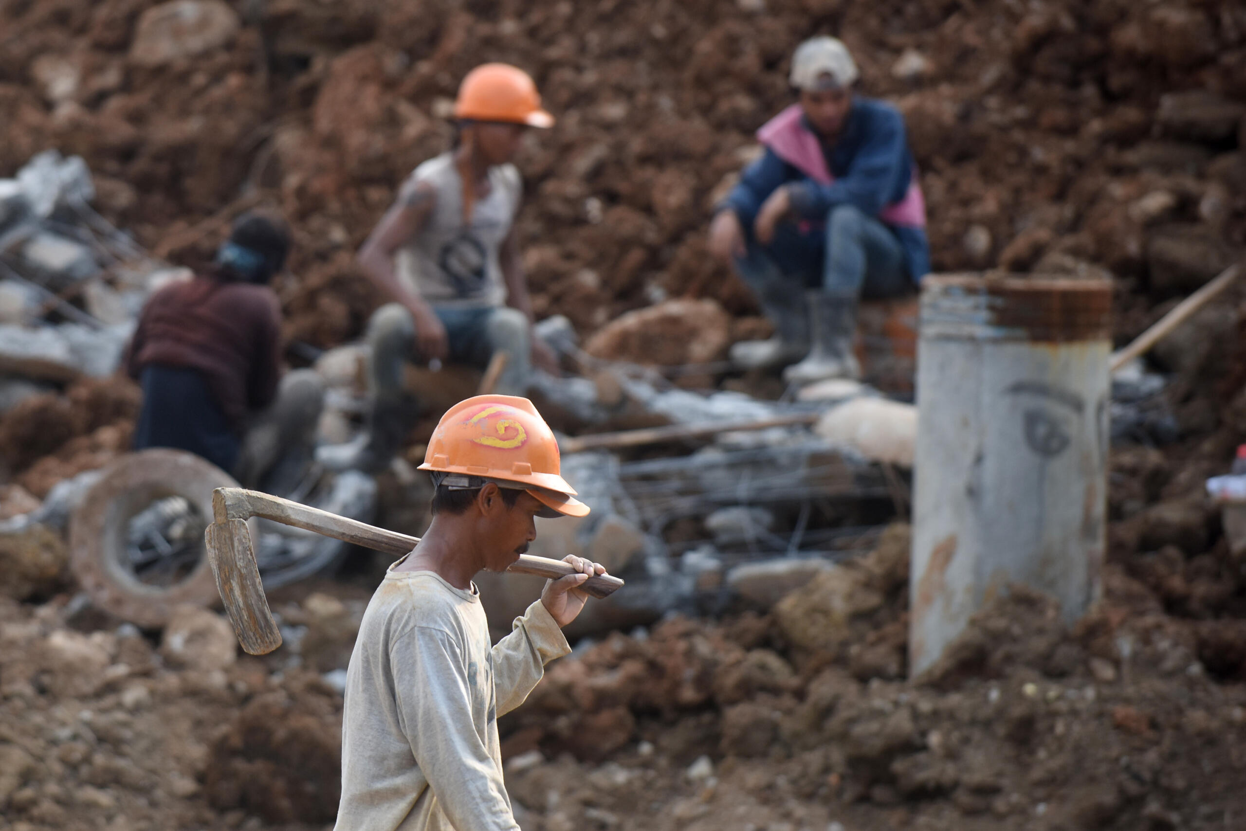 Pekerja membawa cangkul ketika menyelesaikan pembangunan kembali Blok III Pasar Senen yang terbakar pada September 2014 di Jakarta, Kamis (12/5). PD Pasar Jaya melanjutkan kembali pembangunan Blok III Pasar Senen yang sempat terhenti dengan anggaran mencapai Rp300 miliar. ANTARA FOTO/Wahyu Putro A/foc/16.