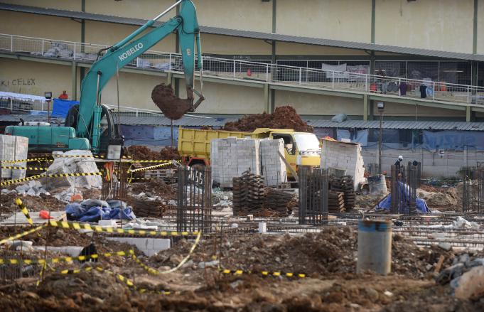 Pekerja menggunakan alat berat menyelesaikan pembangunan kembali Blok III Pasar Senen yang terbekar pada September 2014 di Jakarta, Kamis (12/5). PD Pasar Jaya melanjutkan kembali pembangunan Blok III Pasar Senen yang sempat terhenti dengan anggaran mencapai Rp300 miliar. ANTARA FOTO/Wahyu Putro A/foc/16.