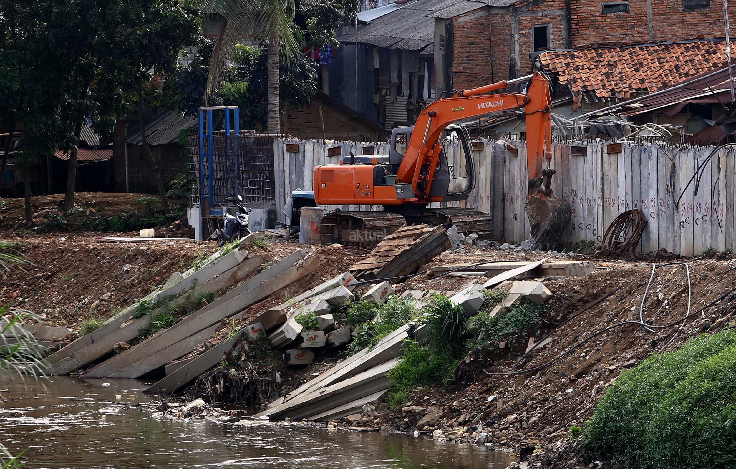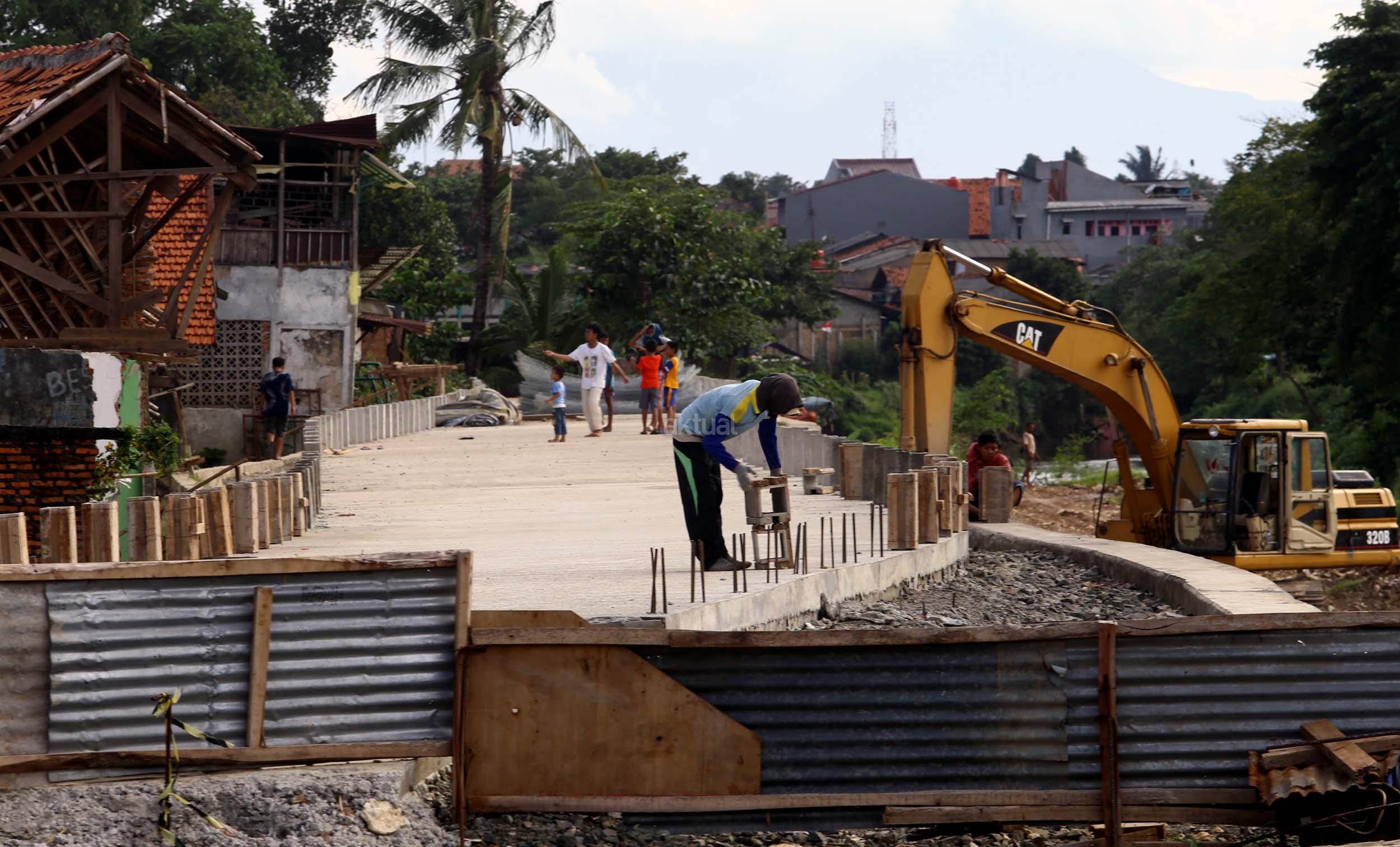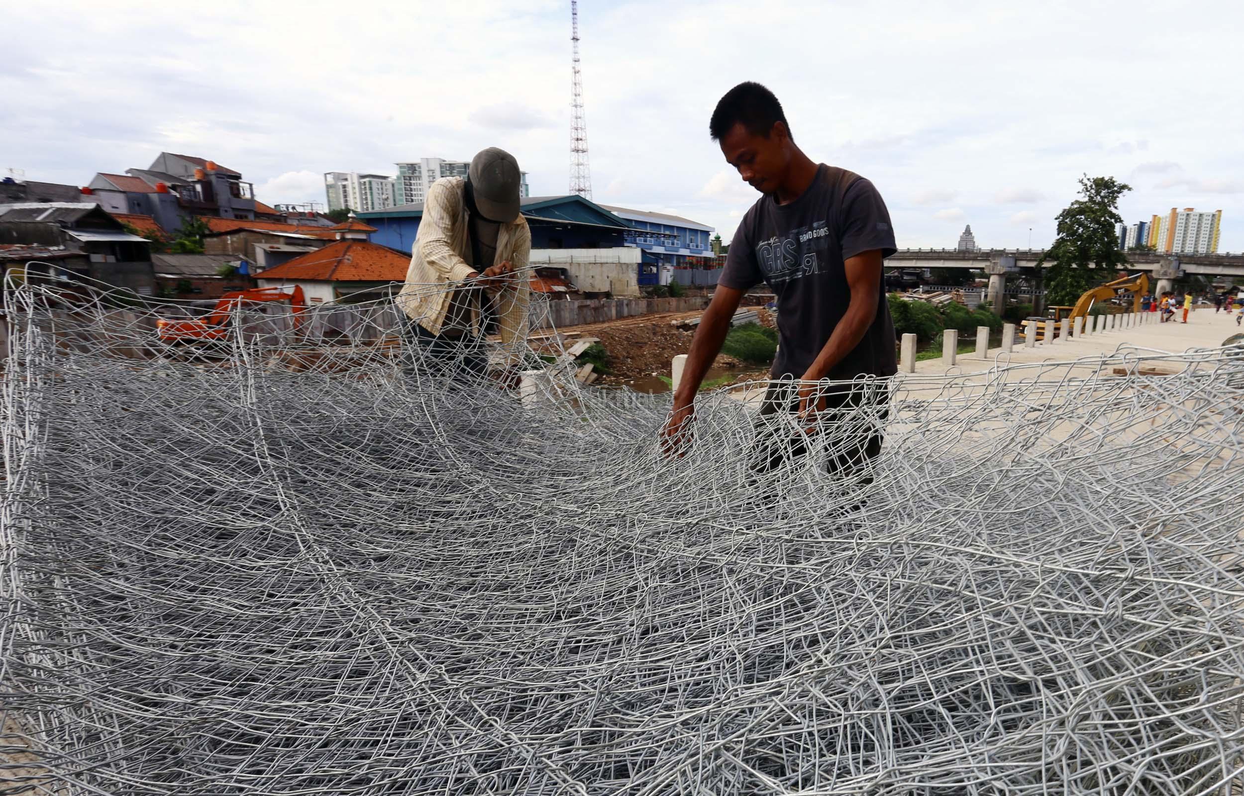 Sejumlah pekerja menyelesaikan proyek jalan inspeksi Sungai Ciliwung di Cililitan Kecil, Jakarta, Jumat (23/12/2016). Pembangunan jalan inspeksi tersebut dilakukan sebagai salah satu solusi mengatasi kemacetan di Ibukota dan normalisasi Sungai Ciliwung. AKTUAL/Munzir