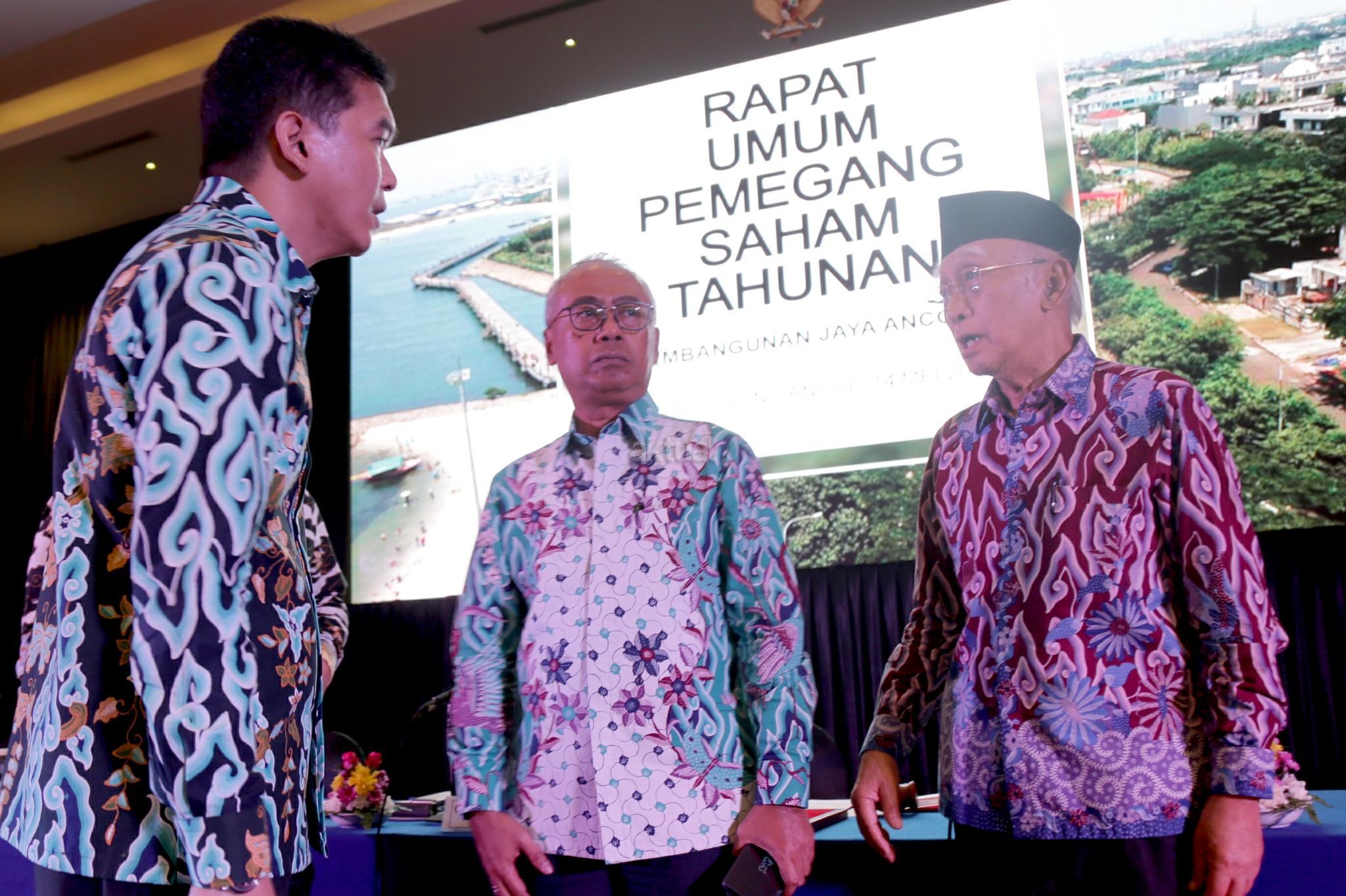 Direktur Utama Paul Tehusijarana (tengah), Komisaris Independen KRMH Daryanto Mangoenpratolo Yosodiningrat, Direktur Independen Daniel Nainggolan (kiri) berbicang usai RUPS PJAA di Jakarta, Senin (14/5/18). Emiten properti dan pengelola kawasan wisata PT Pembangunan Jaya Ancol Tbk. memutuskan untuk membagikan dividen senilai Rp83,2 miliar atau setara 37,78% dari total laba bersih perseroan sepanjang 2017. AKTUAL/Tino Oktaviano