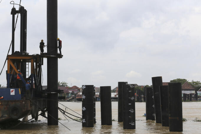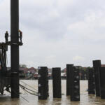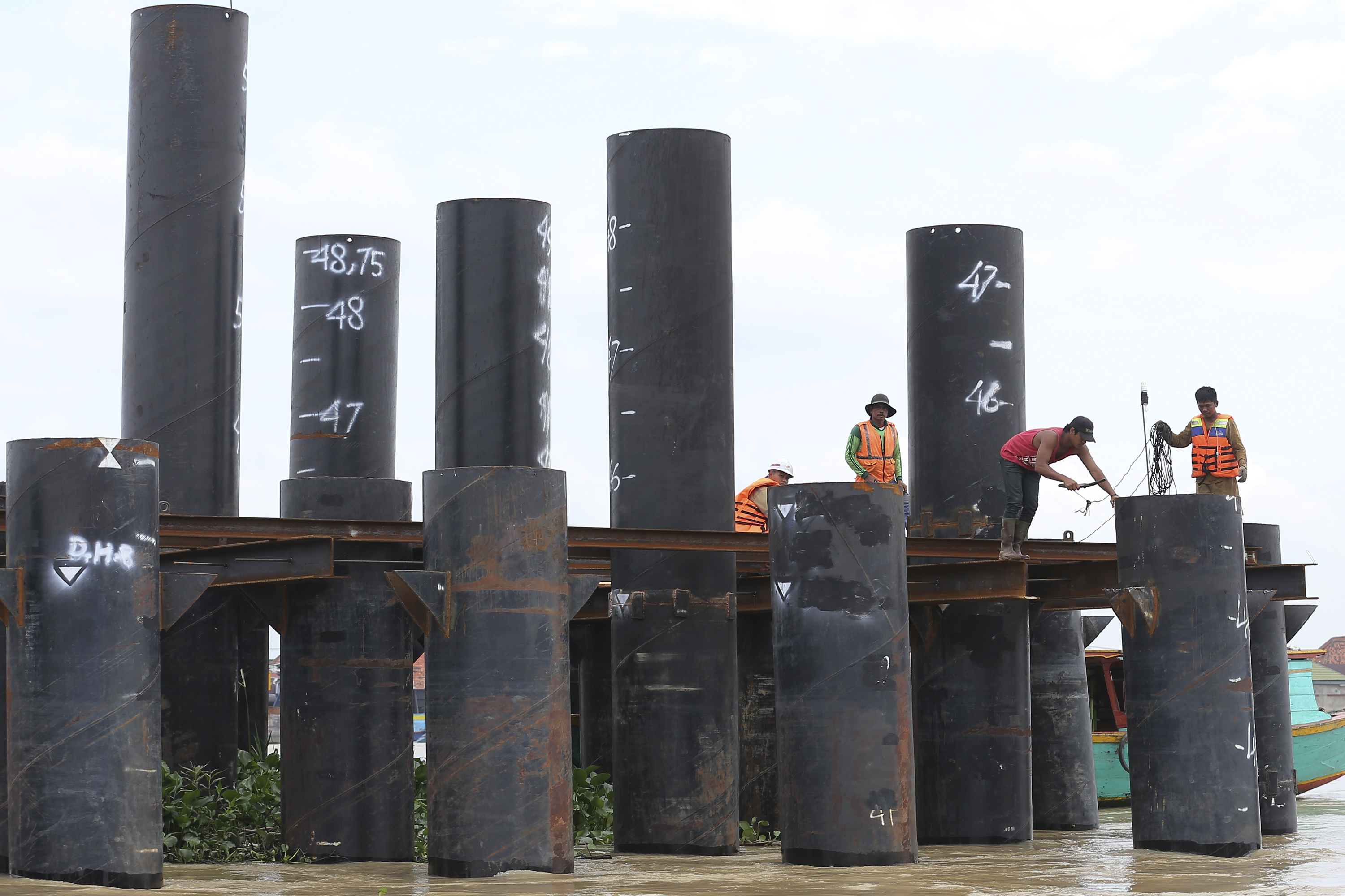 Pekerja melakukan pengerjaan tiang pancang pembangunan jembatan musi VI di tengah sungai Musi Palembang, Sumatera Selatan, Kamis (28/7). Perkembangann pengerjaan Jembatan Musi VI sepanjang 1.117 meter ini berada di kawasan 2 ulu dan 32 Ilir Palembang itu sudah mencapai 20 persen dengan tahap pemasangan tiang pancang di dalam sungai Musi dan ditargetkan dapat selesai 2017 agar dapat menunjang pelaksanaan Asian Games 2018. ANTARA FOTO/Nova Wahyudi/aww/16.