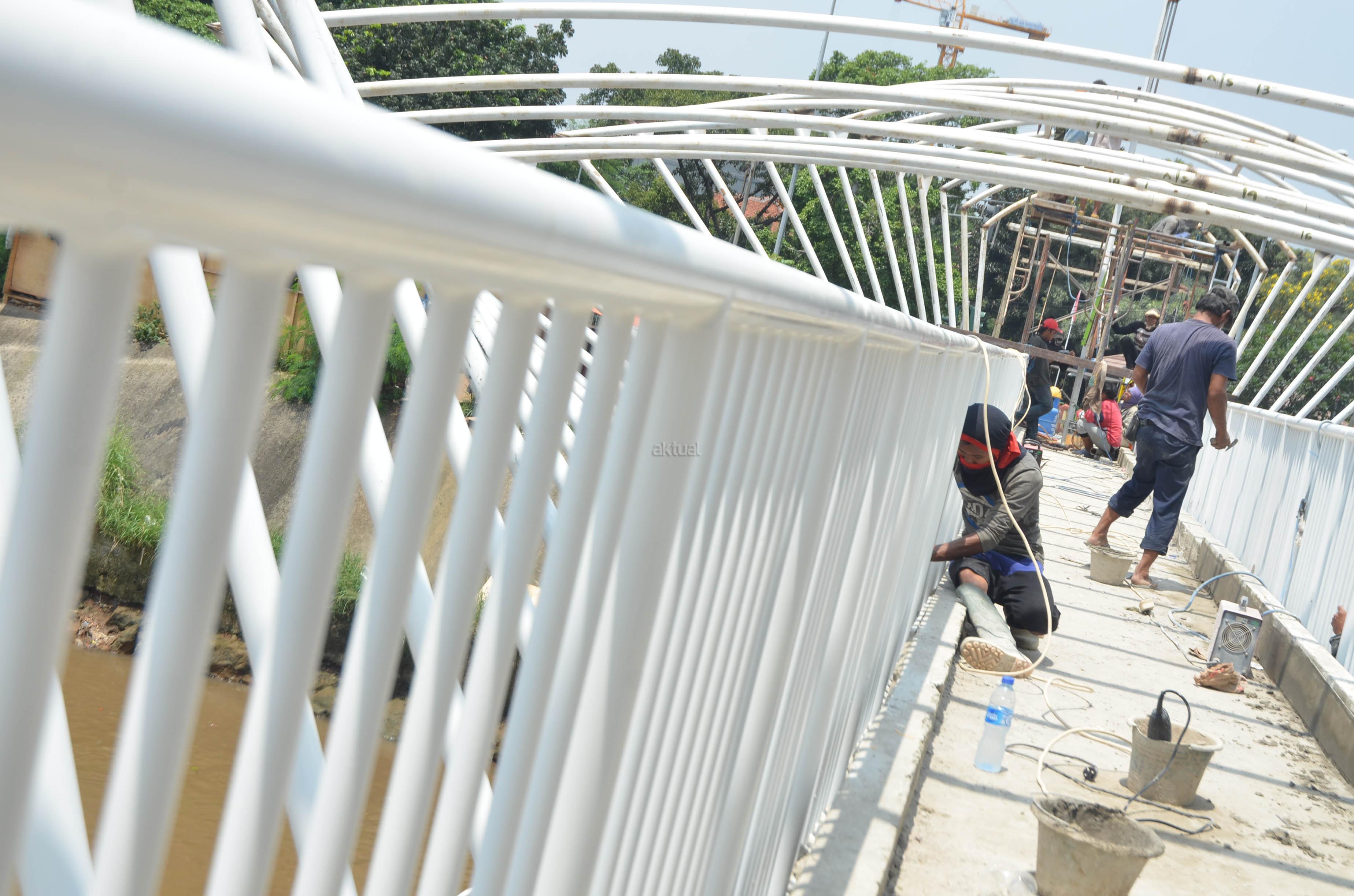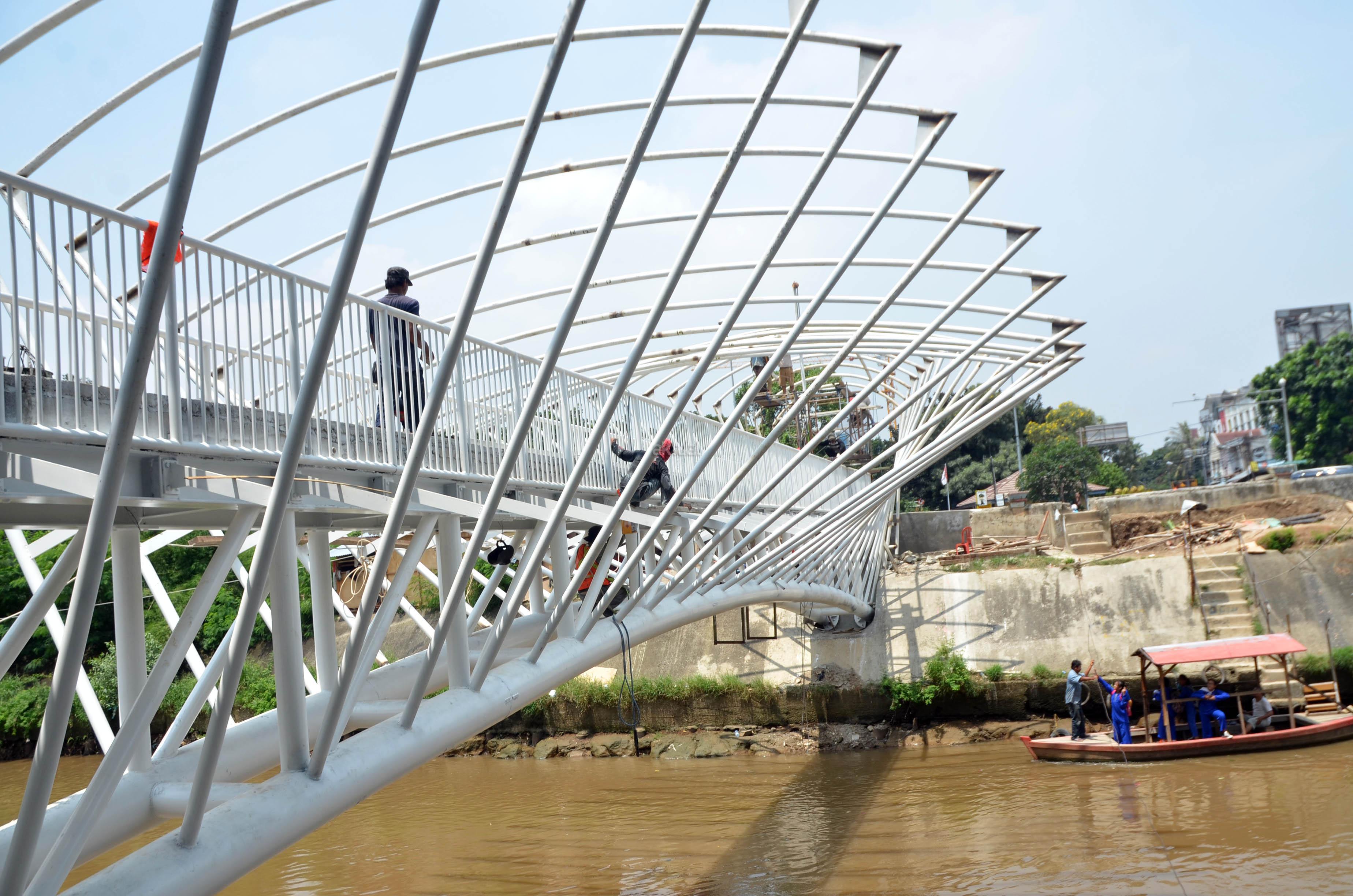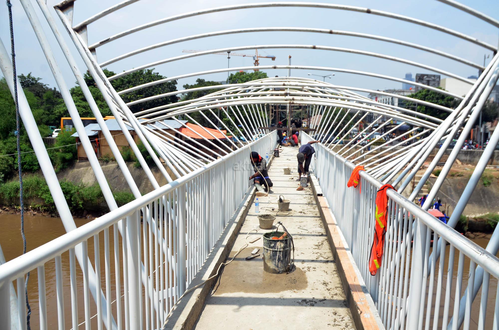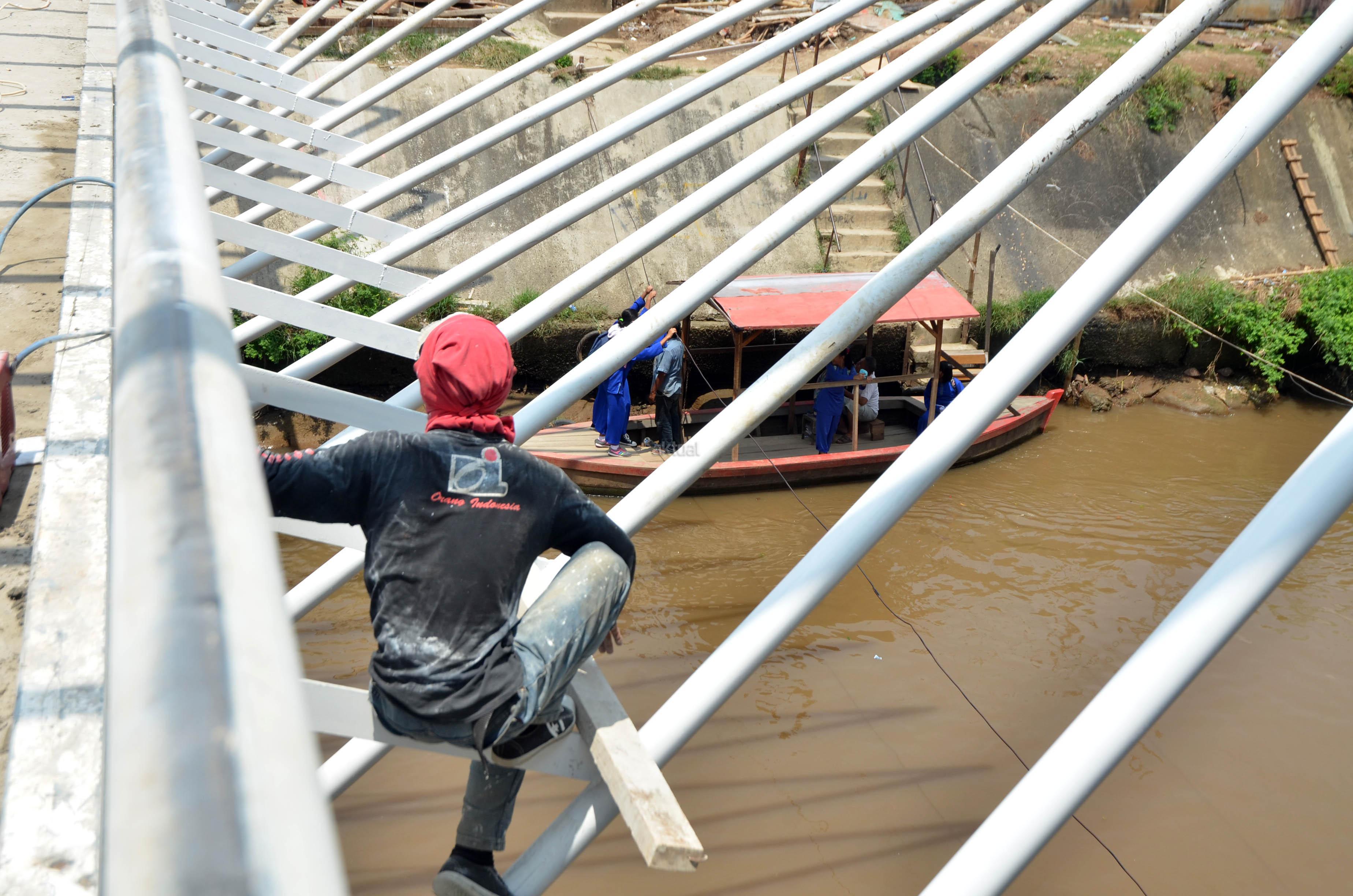 Pekerja menyelesaikan pembangunan jembatan penyeberangan orang (JPO) di atas Sungai Ciliwung di kawasan Manggarai, Jakarta, Kamis (31/3). JPO yang menghubungkan kawasan Menteng Tenggulun dan Manggarai tersebut dibangun untuk menggantikan transportasi perahu eretan yang selama ini digunakan warga. FOTO: AKTUAL/JUNAIDI MAHBUB