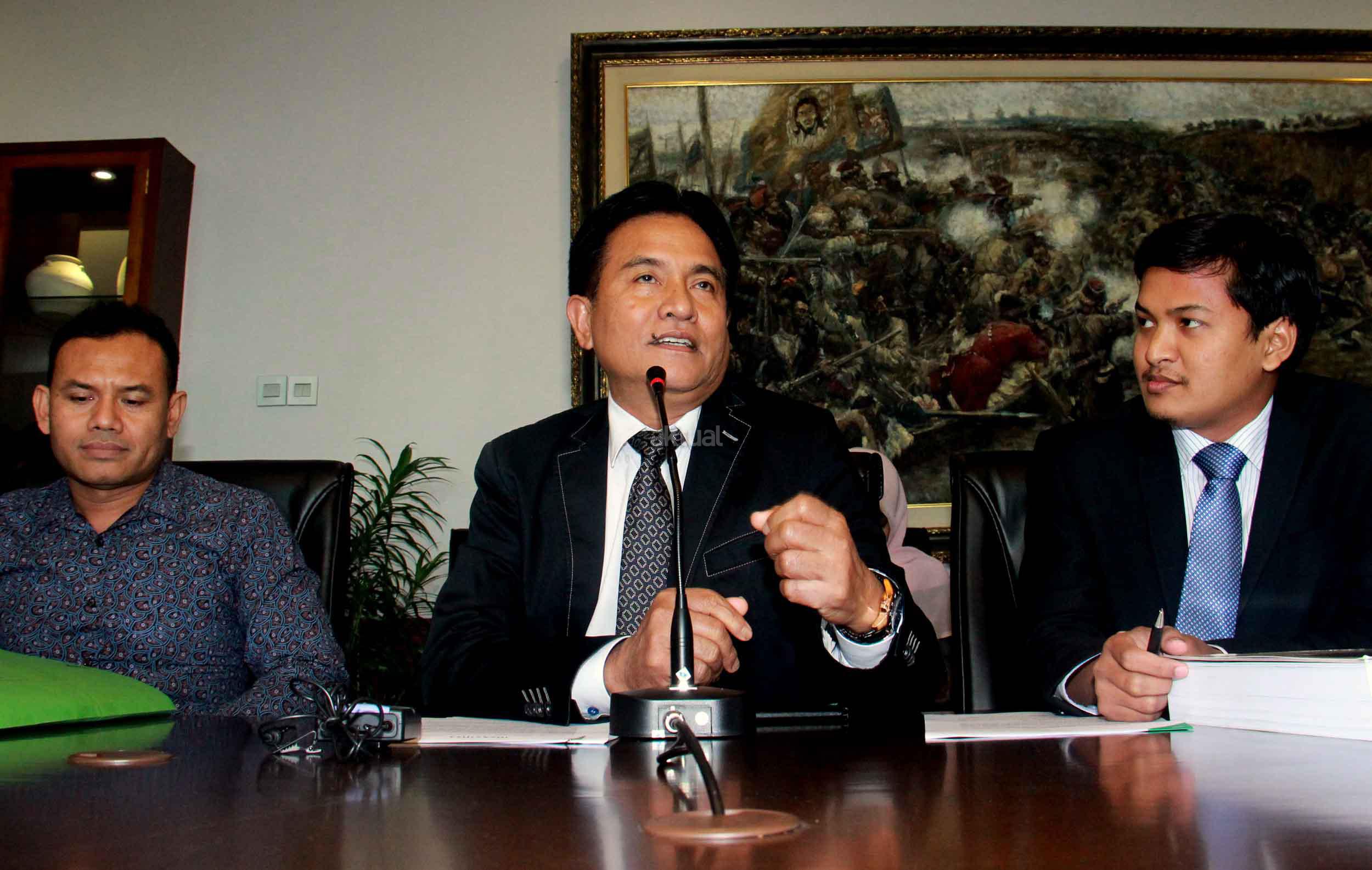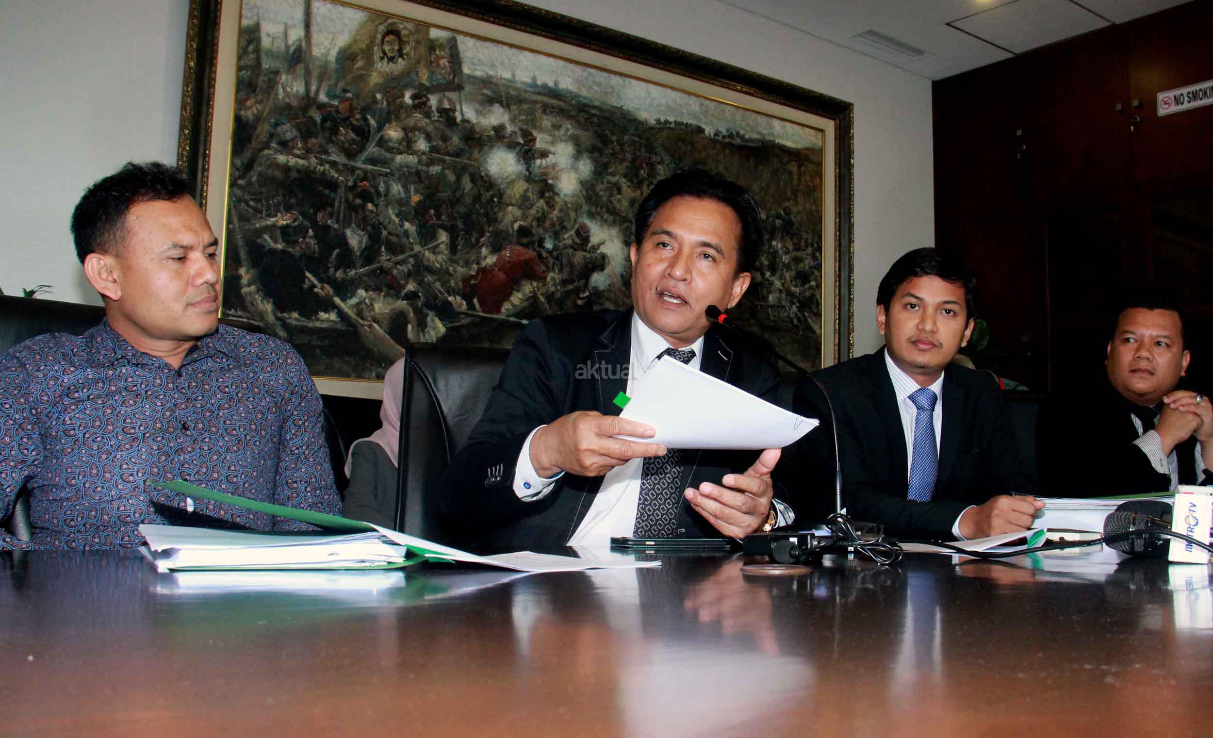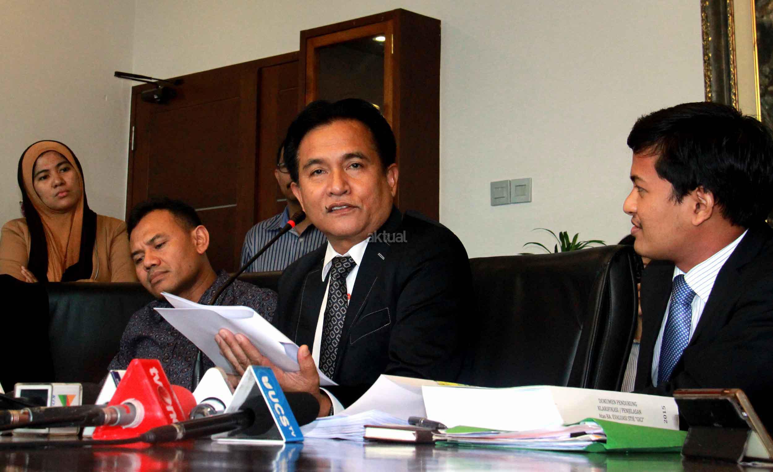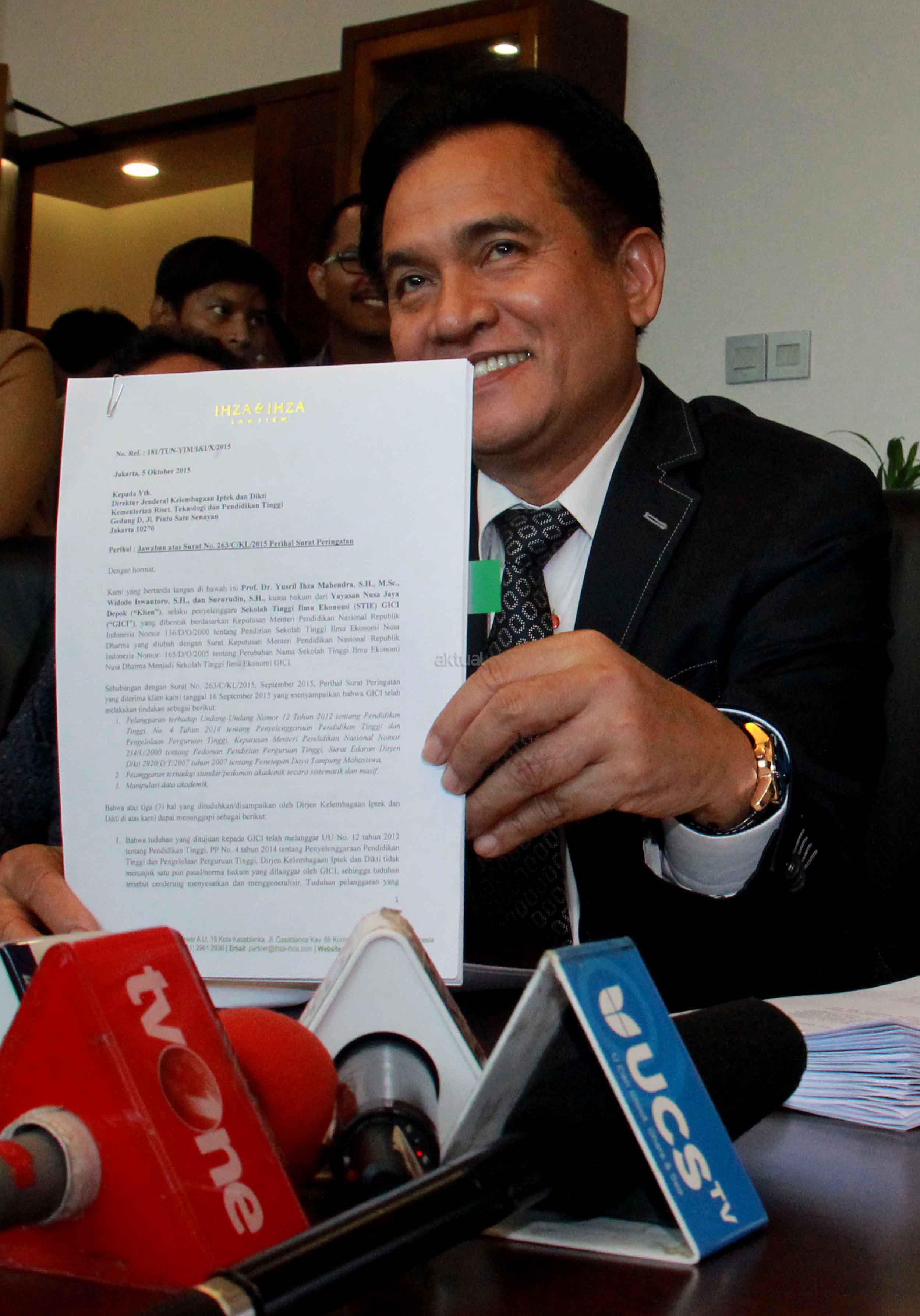Kuasa Hukum untuk STIE GICI Depok Yusril Ihza Mahendra memberikan keterangan pers terkait informasi pembekuan kampus tersebut oleh Kemenristek Dikti di Jakarta, Senin (5/10/2015). Dalam jumpa pers itu Yusril memberikan klarifikasi dan bantahan sekaligus akan memberikan surat jawaban atas adanya peringatan pembekuan STIE GICI yang dinilainya tanpa dasar hukum yang jelas