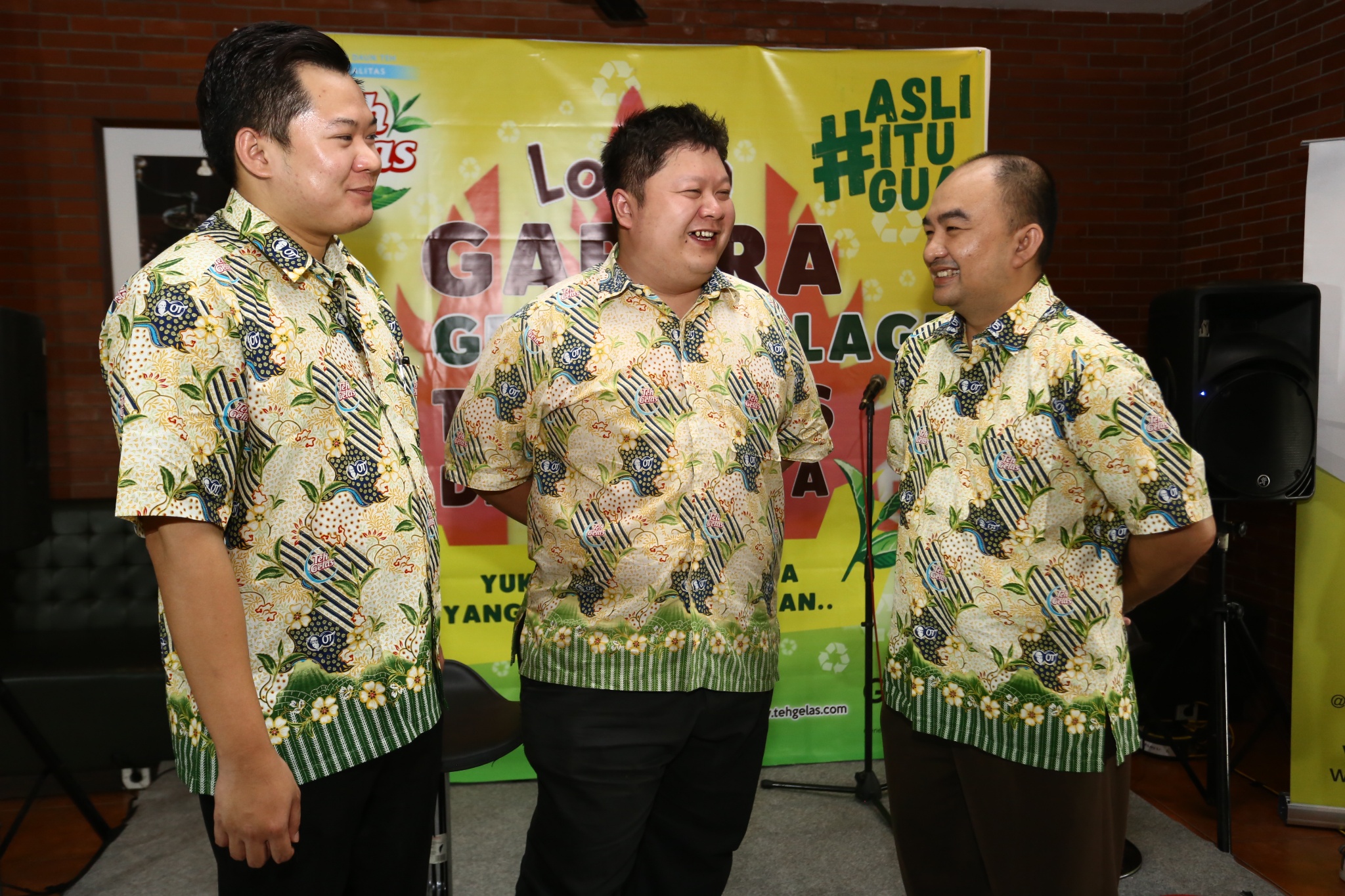 Business Unit Manager Teh Gelas Antonius Haliman (kiri), Managing Director Teh Gelas Sandy Alva (tengah) dan Head of Corporate & Marketing Communication OT Harianus Zebua berbincang disela penyerahan hadiah lomba gapura hias teh gelas go green di Jakarta, Kamis (31/8). Teh Gelas melalui kegiatan lomba gapura hias menyebarkan semangat go green, kreatifitas dan gotong royong. Dalam kesempatan tersebut, juara satu gapura, Jalan 20 Desember RT 04/03 Pegadungan Kali Deres Jakarta Barat. AKTUAL/HO