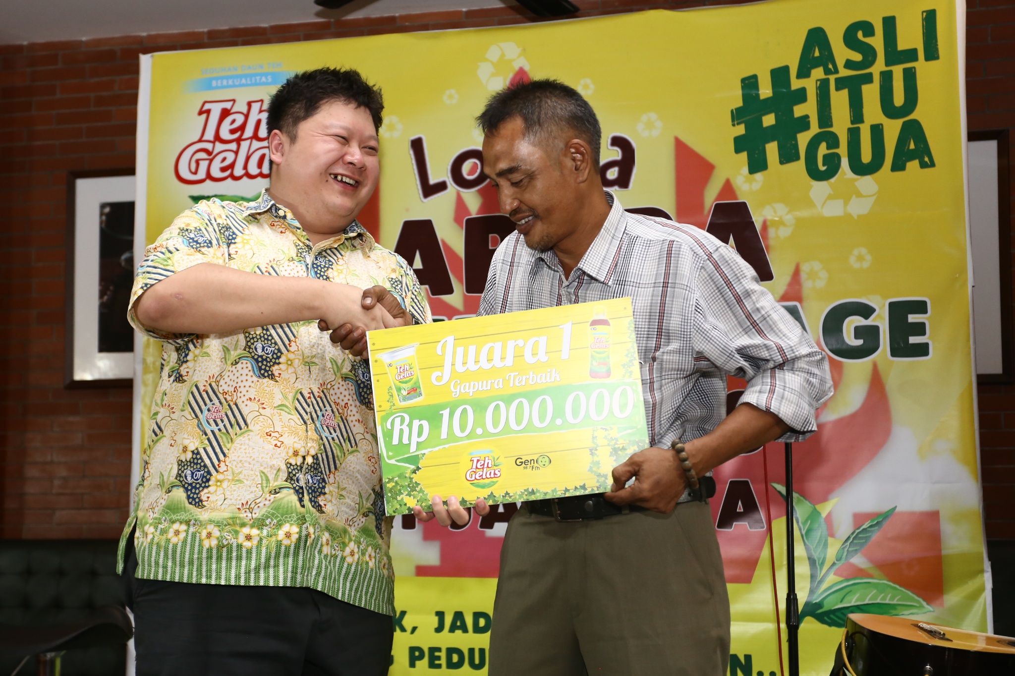 Business Unit Manager Teh Gelas Antonius Haliman (kiri) memberikan hadiah kepada perwakilan juara 1 saat penyerahan hadiah lomba gapura hias teh gelas go green di Jakarta, Kamis (31/8). Teh Gelas melalui kegiatan lomba gapura hias menyebarkan semangat go green, kreatifitas dan gotong royong. Dalam kesempatan tersebut, juara satu gapura, Jalan 20 Desember RT 04/03 Pegadungan Kali Deres Jakarta Barat. AKTUAL/HO