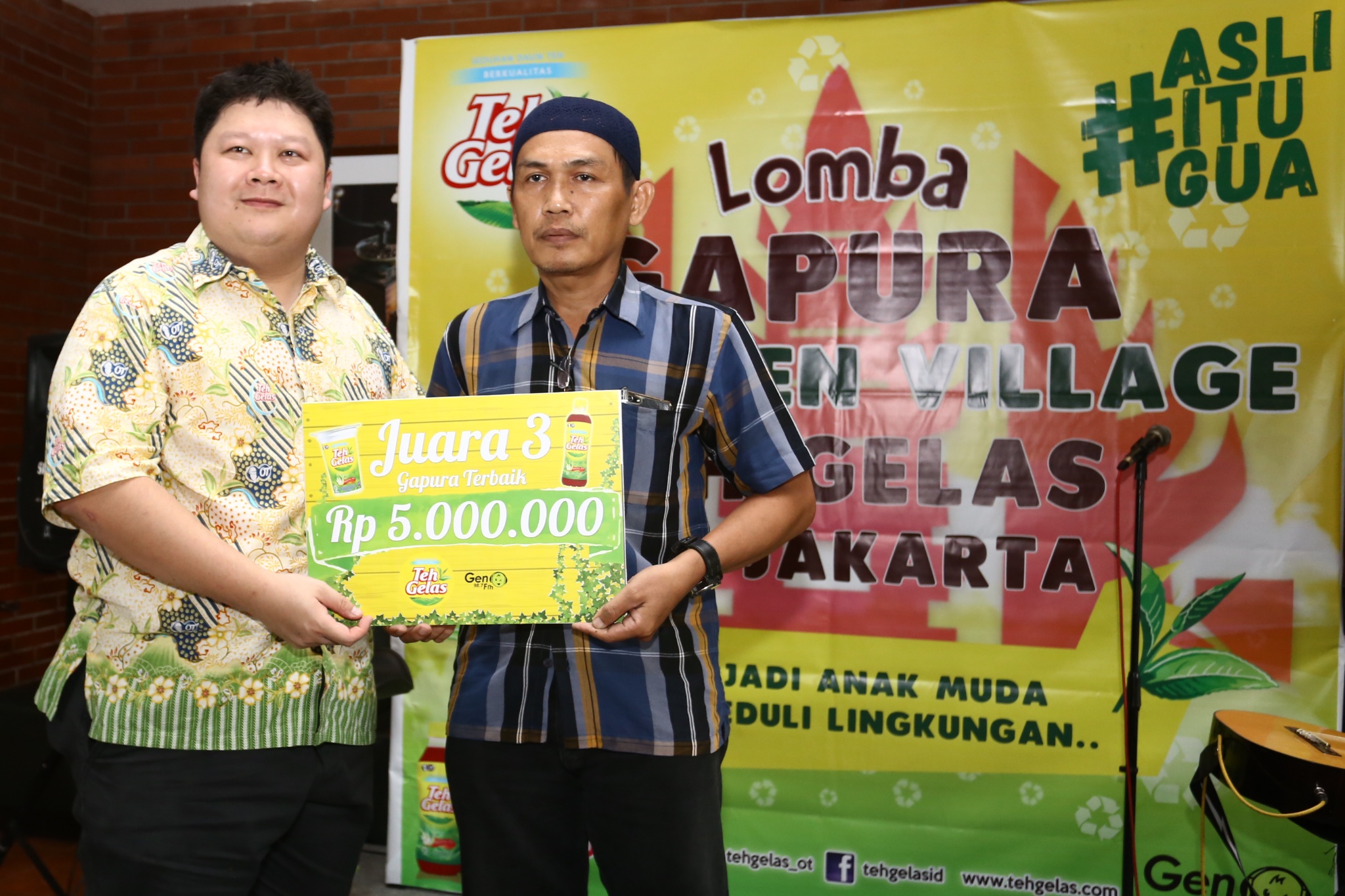 Business Unit Manager Teh Gelas Antonius Haliman (kiri) memberikan hadiah kepada perwakilan juara 3 saat penyerahan hadiah lomba gapura hias teh gelas go green di Jakarta, Kamis (31/8). Teh Gelas melalui kegiatan lomba gapura hias menyebarkan semangat go green, kreatifitas dan gotong royong. Dalam kesempatan tersebut, juara satu gapura, Jalan 20 Desember RT 04/03 Pegadungan Kali Deres Jakarta Barat. AKTUAL/HO