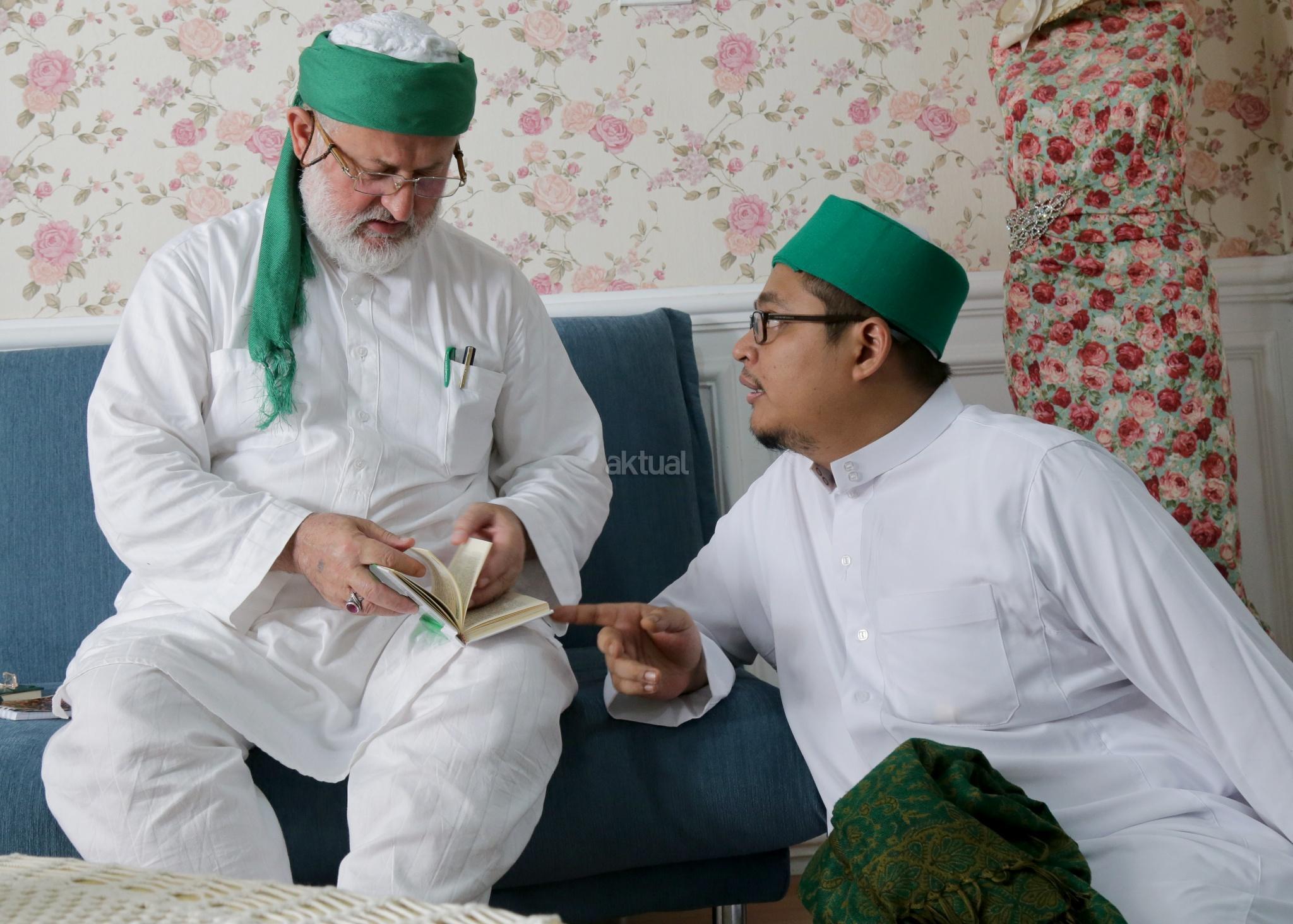 Syekh Dr. Muhammad Fadhil Jaelani al-Hasani (kanan) memberikan ijazah ilmiah kepada Sayyid H Muhammad Danial Nafis di Pondok Pesantren Al Falak, Pegentongan, Bogor, Jawa Barat, Selasa (26/9). Syekh Fadhil secara langsung memberikan ijazah kepada Muhammad Danial Nafis sebagai salah satu khalifah (wakil) Thariqah Qadiriyah di Indonesia. AKTUAL/Tino Oktaviano