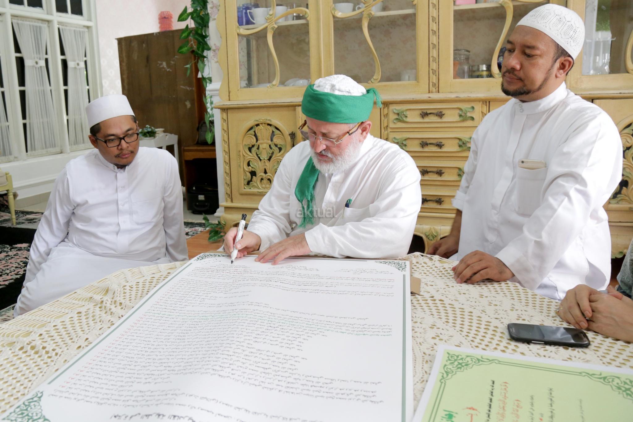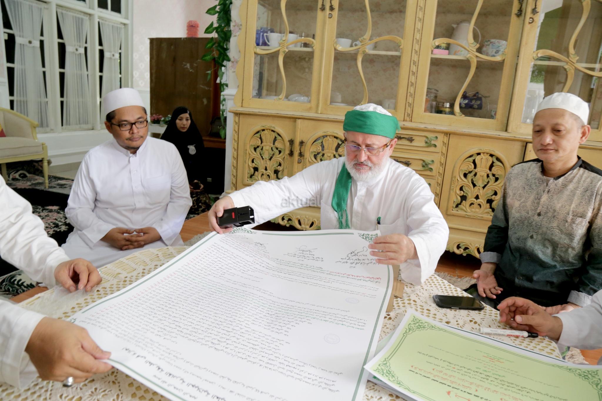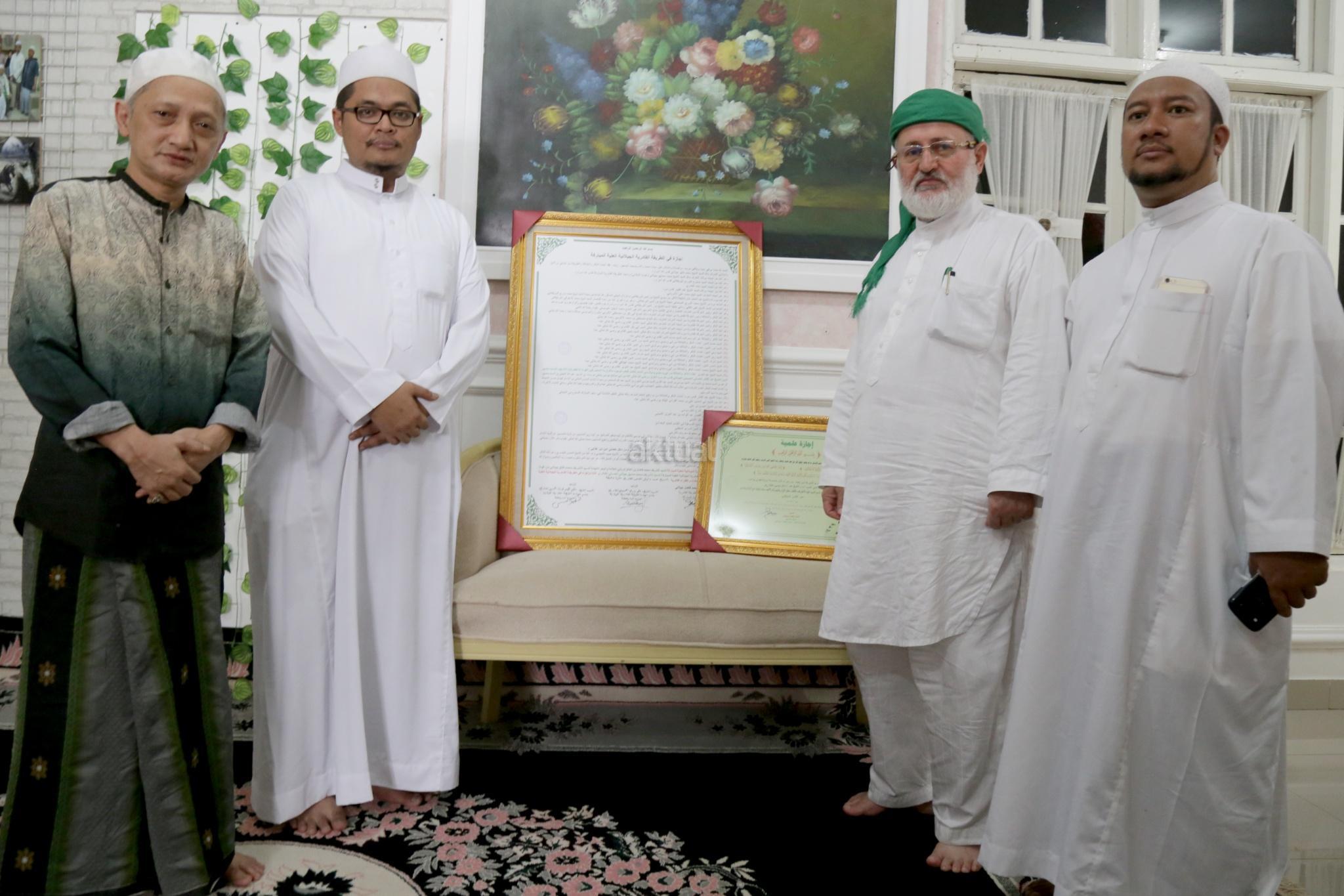 Syekh Dr. Muhammad Fadhil Jaelani al-Hasani menyematkan imamah kepada Sayyid H. Muhammad Danial Nafis dan memberikan ijazah sanad dan penunjukan Khalifah Thoriqoh Qodiriyah dan ijazah ammah kitab karya Syekh Abdul Qodir al-Jaelani. AKTUAL/Tino Oktaviano