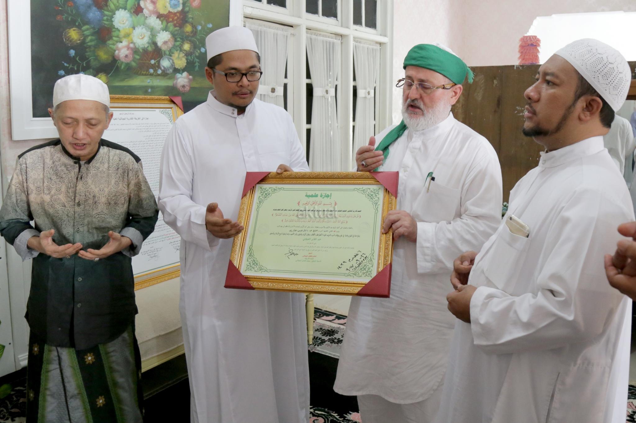 Syekh Dr. Muhammad Fadhil Jaelani al-Hasani (kedua kanan) didampingi Syekh Ali Badri Azmatkhan (kanan) dan Syekh Agus Abdul Hakim (kiri) memberikan ijazah ilmiah kepada Sayyid H Muhammad Danial Nafis di Pondok Pesantren Al Falak, Pegentongan, Bogor, Jawa Barat, Selasa (26/9). Syekh Fadhil secara langsung memberikan ijazah kepada Muhammad Danial Nafis sebagai salah satu khalifah (wakil) Thariqah Qadiriyah di Indonesia. AKTUAL/Tino Oktaviano