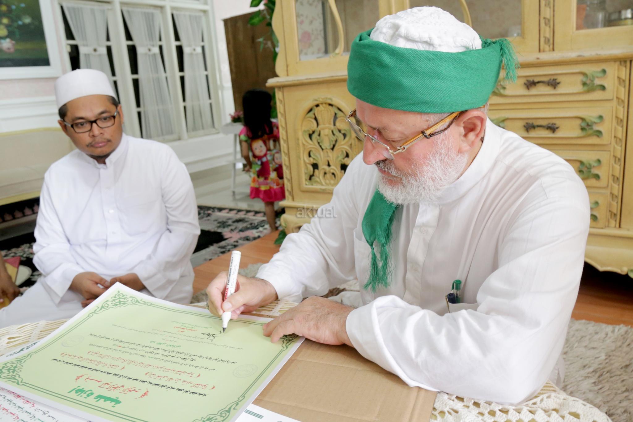 Syekh Dr. Muhammad Fadhil Jaelani al-Hasani memberikan ijazah sanad kepada Sayyid H Muhammad Danial Nafis di Pondok Pesantren Al Falak, Pegentongan, Bogor, Jawa Barat, Selasa (26/9). Syekh Fadhil secara langsung memberikan ijazah kepada Muhammad Danial Nafis sebagai salah satu khalifah (wakil) Thariqah Qadiriyah di Indonesia. AKTUAL/Tino Oktaviano