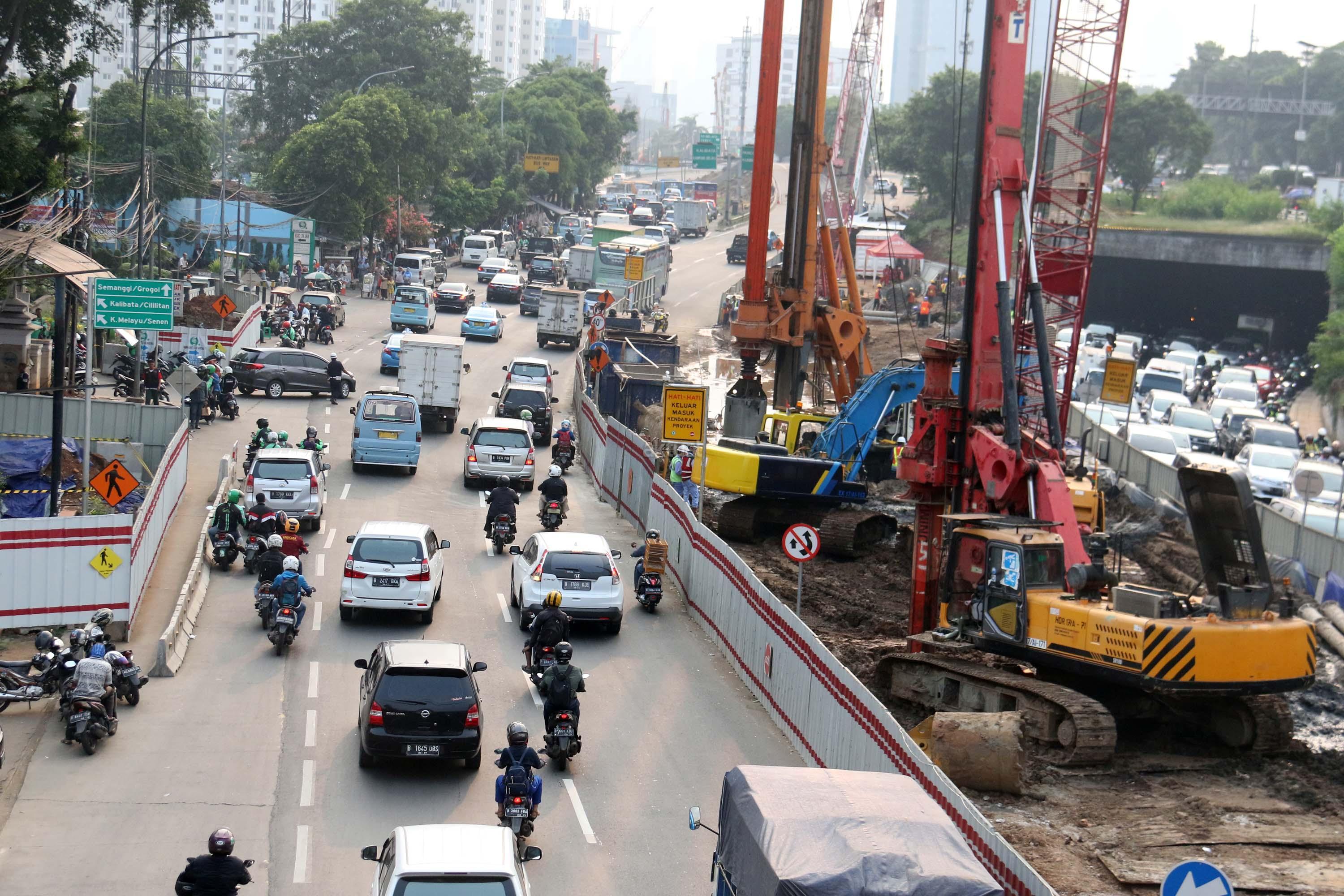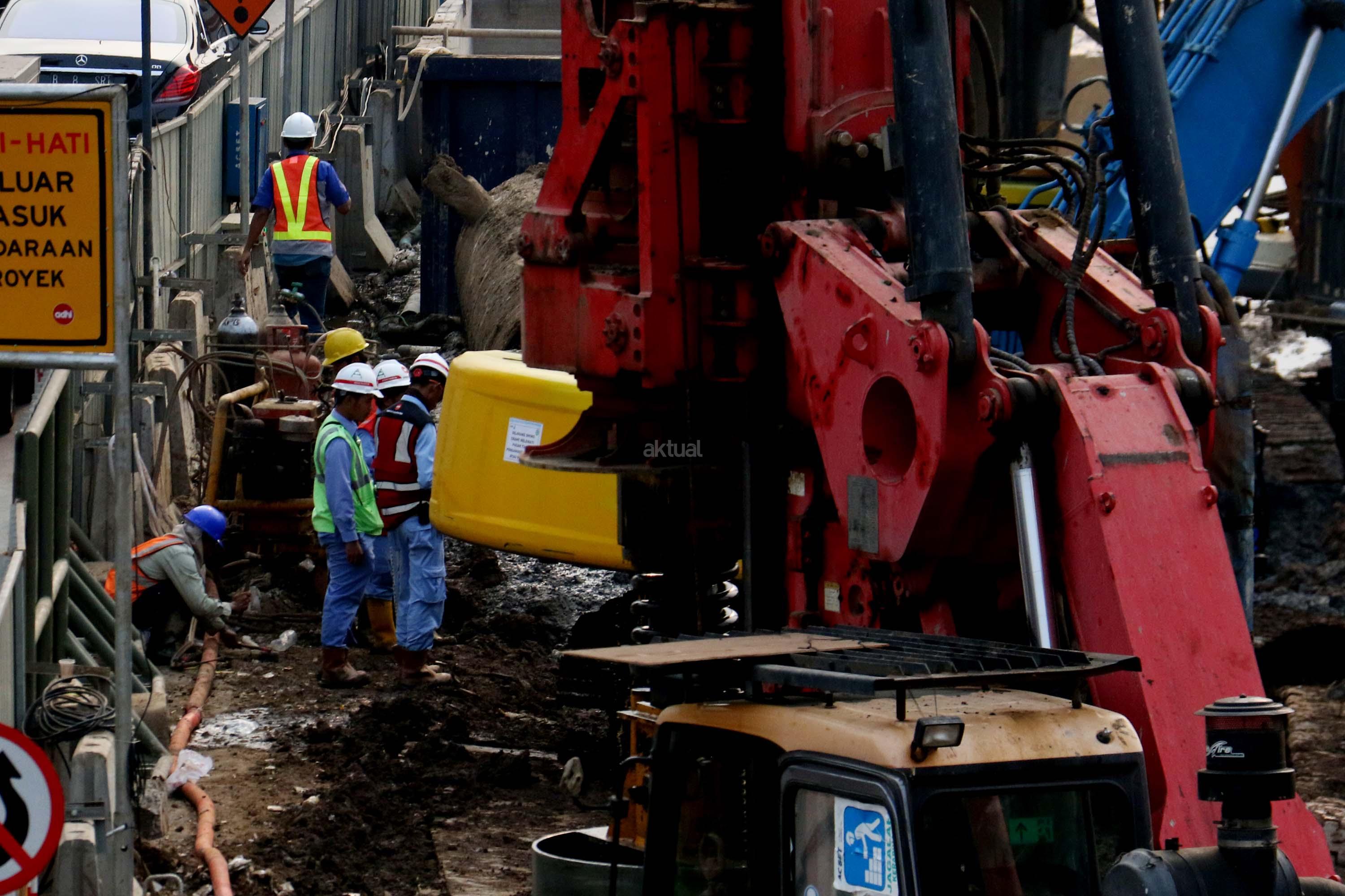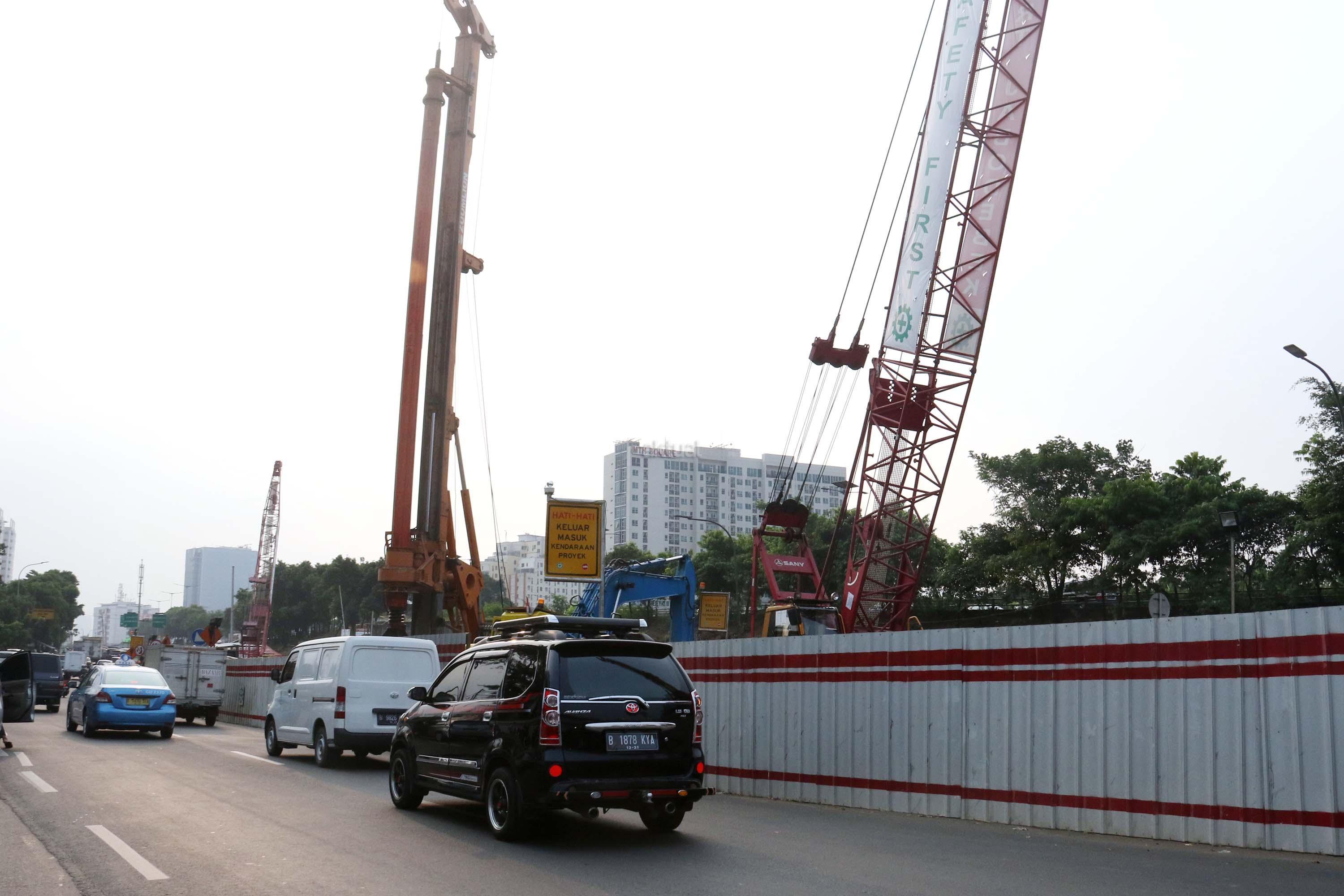 Sejumlah pekerja melakukan pembangunan proyek Light Rail Transit (LRT) Cawang- Dukuh Atas di Jakarta, Rabu (24/5/2017).Proyek Light Rail Transit (LRT) akan mendapat jaminan dari Kementerian Keuangan (Kemenkeu), yaitu proyek tetap berjalan meski pemerintahan berganti, tidak terpengaruh perubahan politik. Jaminan itu tercantum dalam Peraturan Presiden Nomor 49 Tahun 2017 tentang Percepatan Penyelenggaraan LRT terintegrasi di Wilayah Jabodebek dan “Perpres-nya kasih mandat bahwa Kemenkeu boleh melakukan penjaminan untuk KAI dalam pembiayaan LRT. AKTUAL/Munzir