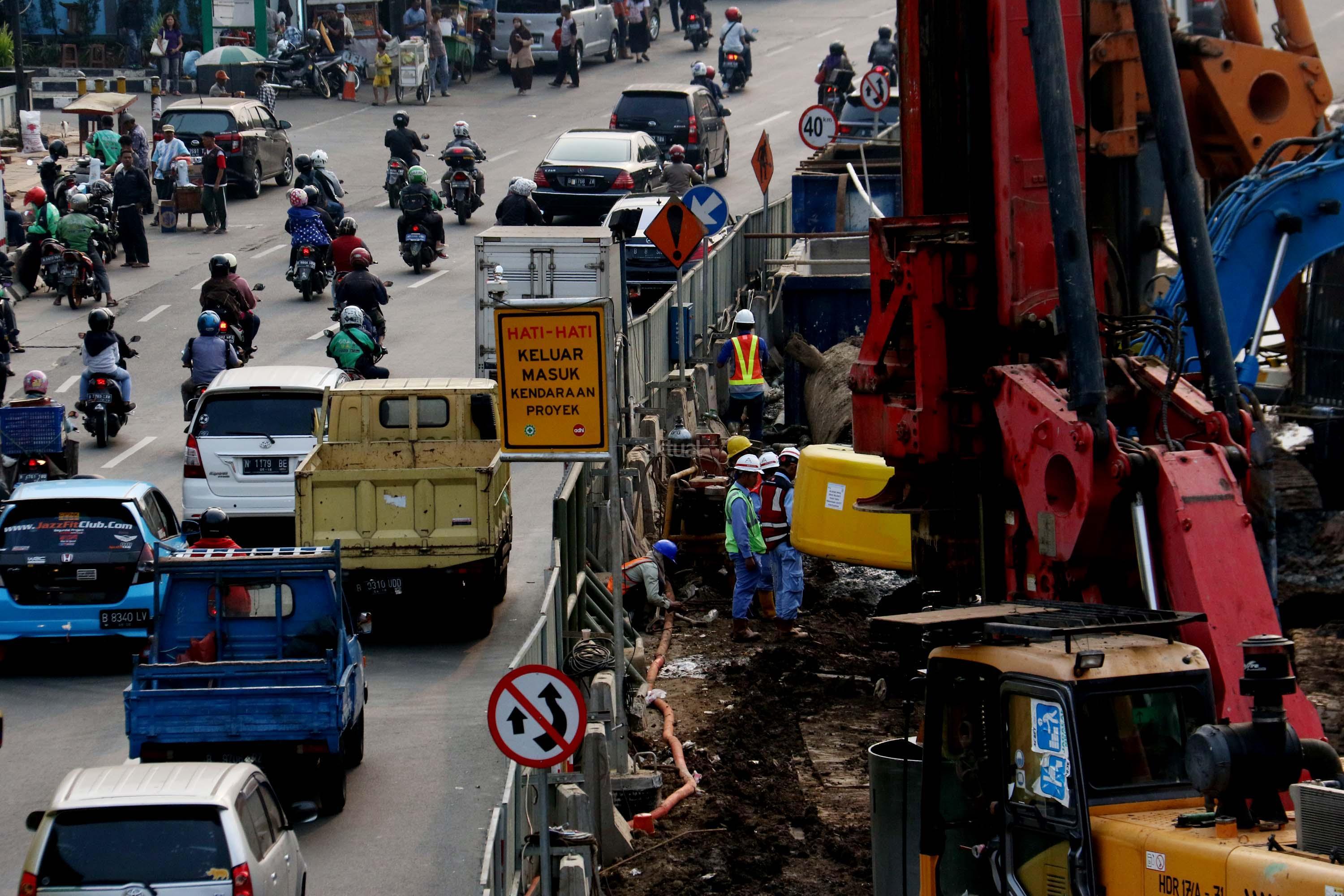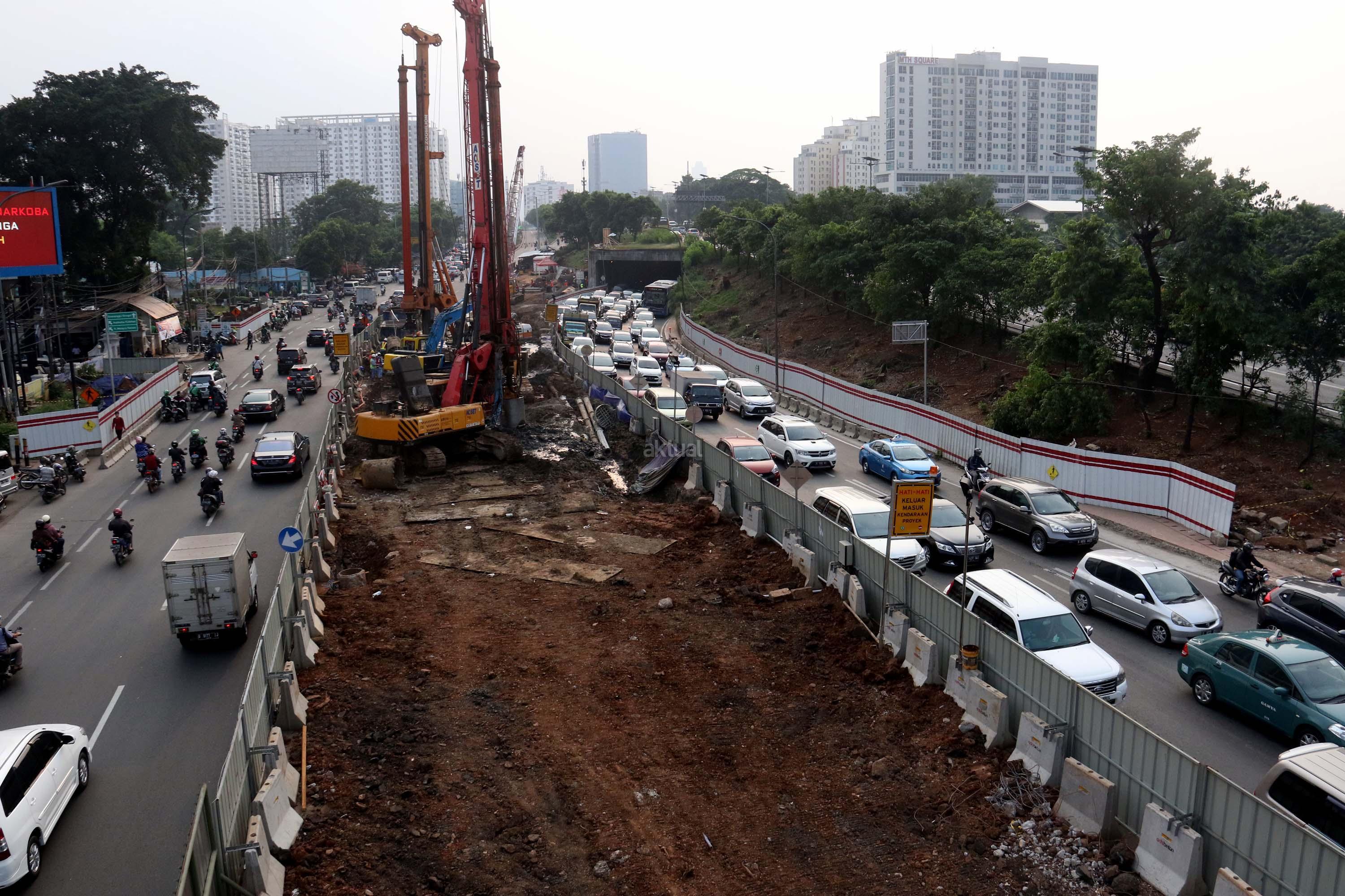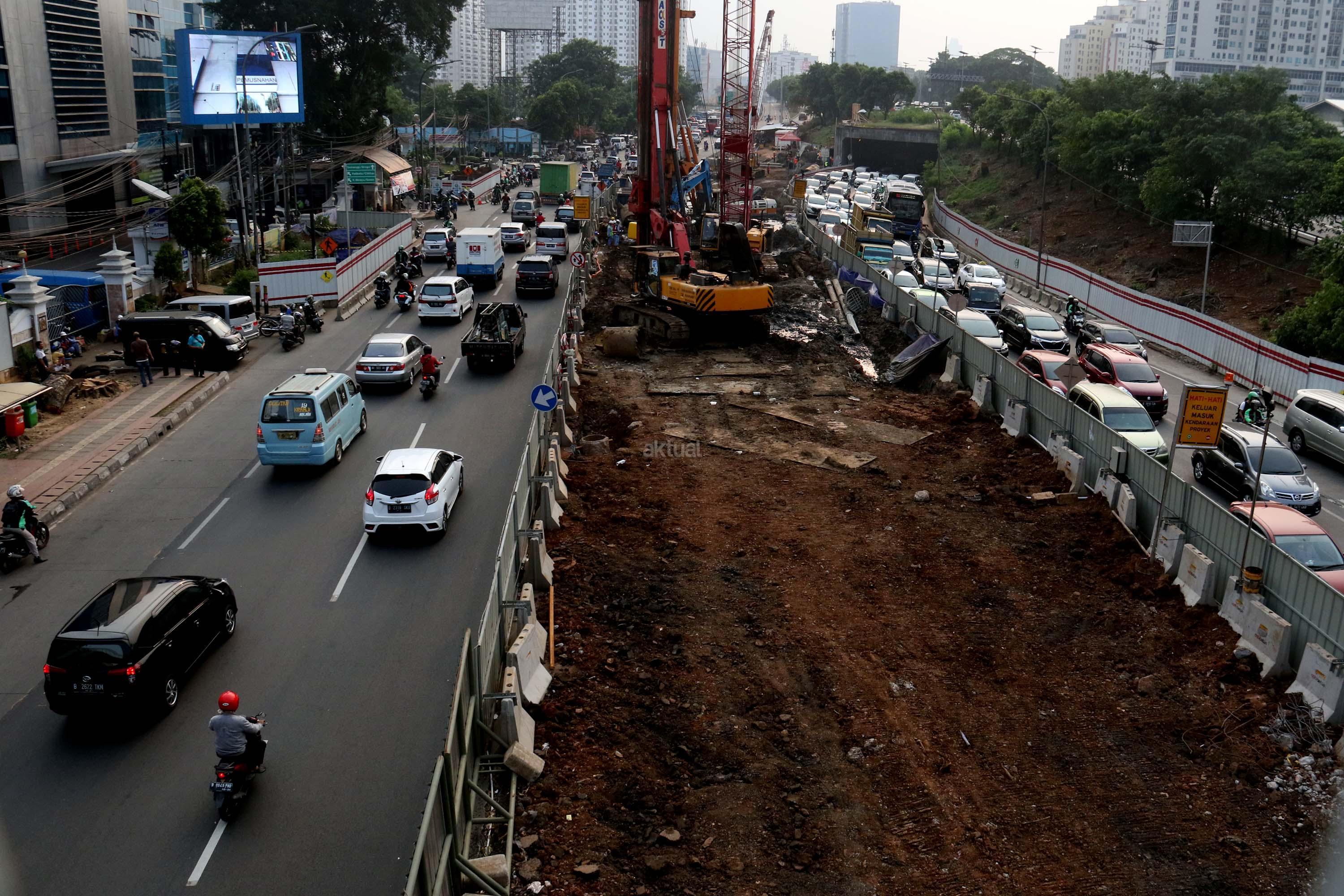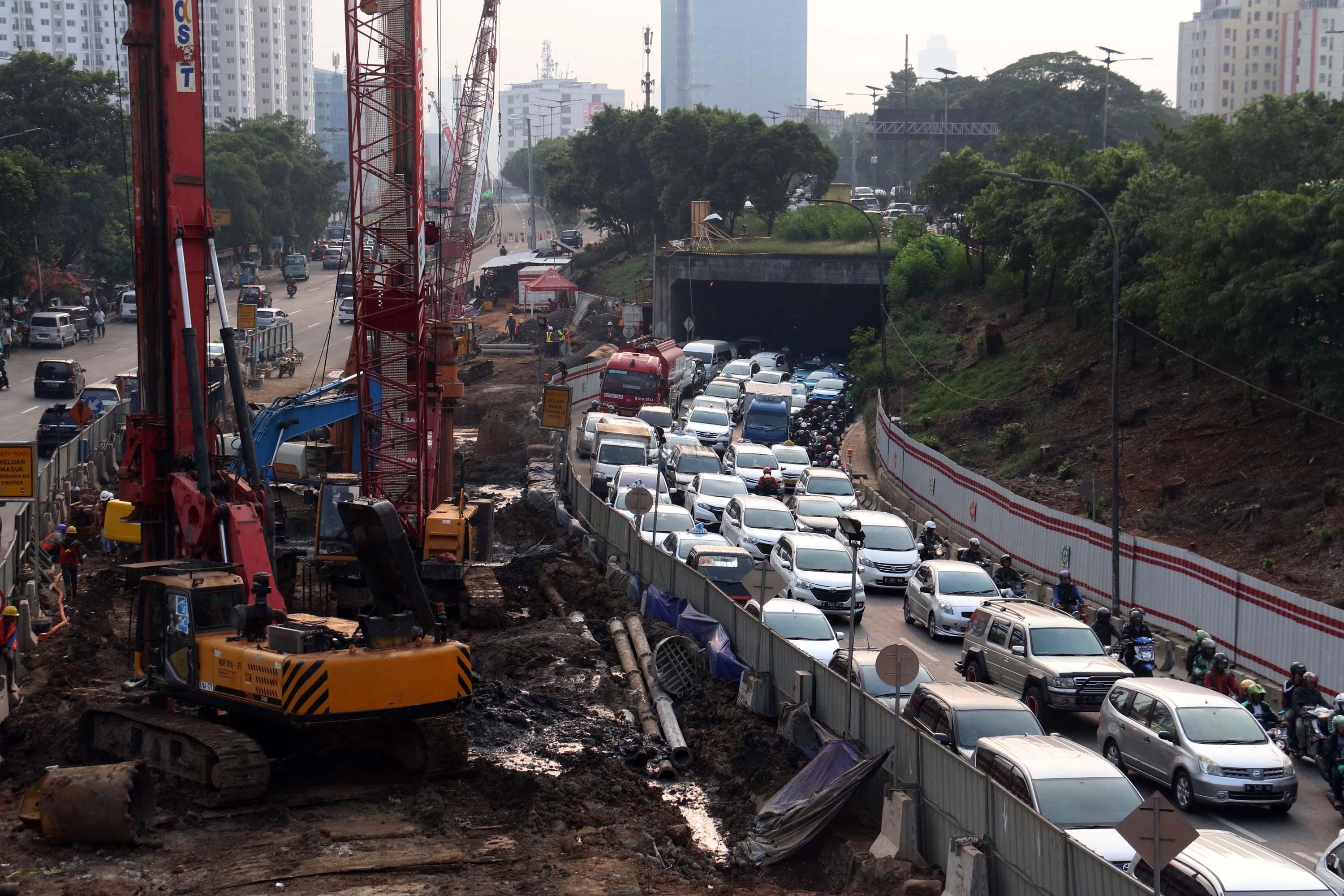 Sejumlah pekerja melakukan pembangunan proyek Light Rail Transit (LRT) Cawang- Dukuh Atas di Jakarta, Rabu (24/5/2017).Proyek Light Rail Transit (LRT) akan mendapat jaminan dari Kementerian Keuangan (Kemenkeu), yaitu proyek tetap berjalan meski pemerintahan berganti, tidak terpengaruh perubahan politik. Jaminan itu tercantum dalam Peraturan Presiden Nomor 49 Tahun 2017 tentang Percepatan Penyelenggaraan LRT terintegrasi di Wilayah Jabodebek dan “Perpres-nya kasih mandat bahwa Kemenkeu boleh melakukan penjaminan untuk KAI dalam pembiayaan LRT. AKTUAL/Munzir