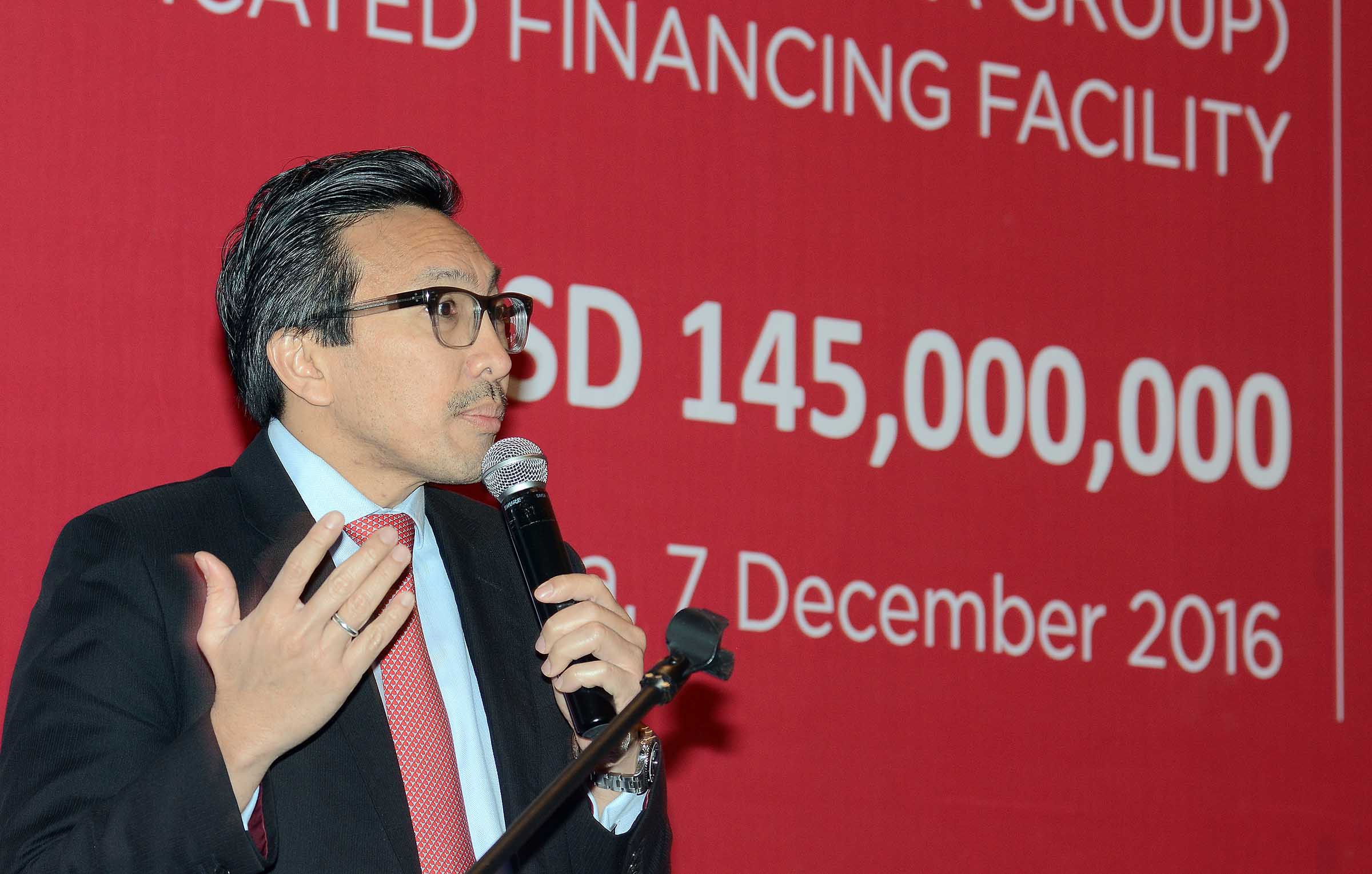 Presdir PT CIMB Niaga Tigor M Siahaan menyampaikan sambutan sebelum menyaksikan penandatangan fasilitas pembiayaan sindikasi PT Bank CIMB Niaga Tbk sebagai Mandated Lead Arrager dan Bookrunner di Jakarta, Rabu (7/12/2016). Sindikasi pembiayaan ini dalam rangka mendukung ekspansi PLTGU Gunung Megang dari 110 MW menjadi 150 MW. AKTUAL/Eko Hilman