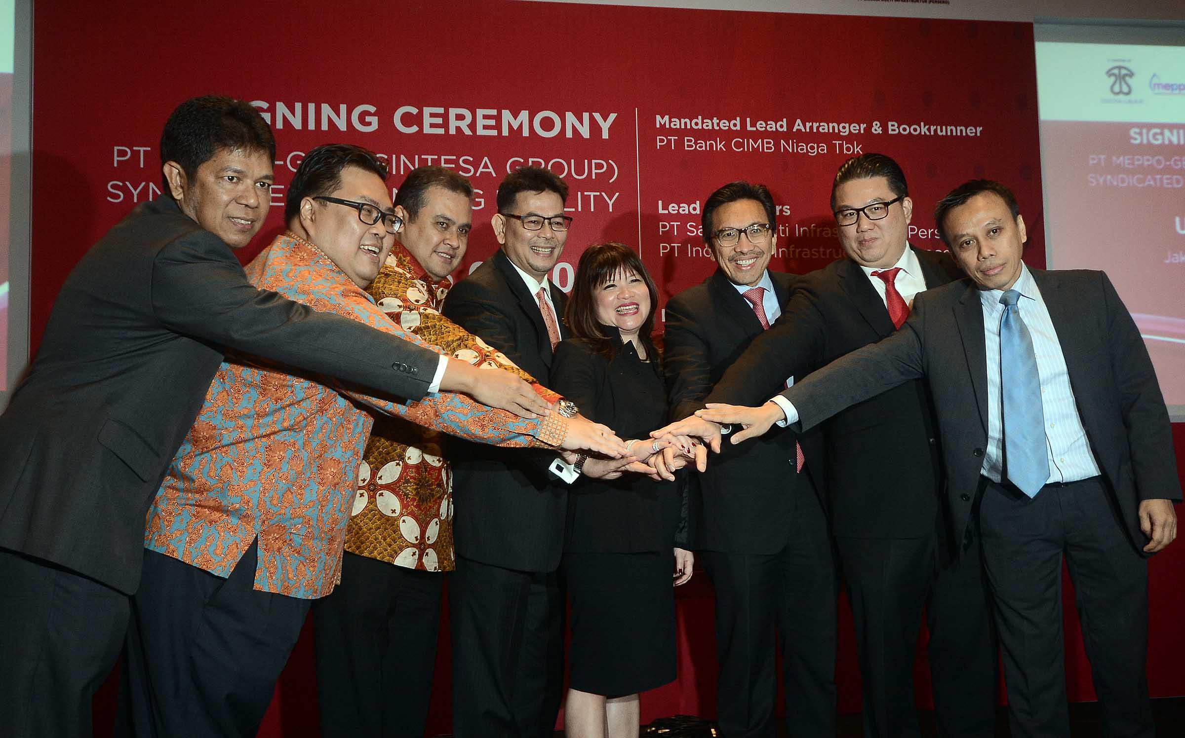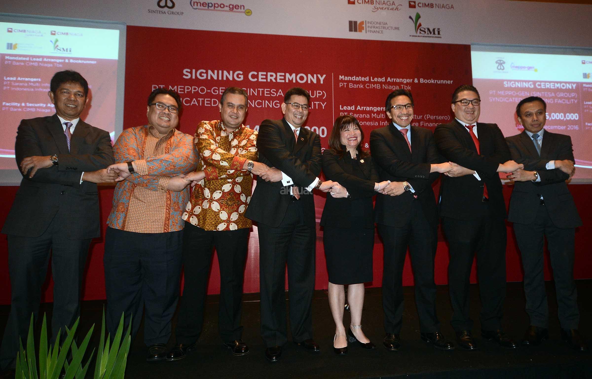 kiri-kanan ; Managing Partner Wahyuni Bahar, Chief Investment Officer PT Indonesia Infrastructure Finance (IIF) Harold Tjiptadjaja, SVP IIF Izmir Fadilah Ifdial, Presiden Direktur PT Meppo Gen Rosar Mamara, CEO Sintesa Group Shinta Widjaja Kamdani, Presdir PT CIMB Niaga Tigor M Siahaan, Chief Corporate Banking PT CIMB Niaga Rusly Johannes, Head of Orgination 3& Syndications PT Sarana Multi Infrastruktur Indar Barung saling bertumpu tangan seusai melakukan penandatangan fasilitas pembiayaan sindikasi PT Bank CIMB Niaga Tbk sebagai Mandated Lead Arrager dan Bookrunner di Jakarta, Rabu (7/12/2016). Sindikasi pembiayaan ini dalam rangka mendukung ekspansi PLTGU Gunung Megang dari 110 MW menjadi 150 MW. AKTUAL/Eko Hilman