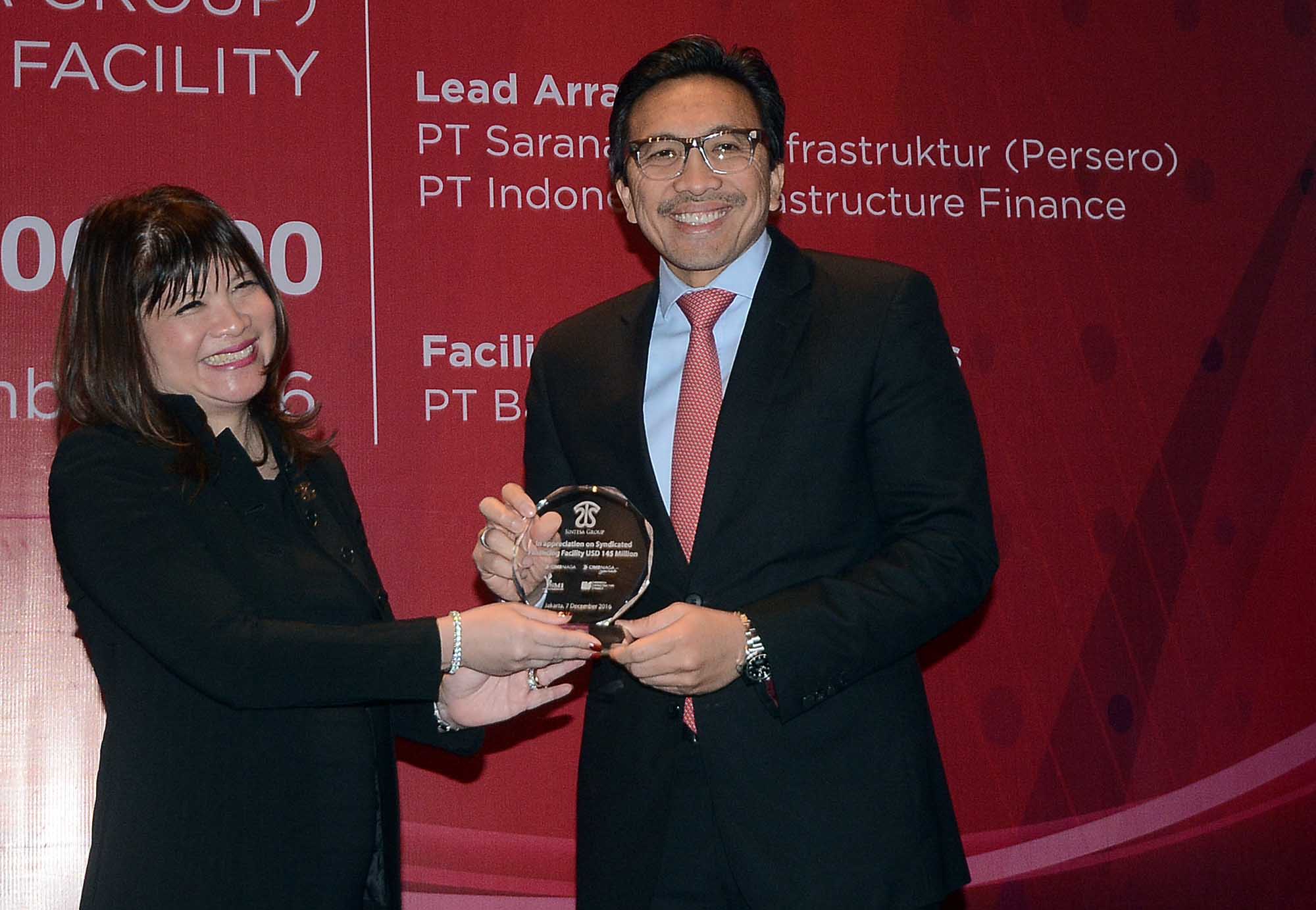 CEO Sintesa Group Shinta Widjaja Kamdani (kiri) menyerahkan cinderamata kepada Presdir PT CIMB Niaga Tigor M Siahaan (kanan) seusai acara penandatanganan fasilitas pembiayaan sindikasi PT Bank CIMB Niaga Tbk sebagai Mandated Lead Arrager dan Bookrunner, PT SMI (Sarana Multi Infrastruktur(persero), dan IIF sebagai lead arragers para pihak bersama dengan dana sebesar Rp 1,9 Triliun kepada PT Meppogen di Jakarta, Rabu (7/12/2016). Sindikasi pembiayaan ini dalam rangka mendukung ekspansi PLTGU Gunung Megang dari 110 MW menjadi 150 MW. AKTUAL/Eko Hilman