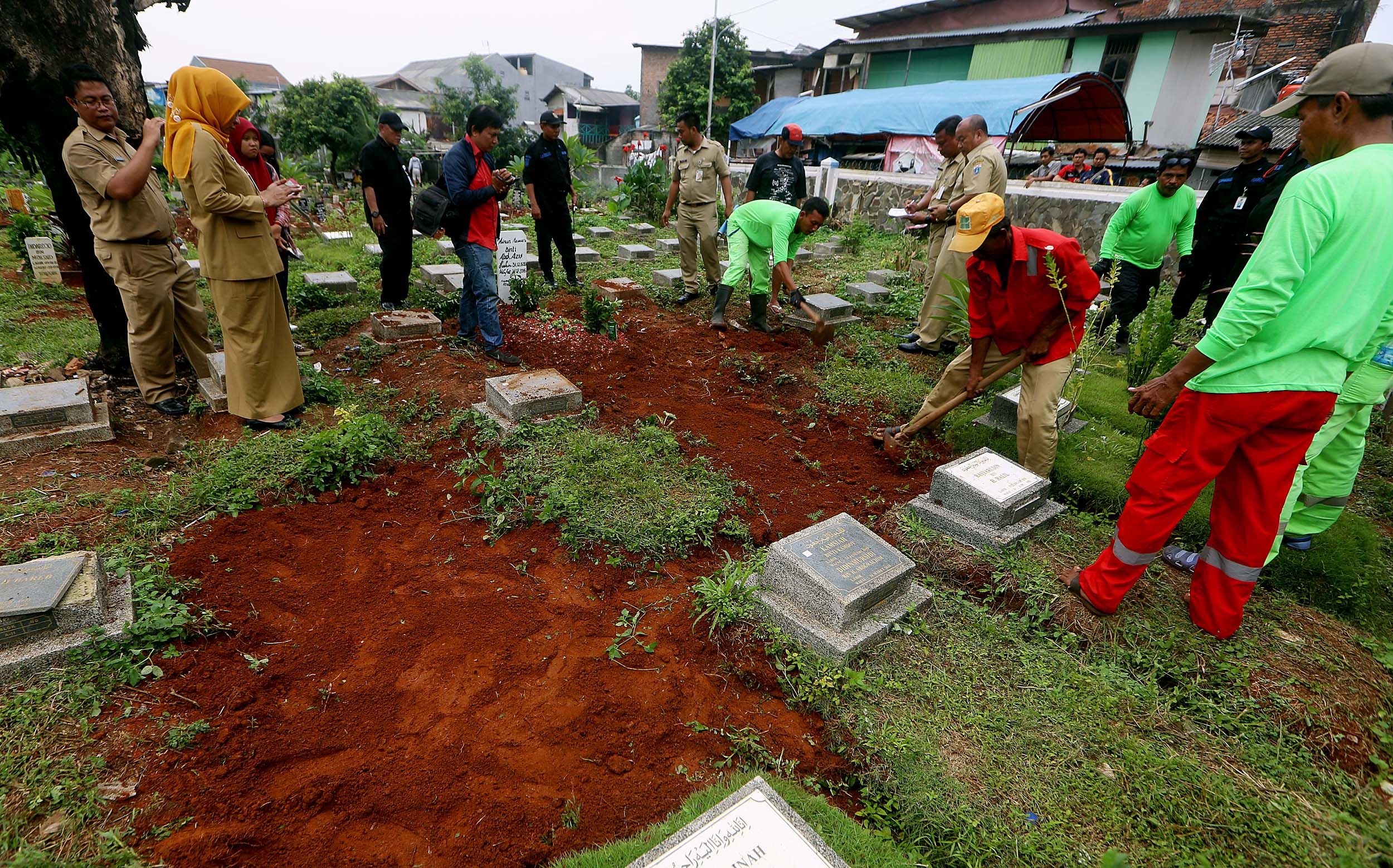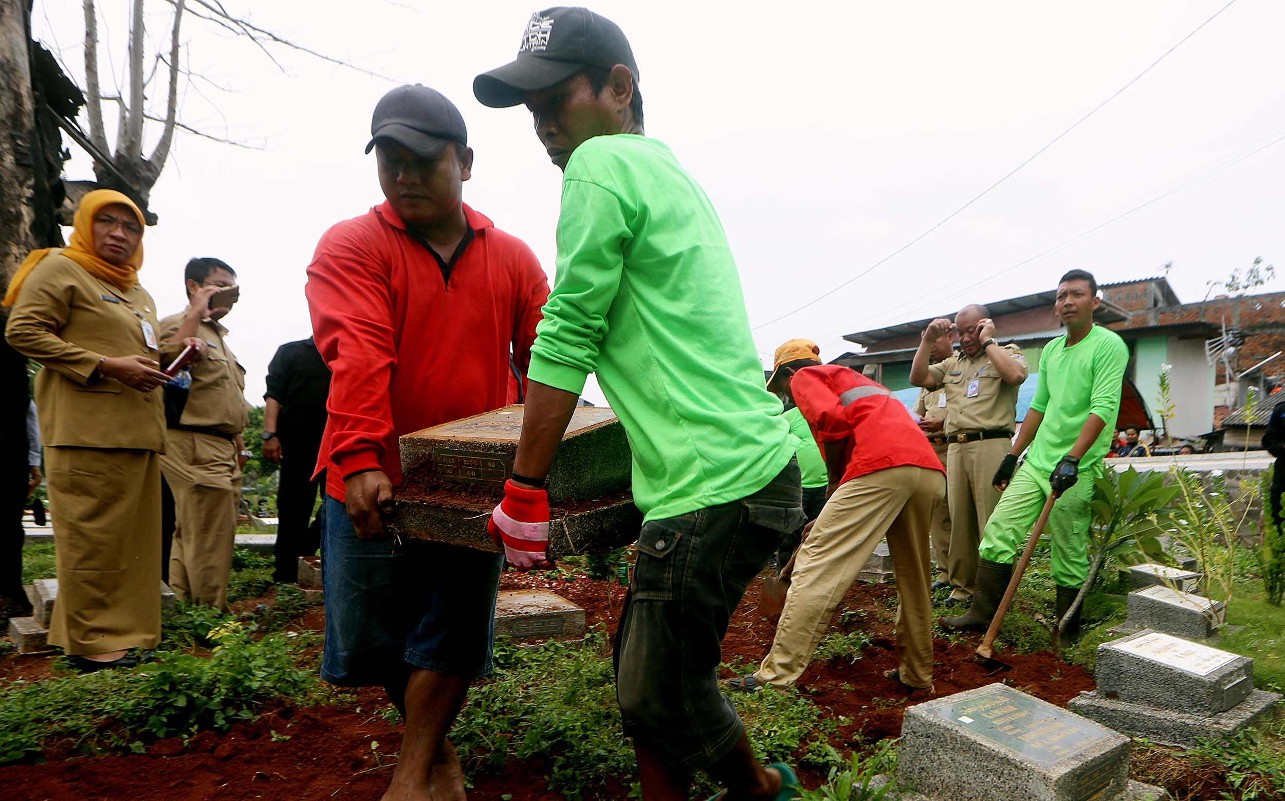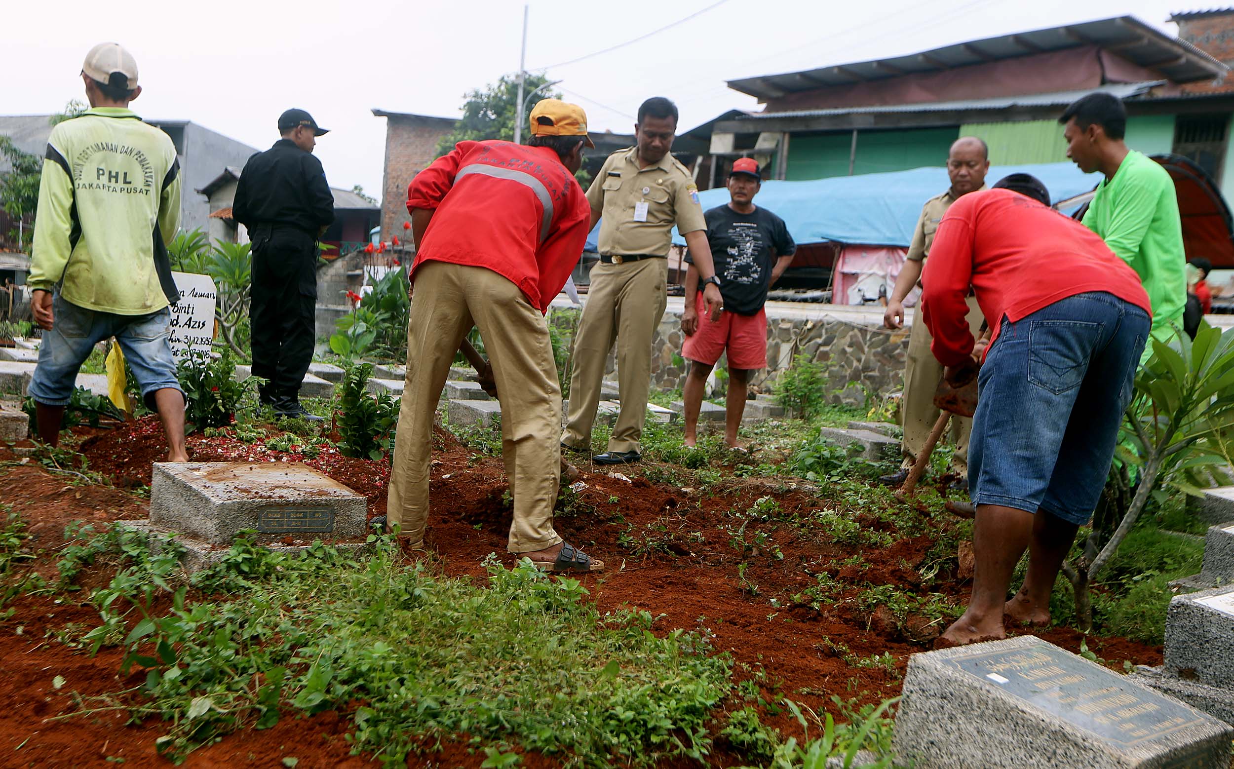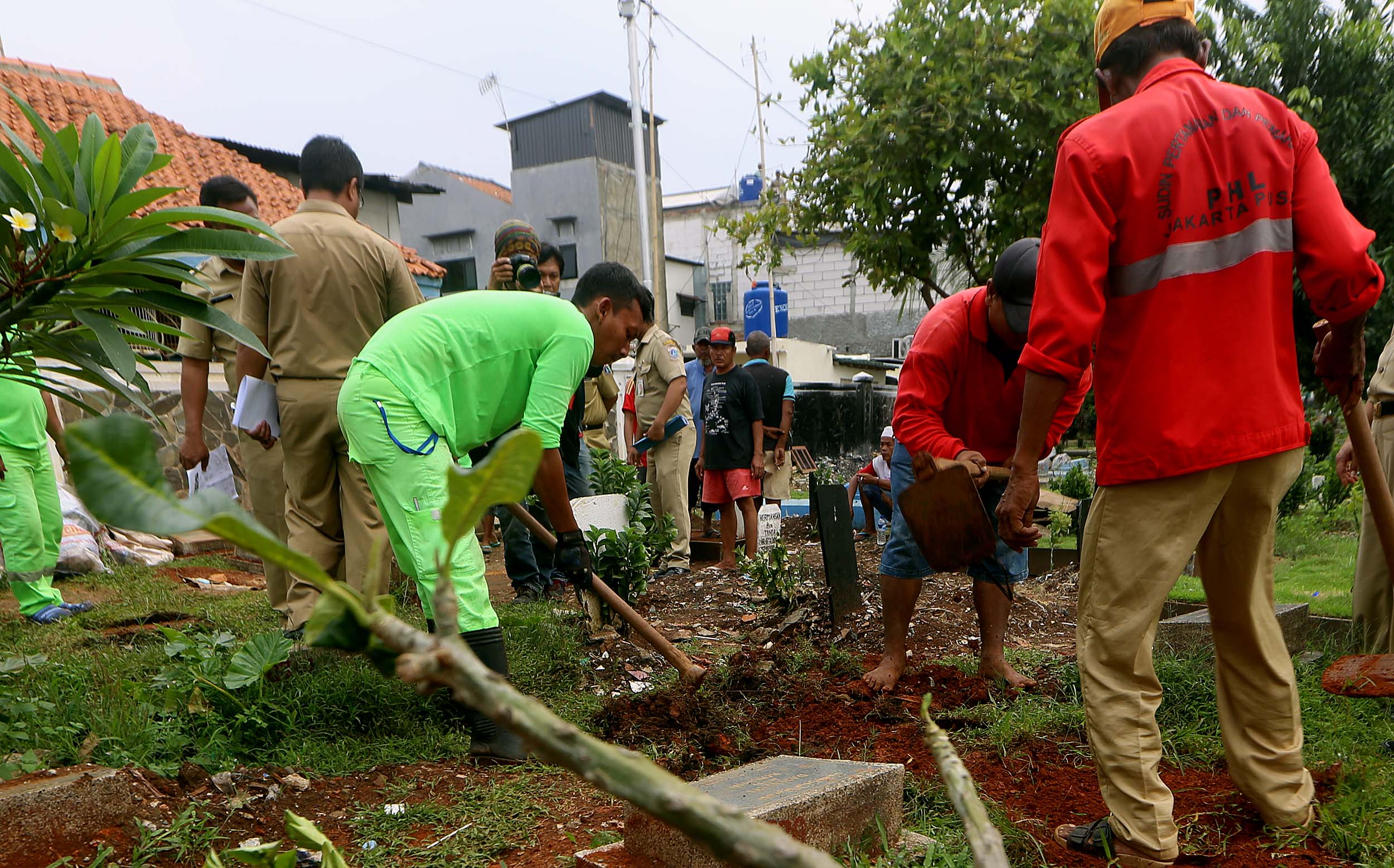 Pekerja tengah membongkar makam fiktif saat melakukan pengecekan dan pembongkaran di Tempat Pemakaman Umum (TPU) Kawi-kawi, Johar Baru, Jakarta, Senin (25/7/2016). Dinas Pertamanan dan Pemakaman DKI Jakarta menemukan sebanyak 6 makam fiktif dikawasan itu dan masih banyak tempat pemakaman umum (TPU) di Ibu Kota yang diduga terdapat makam palsu atau fiktif