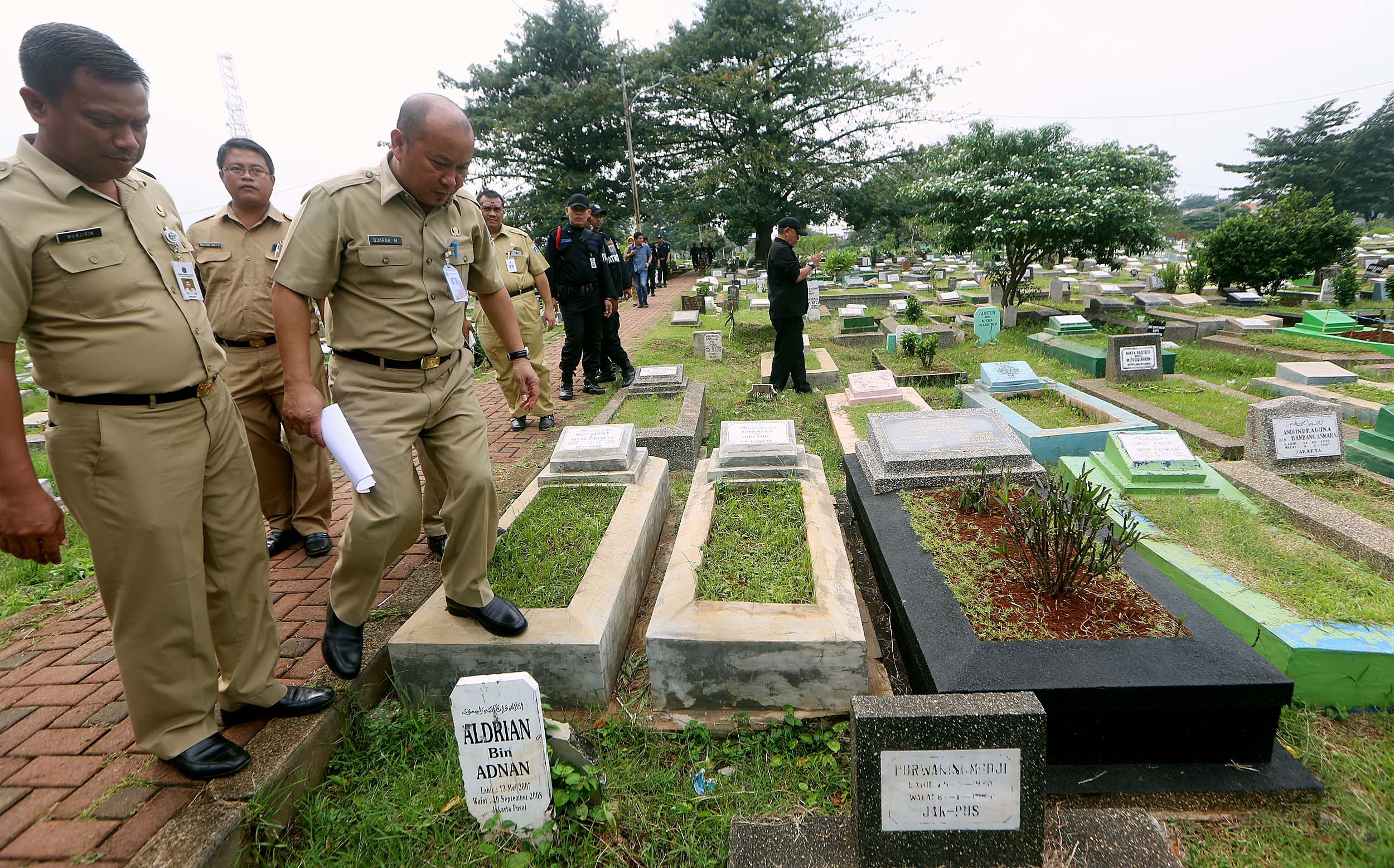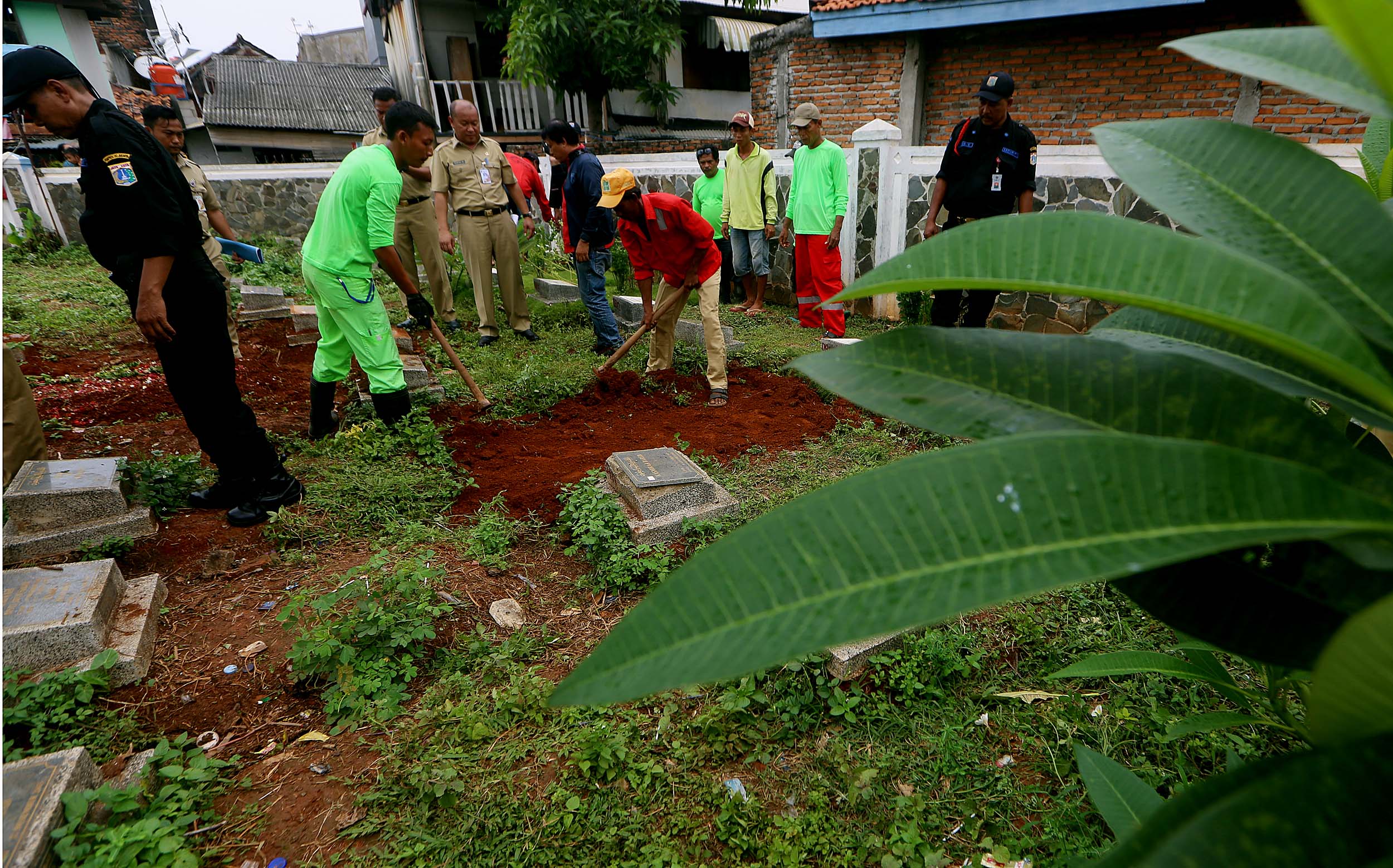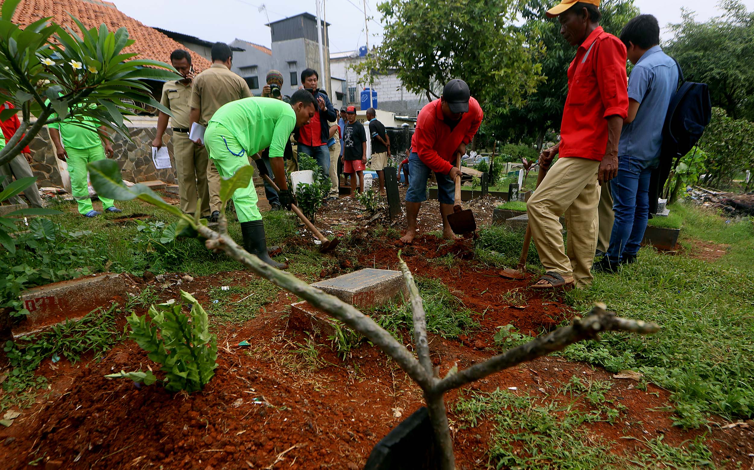 Pekerja tengah membongkar makam fiktif saat melakukan pengecekan dan pembongkaran di Tempat Pemakaman Umum (TPU) Kawi-kawi, Johar Baru, Jakarta, Senin (25/7/2016). Dinas Pertamanan dan Pemakaman DKI Jakarta menemukan sebanyak 6 makam fiktif dikawasan itu dan masih banyak tempat pemakaman umum (TPU) di Ibu Kota yang diduga terdapat makam palsu atau fiktif