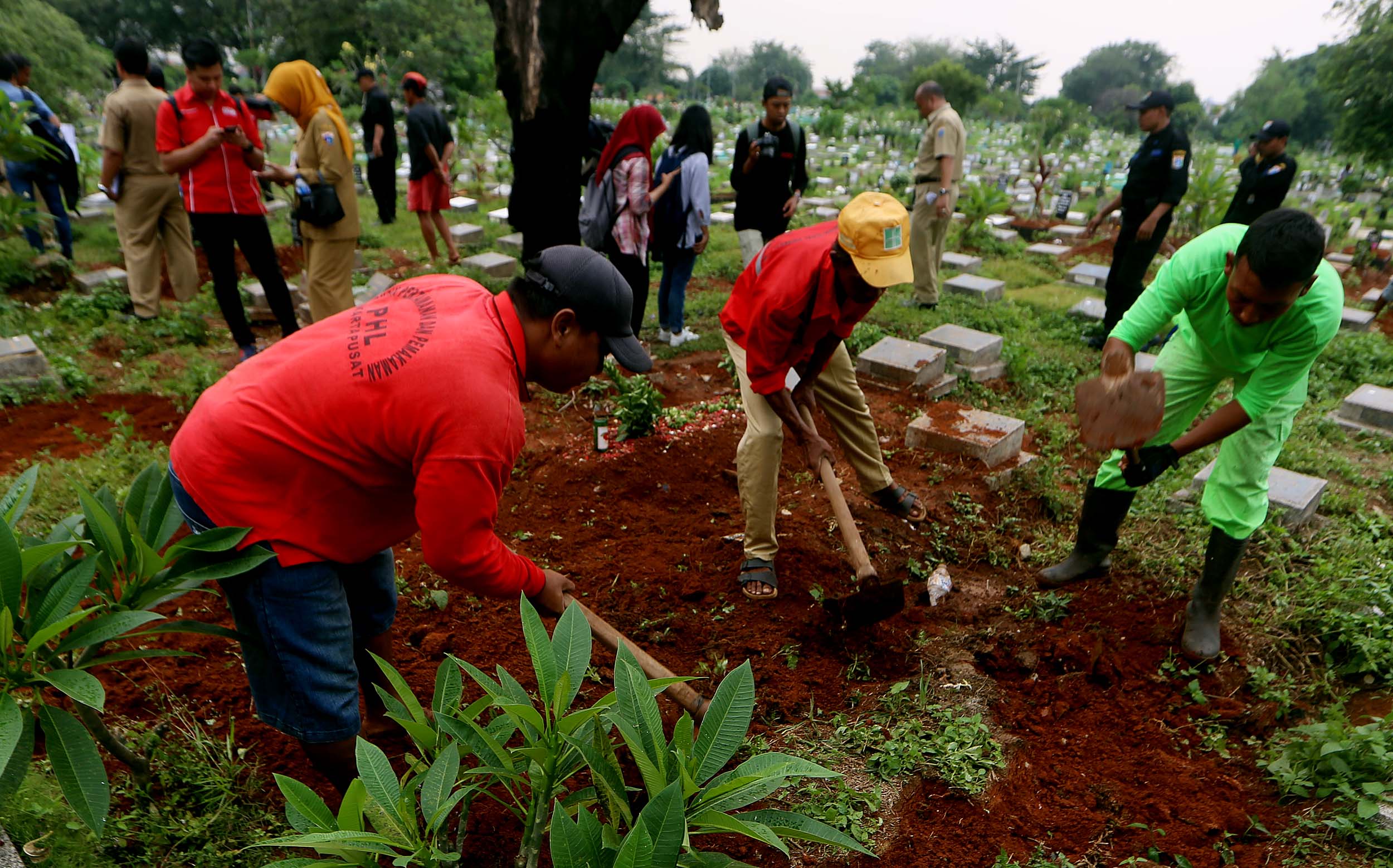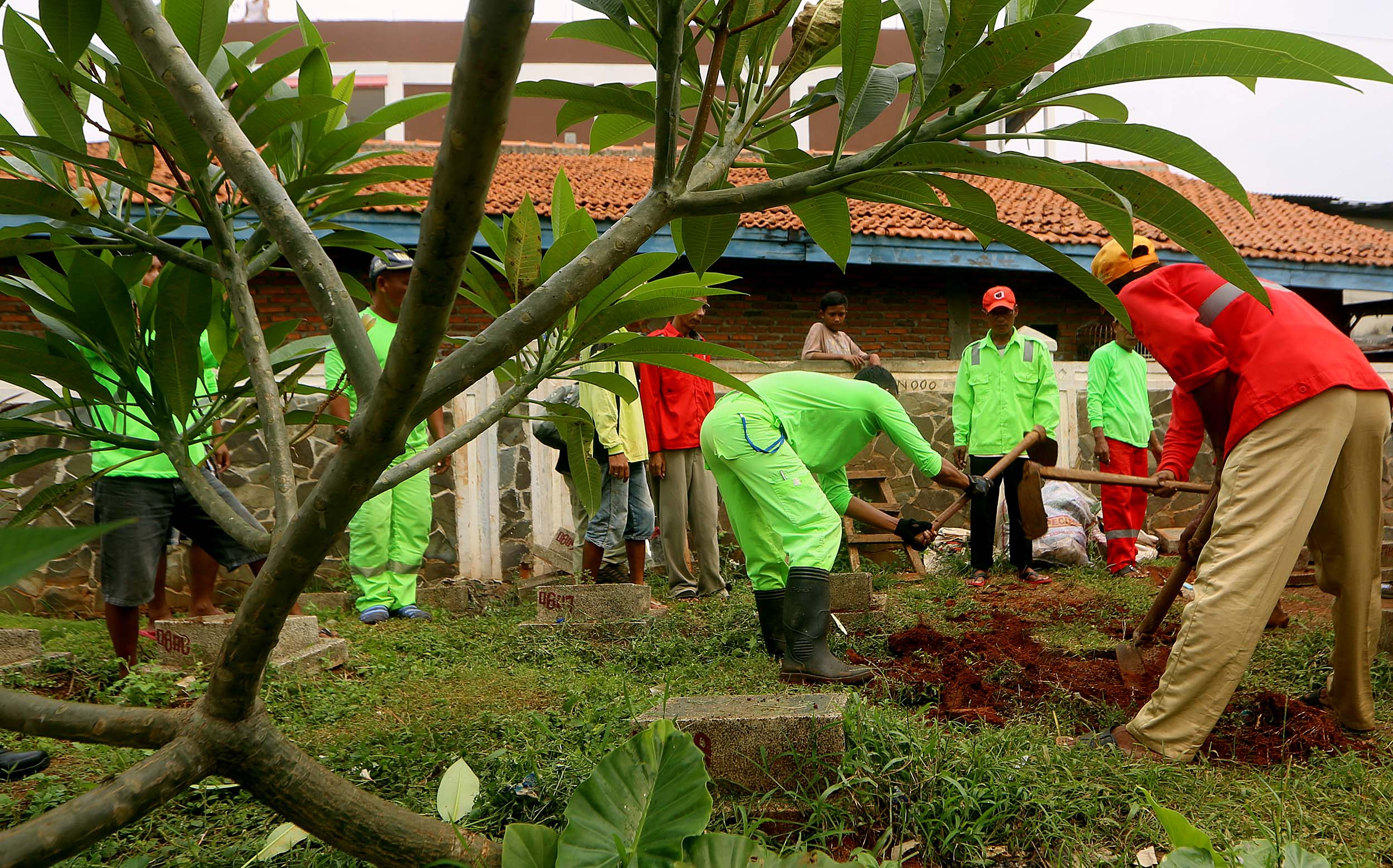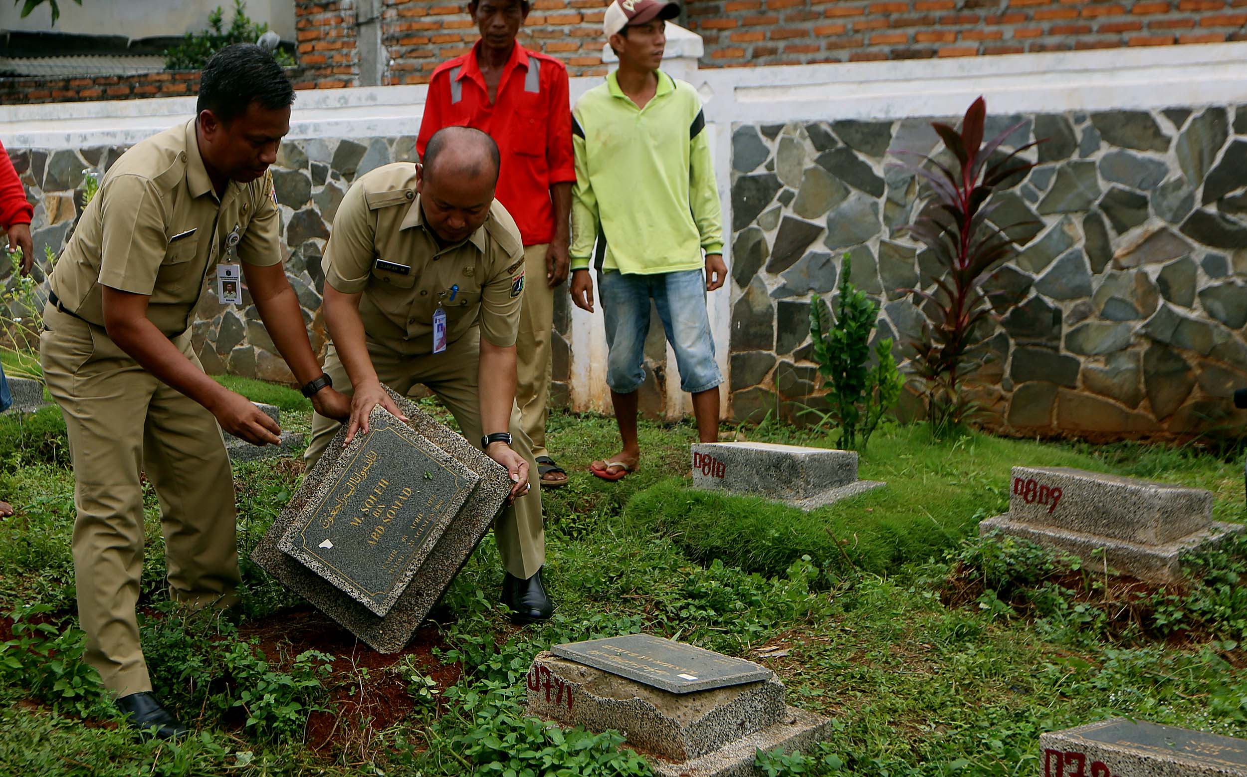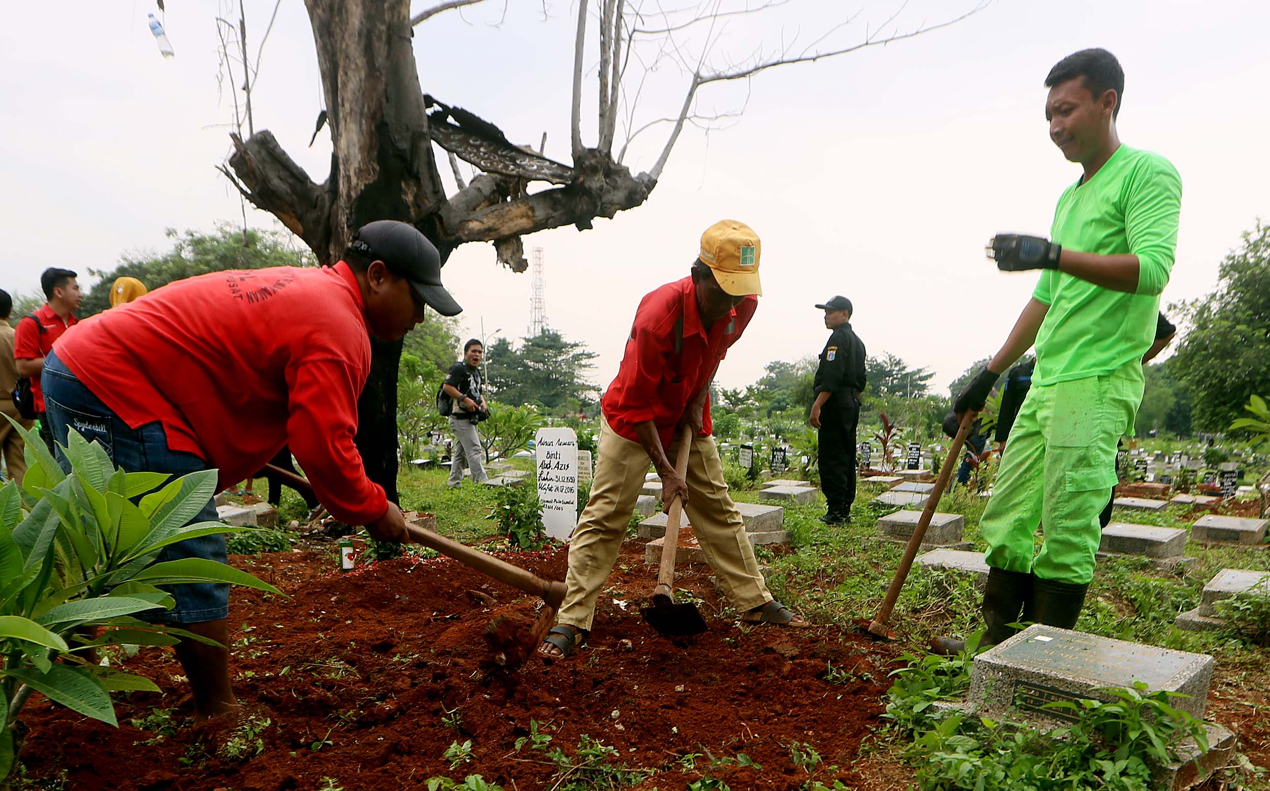 Pekerja tengah membongkar makam fiktif saat melakukan pengecekan dan pembongkaran di Tempat Pemakaman Umum (TPU) Kawi-kawi, Johar Baru, Jakarta, Senin (25/7/2016). Dinas Pertamanan dan Pemakaman DKI Jakarta menemukan sebanyak 6 makam fiktif dikawasan itu dan masih banyak tempat pemakaman umum (TPU) di Ibu Kota yang diduga terdapat makam palsu atau fiktif
