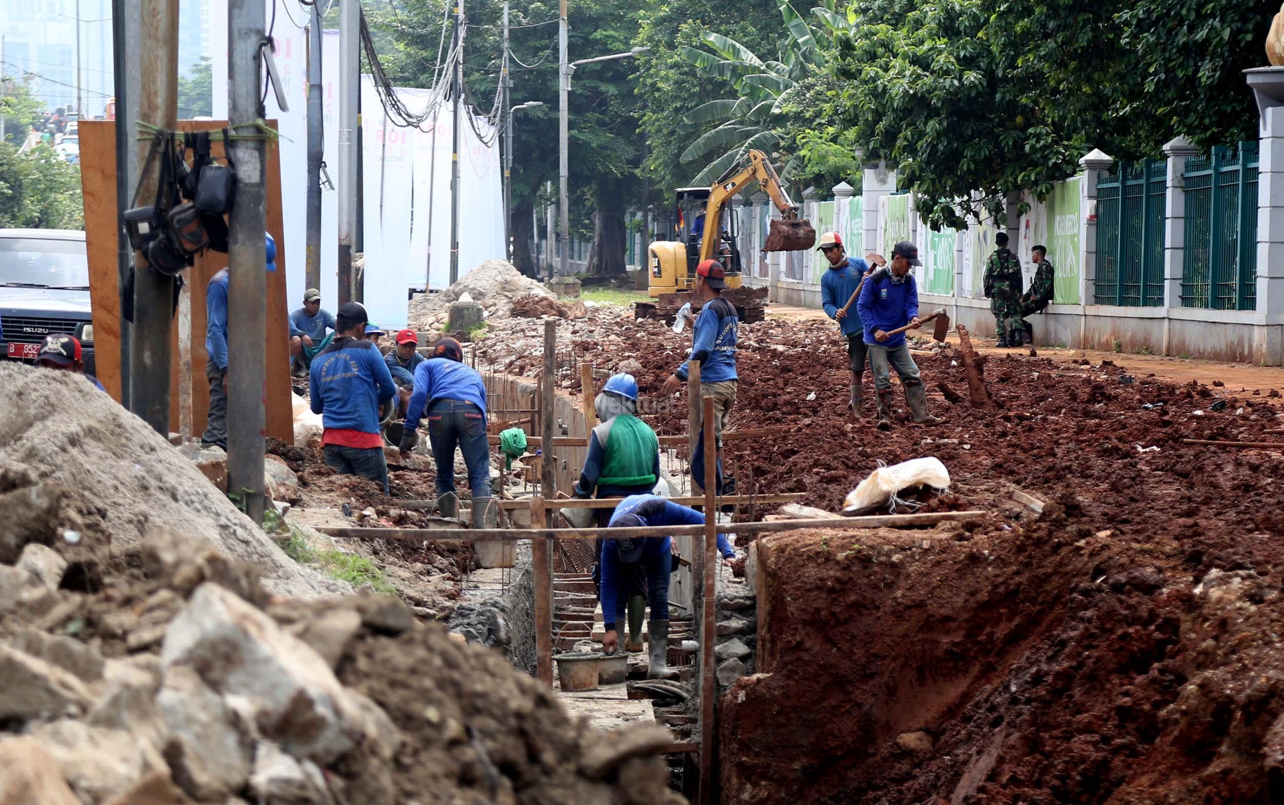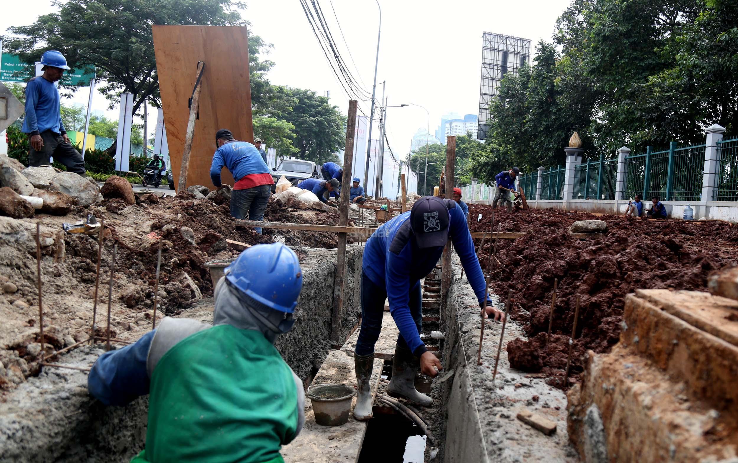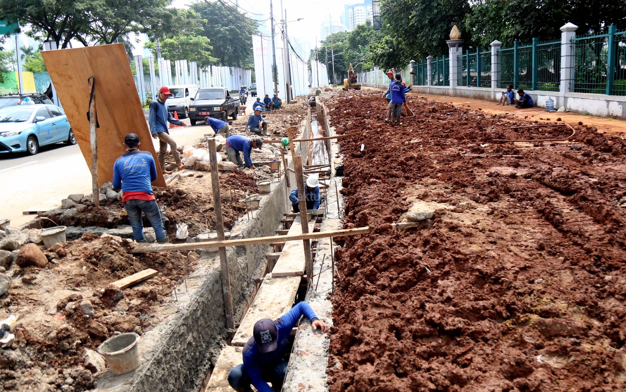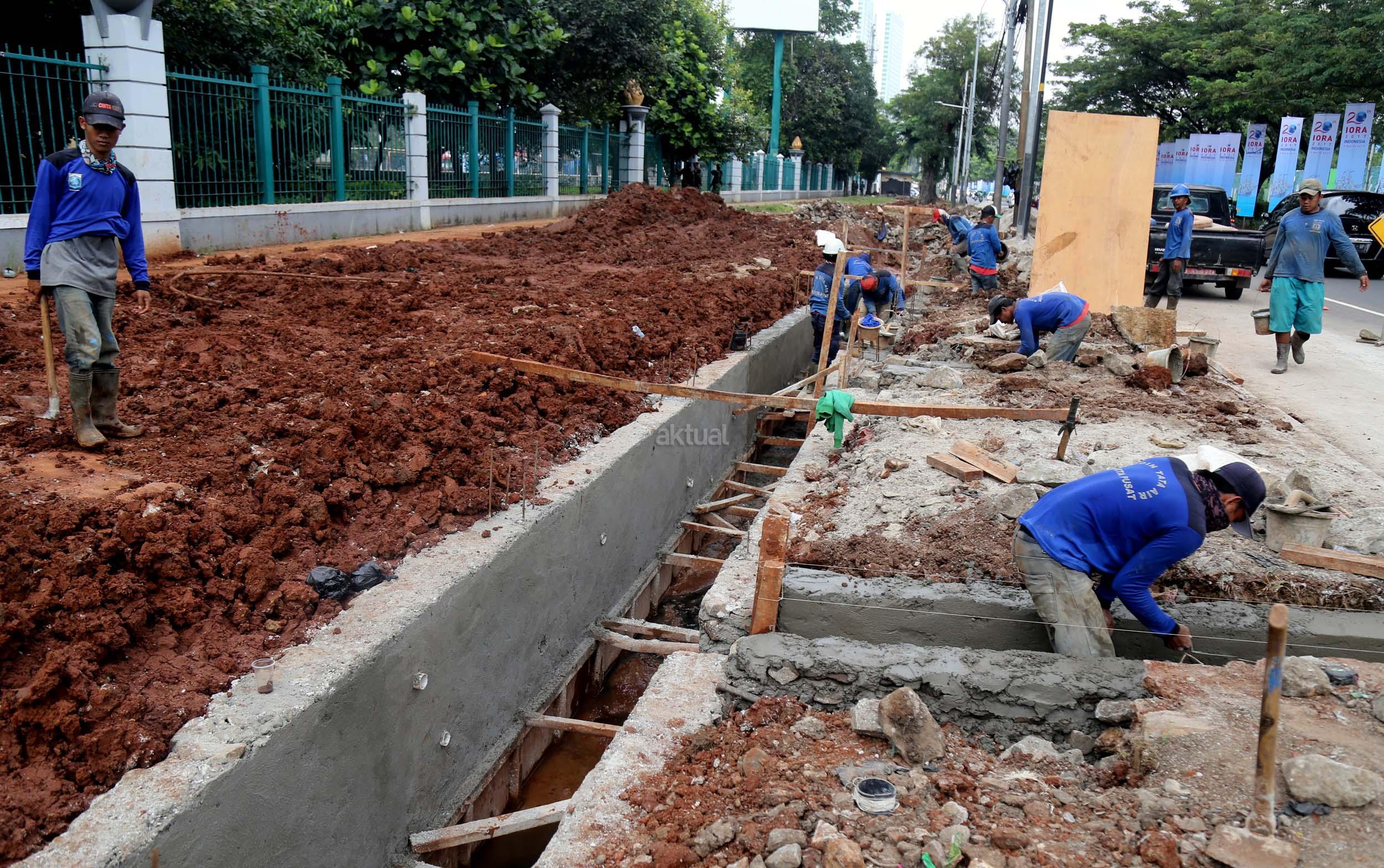 Sejumlah pekerja membuat saluran air di Jalan Asia Afrika, Senayan, Jakarta, Senin (6/3/2017). Dinas Tata Air Jakarta Pusat membuat saluran air di Jl. Asia Afrika, Senayan. Pembuatan saluran air itu untuk menanggulangi genangan air saat hujan turun. AKTUAL/Munzir