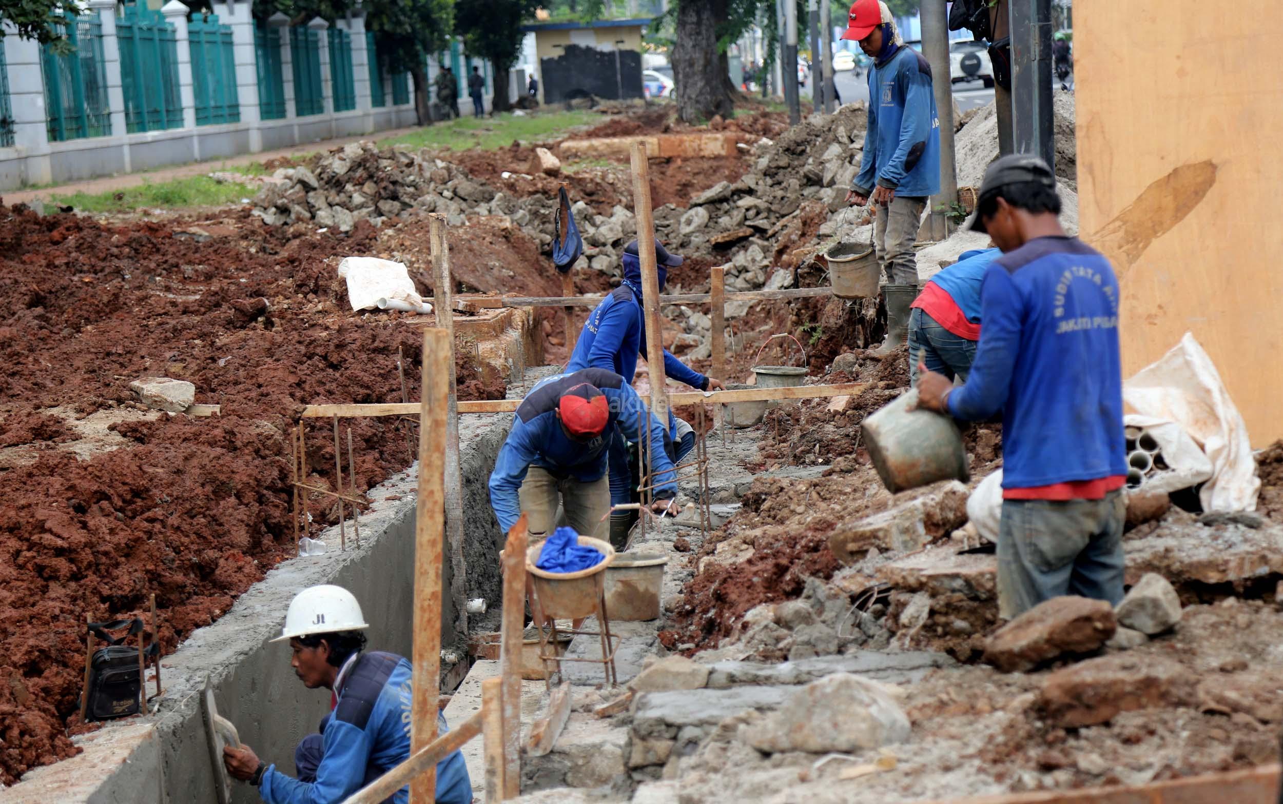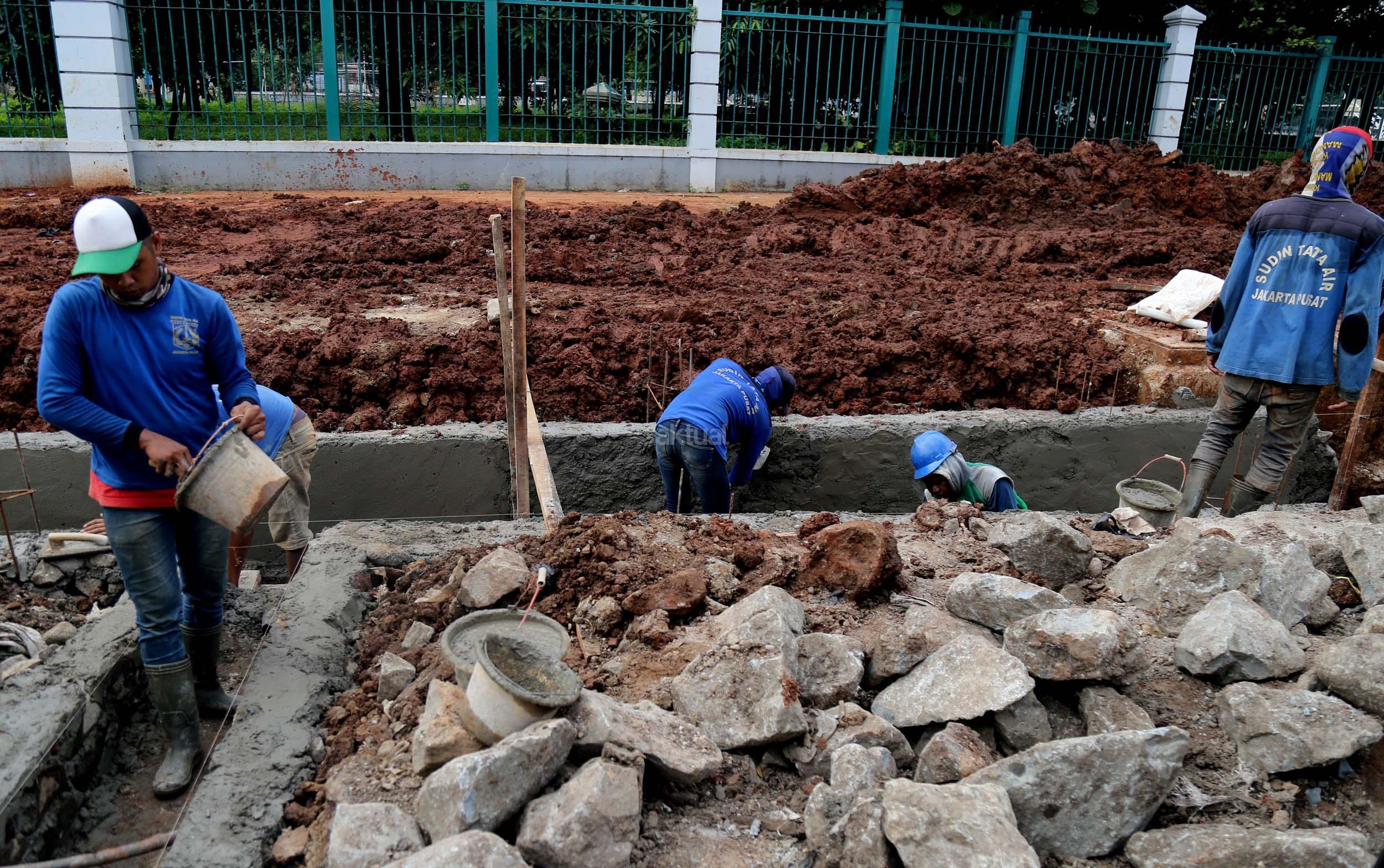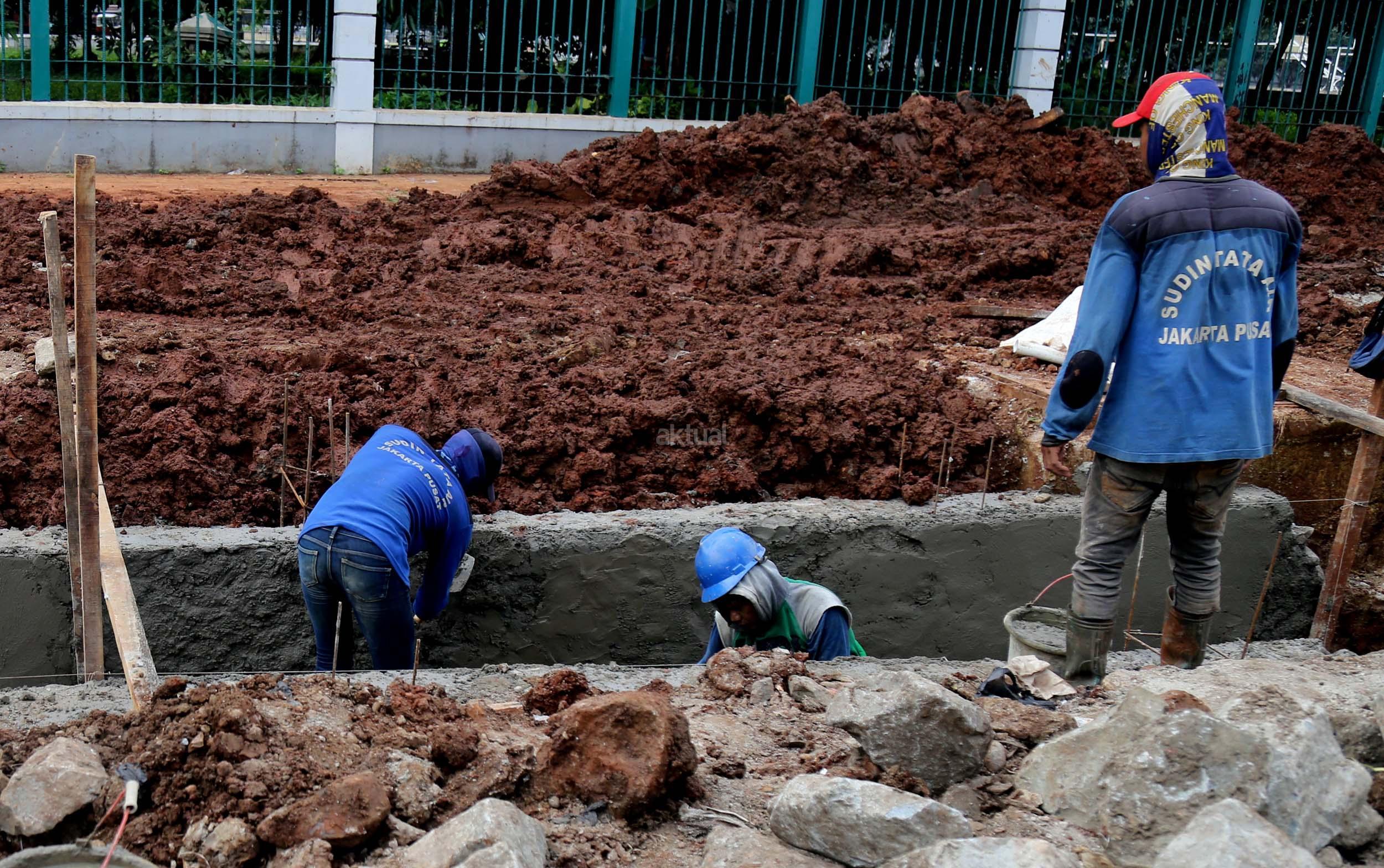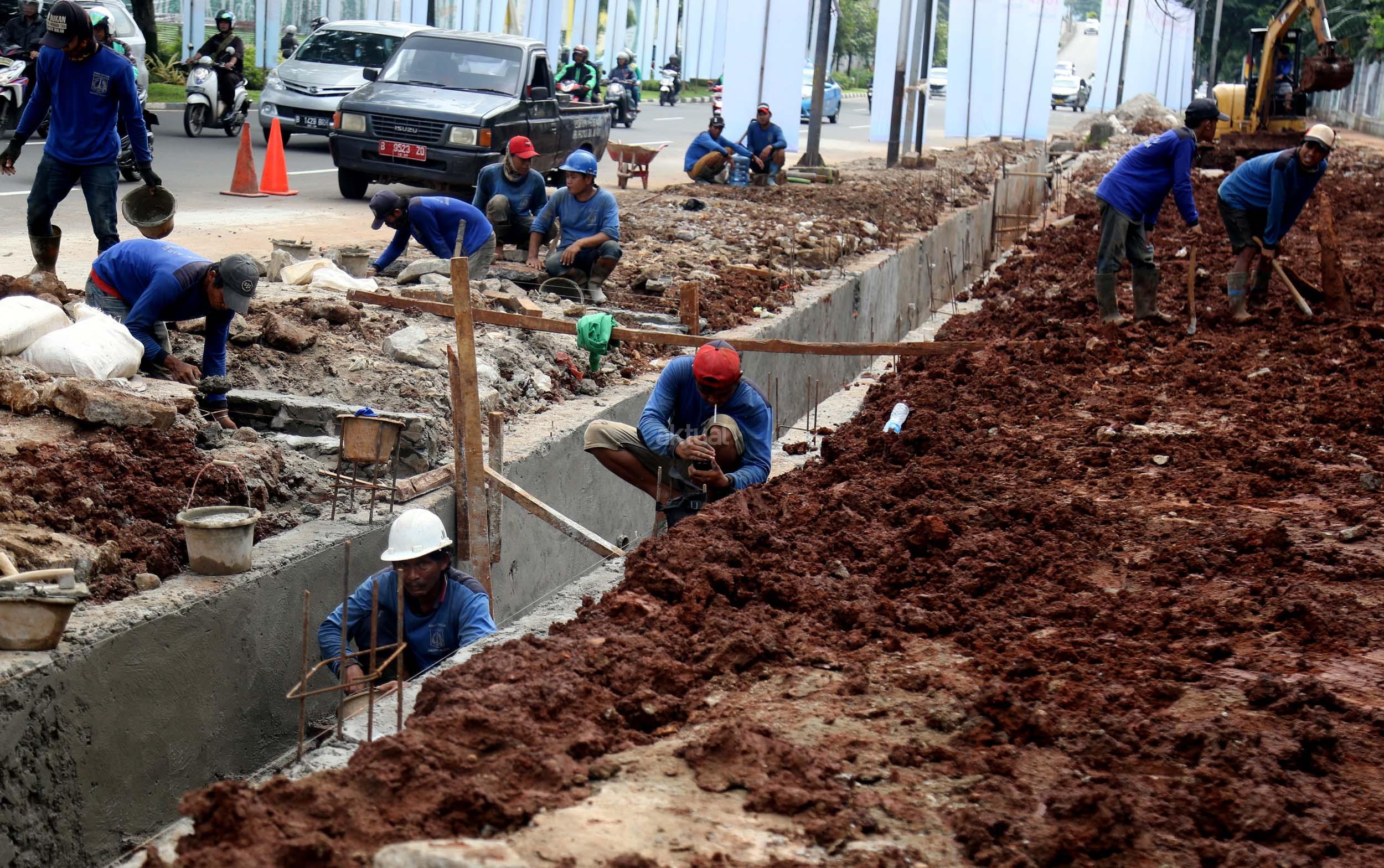 Sejumlah pekerja membuat saluran air di Jalan Asia Afrika, Senayan, Jakarta, Senin (6/3/2017). Dinas Tata Air Jakarta Pusat membuat saluran air di Jl. Asia Afrika, Senayan. Pembuatan saluran air itu untuk menanggulangi genangan air saat hujan turun. AKTUAL/Munzir