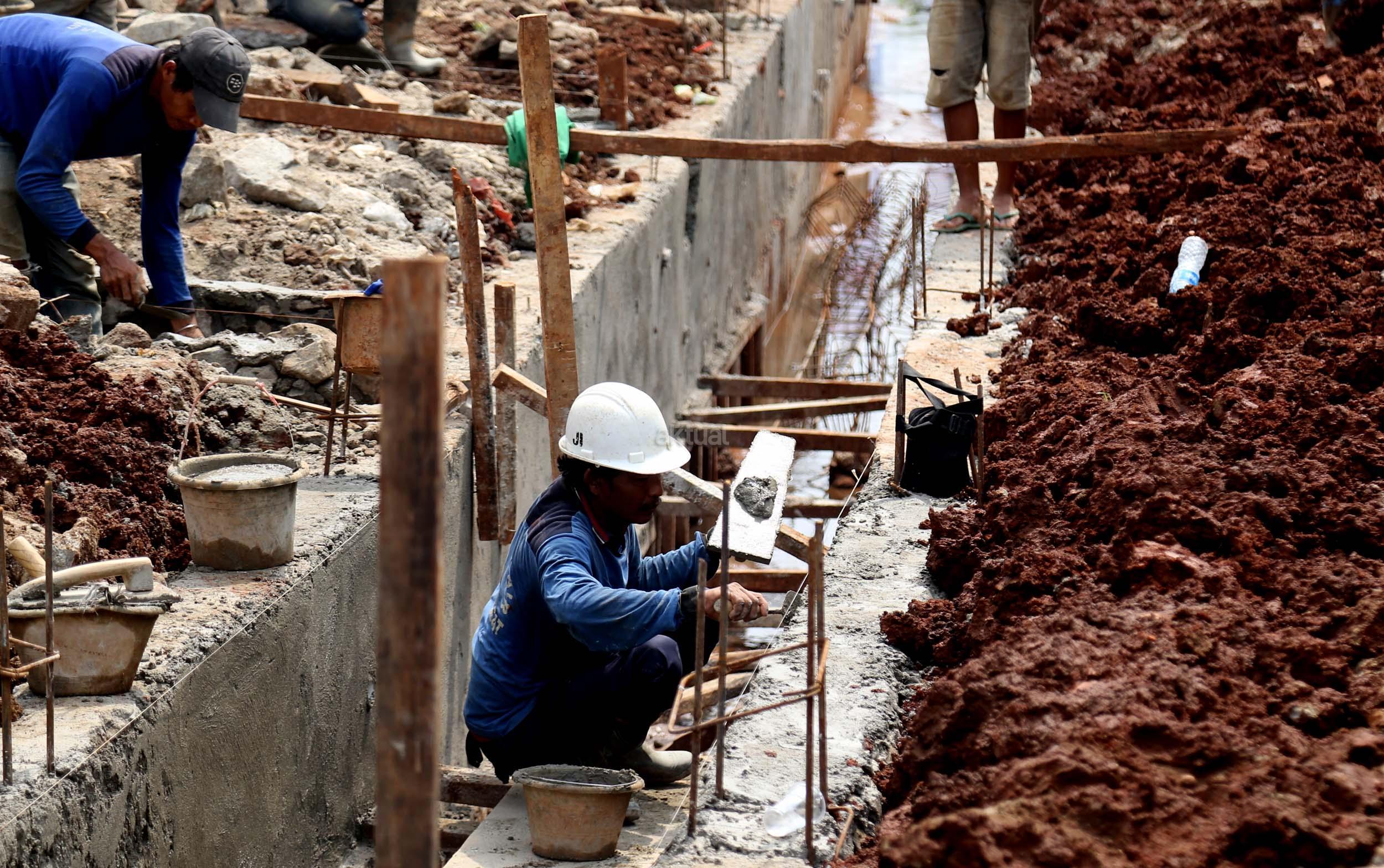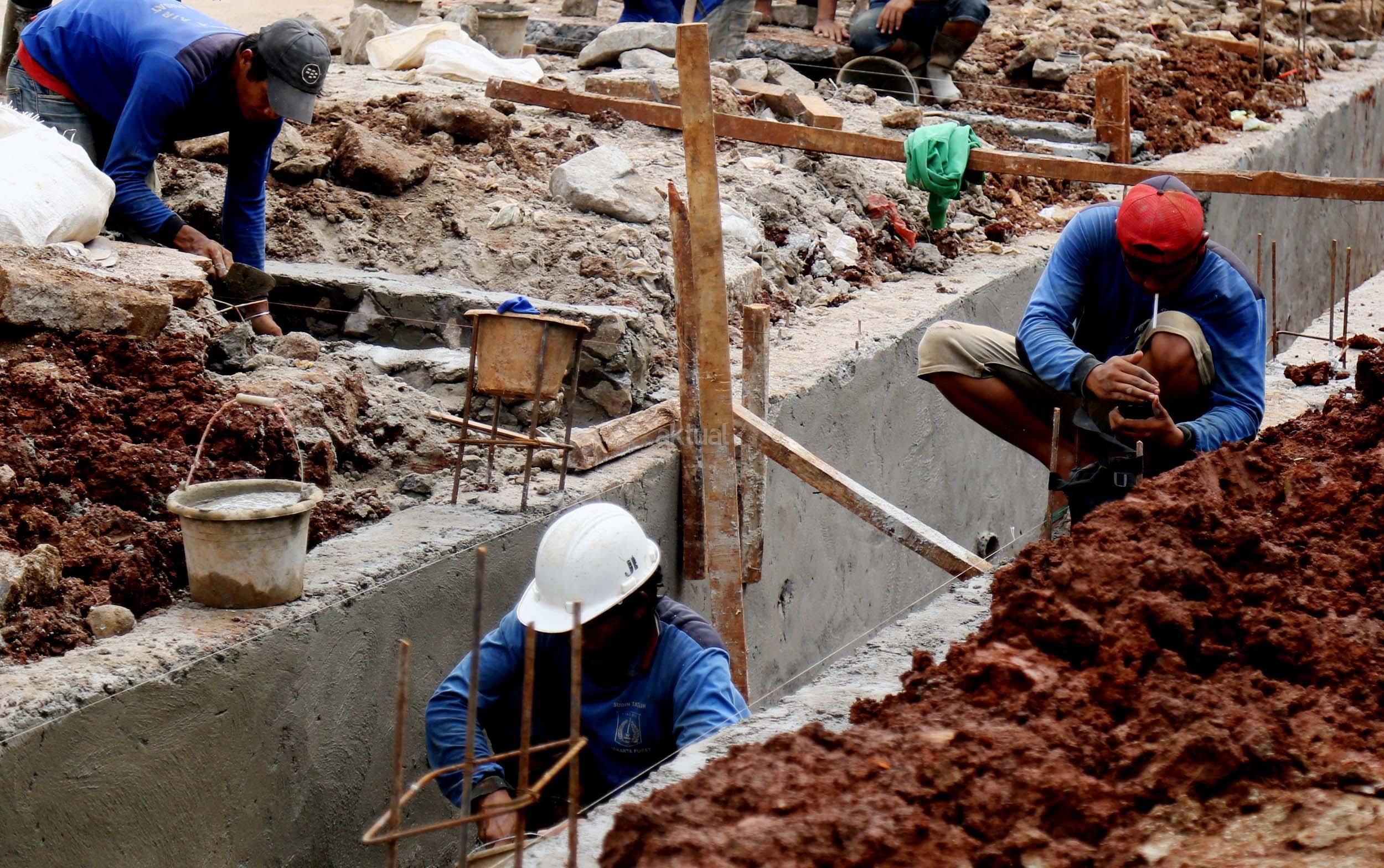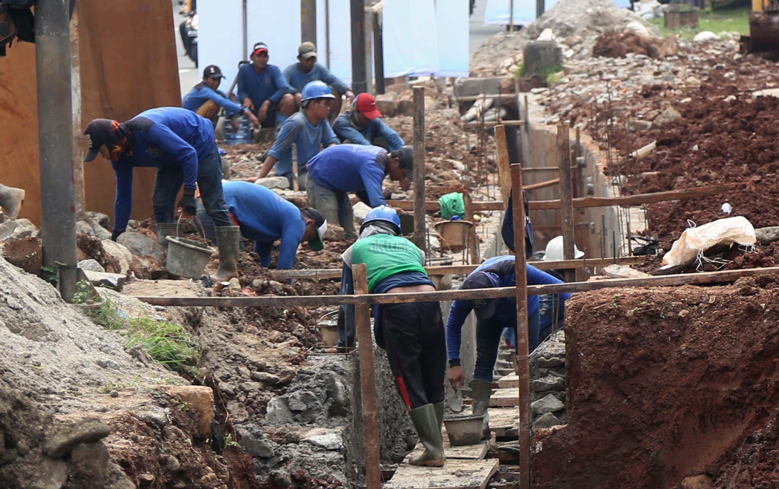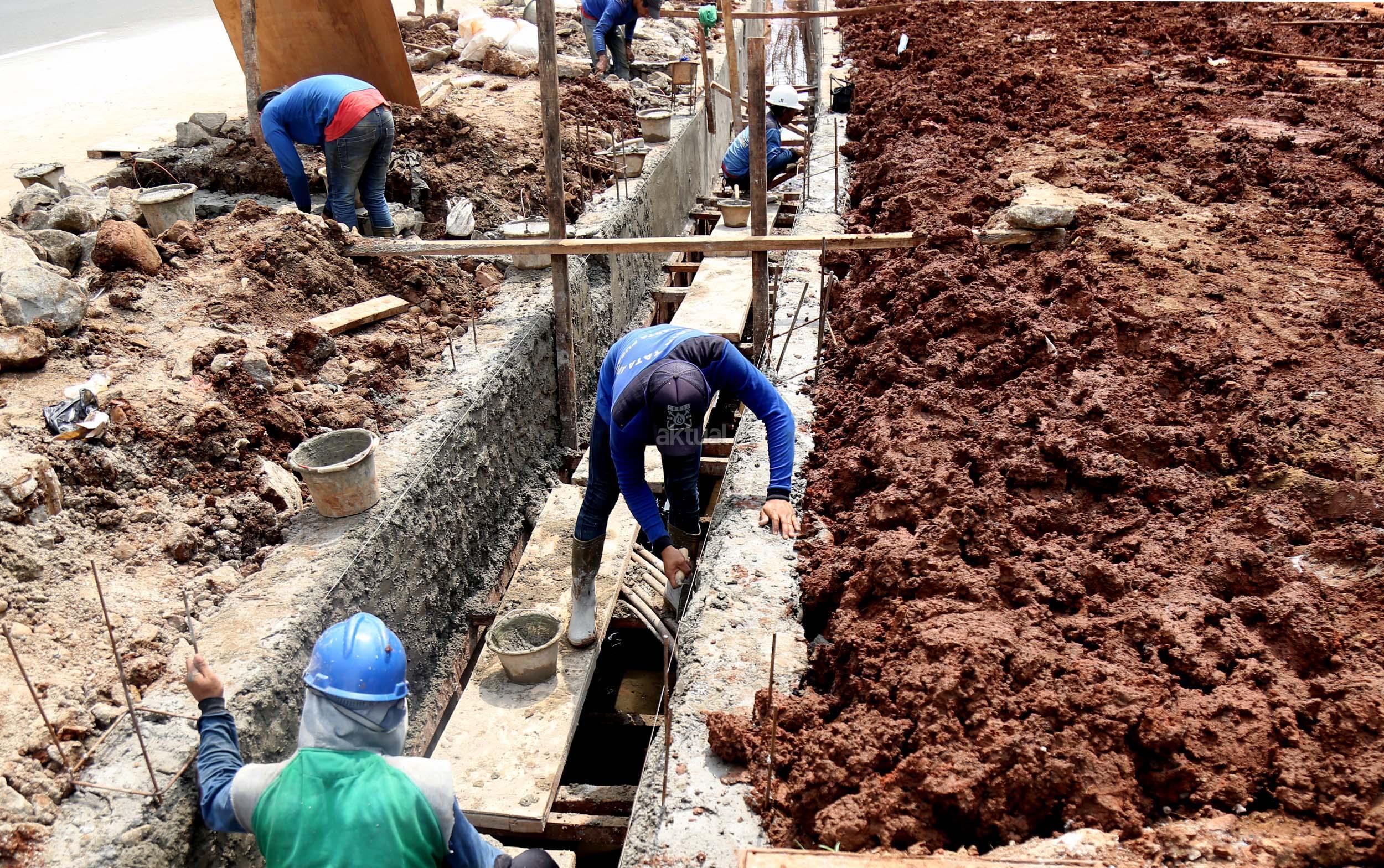 Sejumlah pekerja membuat saluran air di Jalan Asia Afrika, Senayan, Jakarta, Senin (6/3/2017). Dinas Tata Air Jakarta Pusat membuat saluran air di Jl. Asia Afrika, Senayan. Pembuatan saluran air itu untuk menanggulangi genangan air saat hujan turun. AKTUAL/Munzir