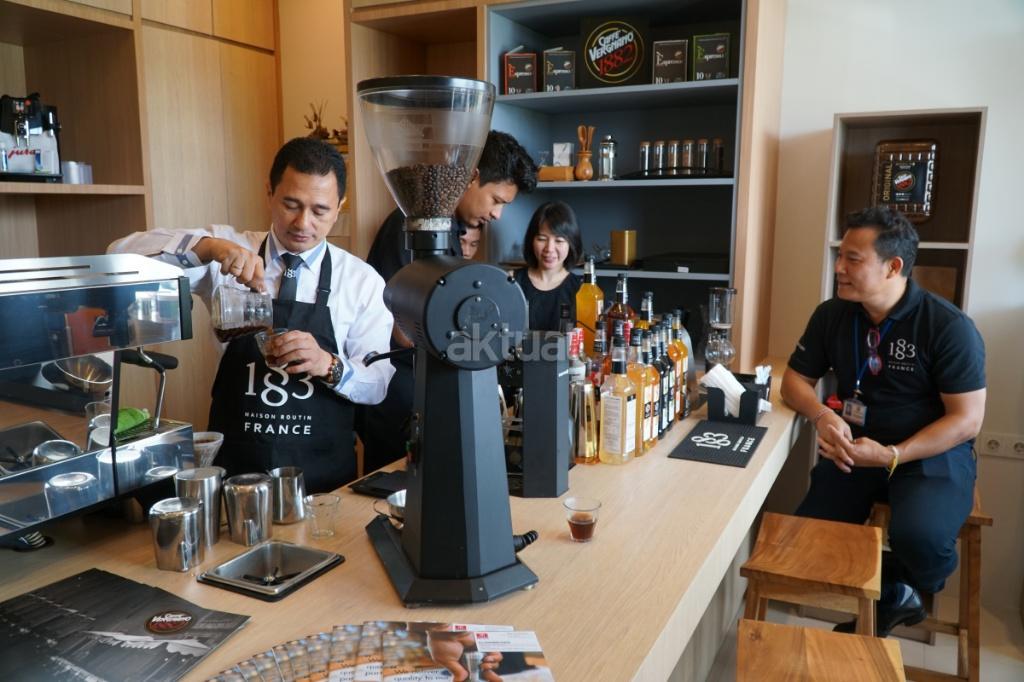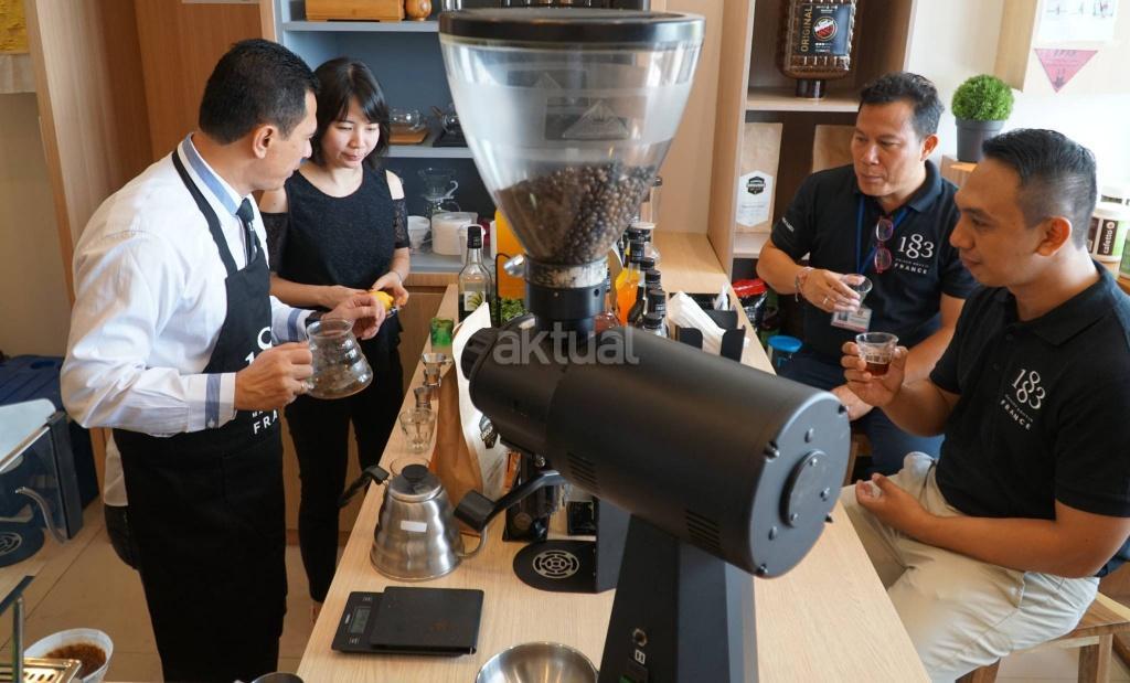Dari kiri ke kanan, Barista Trainer menjelaskan proses pembuatan dan penyajian kopi kepada General Manager Fine Food & Beverage PT Sukanda Djaya Fennie Jong, General Manager Bali Branch Nares Changsamlee dan Area Sales Manager Beverage & Equipment Robby C. Mooy usai peresmian  pembukaaan beverage & equipment house PT Sukanda Djaya di Bali, Rabu (6/12). Beverage & Equipment House merupakan unit usaha PT Sukanda Djaya  yang bergerak di bidang penyediaan mesin kopi, rational combi kitchen oven, beverage serta pusat pelatihan  untuk kebutuhan hotel, resto dan café. AKTUAL/Eko S Hilman