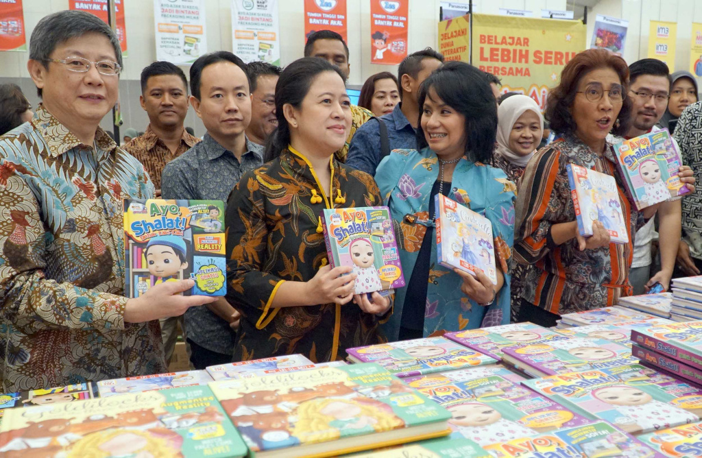 Direktur BCA Henry Koenaifi (kiri) bersama Menteri Kelautan dan Perikanan Republik Indonesia Susi Pudjiastuti (kanan), Menteri Koordinator Bidang Pembangunan Manusia dan Kebudayaan Republik Indonesia Puan Maharani (kedua kiri) dan Presiden Direktur PT. Jaya Ritel Indonesia Uli Silalahi (kedua kanan) di tengah acara pembukaan Big Bad Wolf (BBW) 2019 di Tangerang, Kamis (28/2). AKTUAL/STR-Eko S Hilman