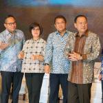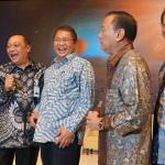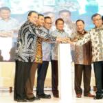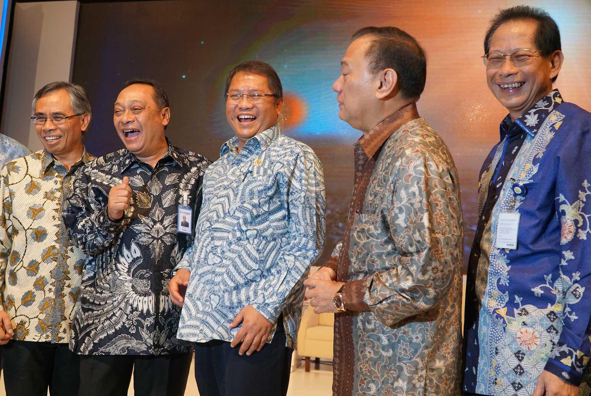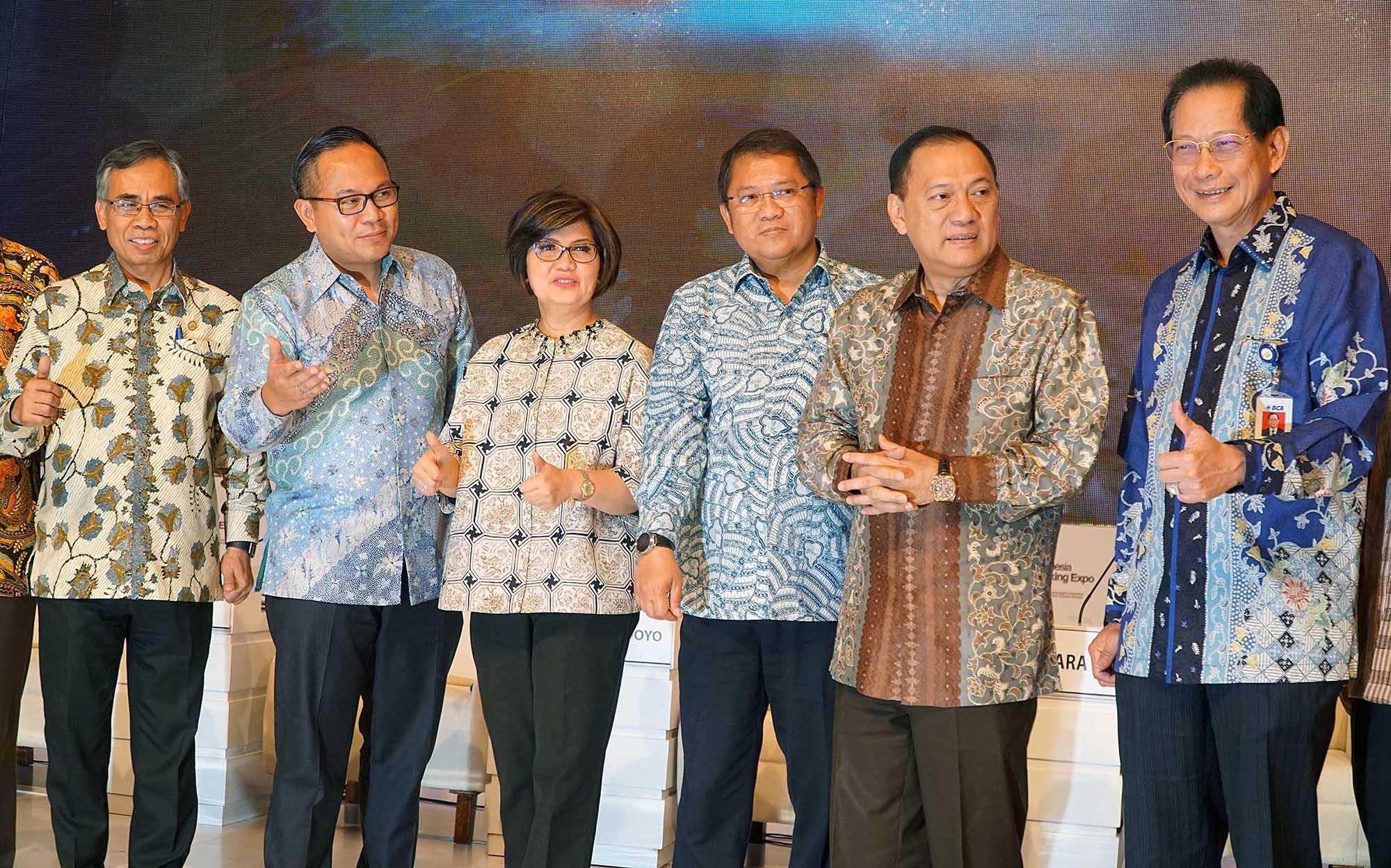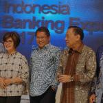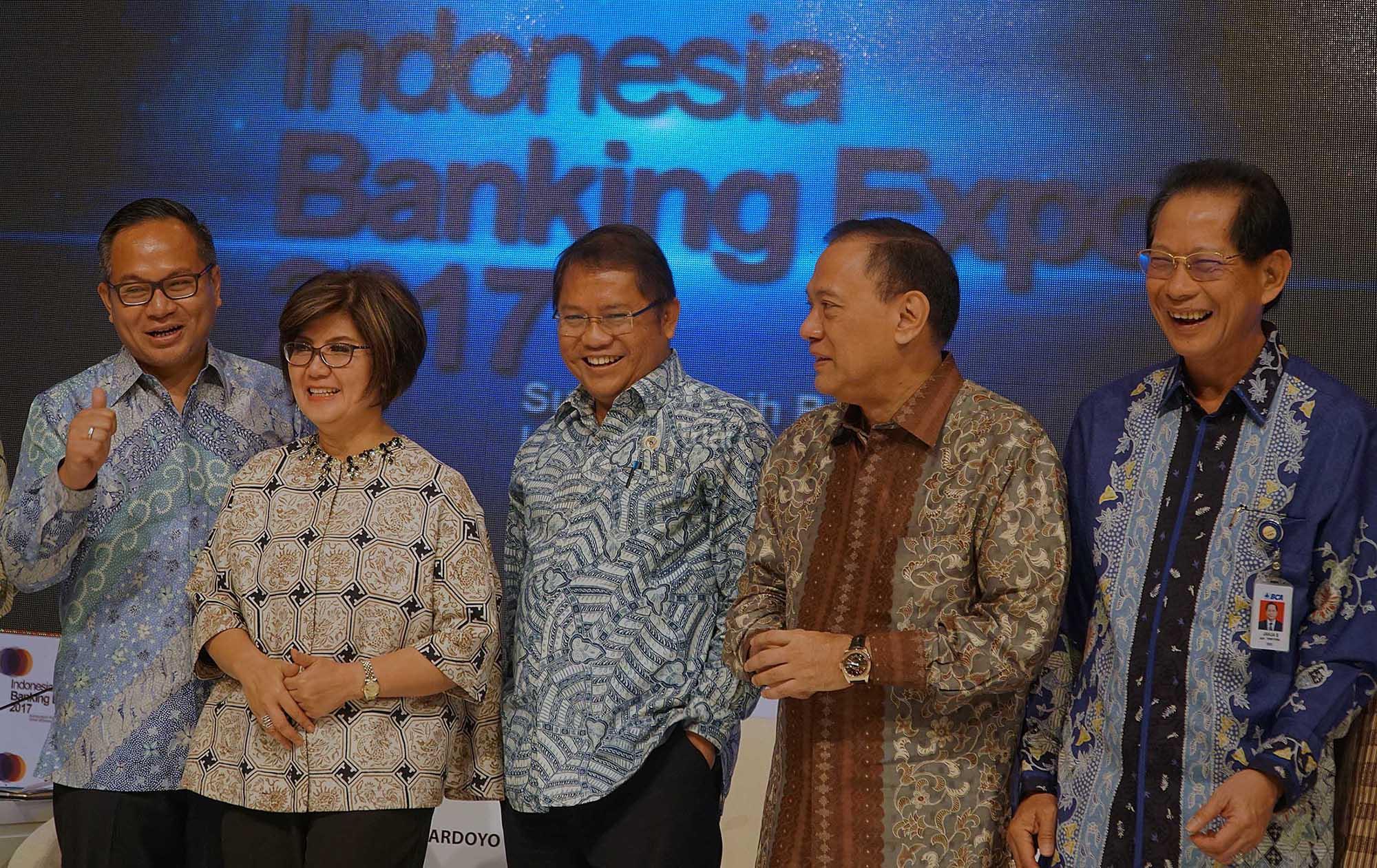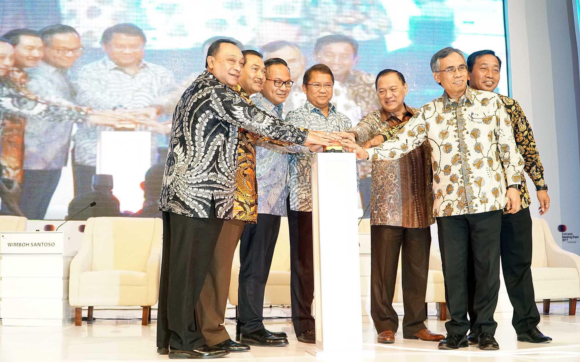 Direktur Utama Bank BTN Maryono yang sekaligus sebagai Ketua Himpunan Bank Milik Negara (kiri) bersama Ketua Panitia IBEX 2017, Sis Apik Wijayanto ( kanan), Ketua Dewan Komisioner OJK Wimboh Santoso, Gubernur Bank Indonesia Agus Martowardojo (ketiga kanan), Dirut Bank Mandiri Kartika Wirjoatmodjo, Menkominfo Rudiantara, Dirut BRI Suprajarto saat acara pembukaan Indonesia Banking Expo 2017 di Jakarta, Selasa (19/9). Bank milik pemerintah anggota Himbara seperti Mandiri, BTN, BNI, BRI dan bank swasta nasional lainnya yang tergabung dalam Perbanas mengikuti IBEX 2017. Pameran dimaksudkan untuk mengenalkan kepada masyarakat tentang produk dan jasa yang dimiliki oleh masing-masing bank termasuk update terbaru layanan yang dapat dimanfaatkan oleh masyarakat. AKTUAL/Eko S Hilman