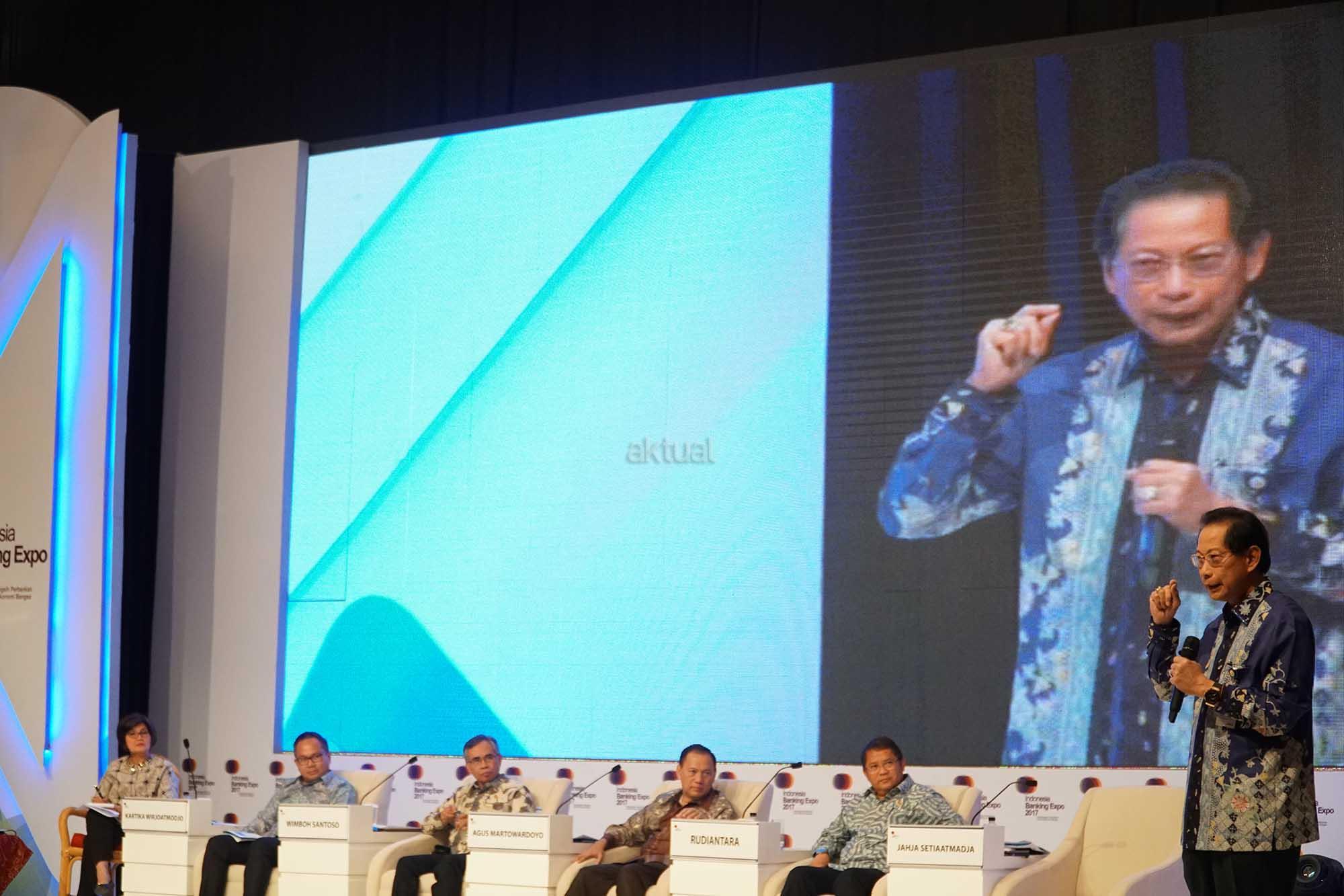 Presiden Direktur PT Bank Central Asia Tbk (BCA) Jahja Setiaatmadja (berdiri) saat menjadi pembicara dalam pembukaan Indonesia Banking Expo 2017 di Jakarta Convention Center, Jakarta, Selasa (19/9). Mengangkat tema “Transformasi Industri Perbankan Jawaban Terhadap Revolusi Teknologi Digital”, IBEX 2017 digelar selama dua hari pada tanggal 19 dan 20 September sebagai wujud komitmen pelaku perbankan Indonesia, bersama-sama dengan pelaku usaha dari berbagai bidang, untuk mengusung inovasi teknologi sistem pembayaran yang sesuai dengan perubahan perilaku konsumen ke arah digitalisasi. AKTUAL/Eko S Hilman
