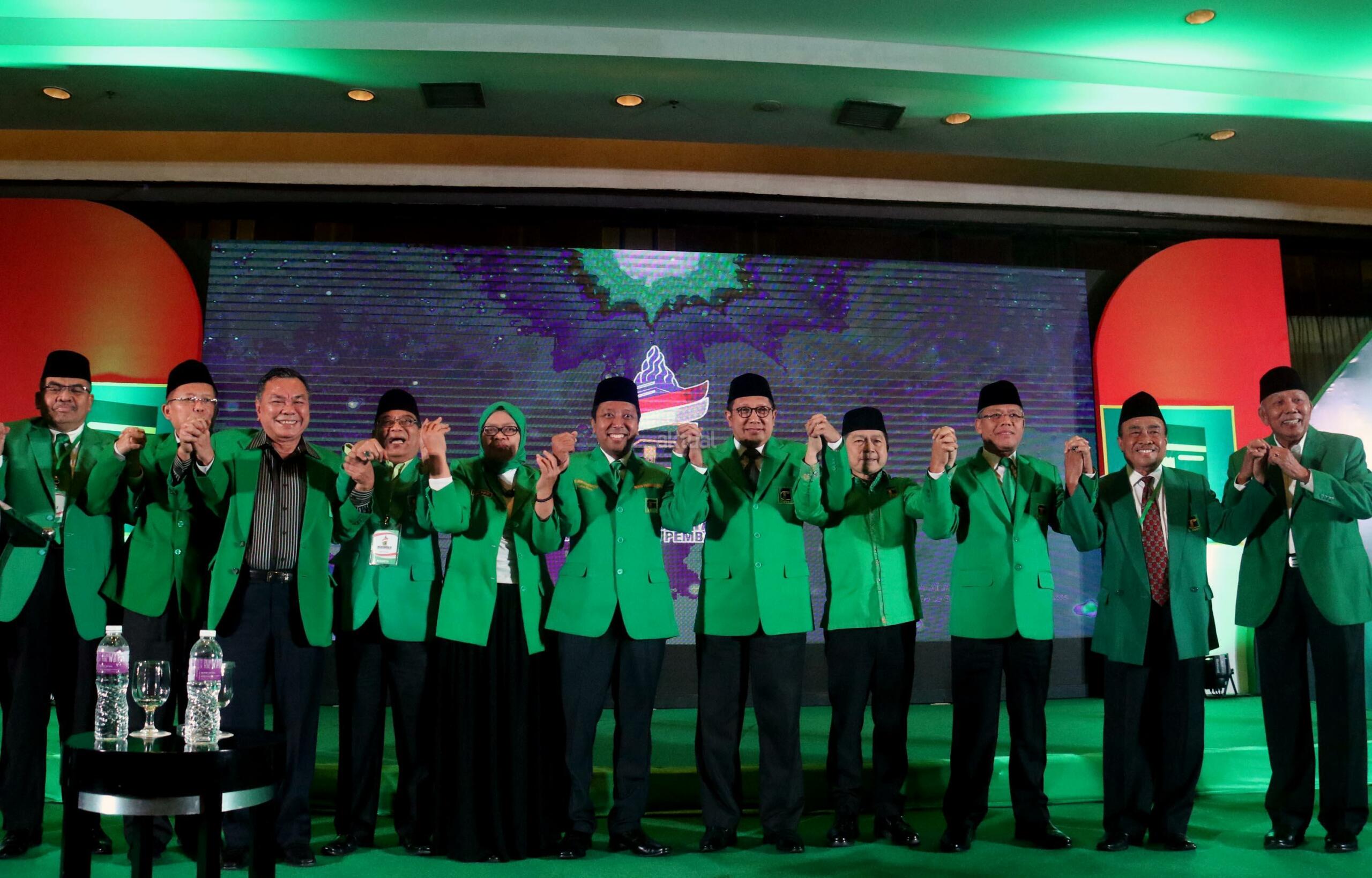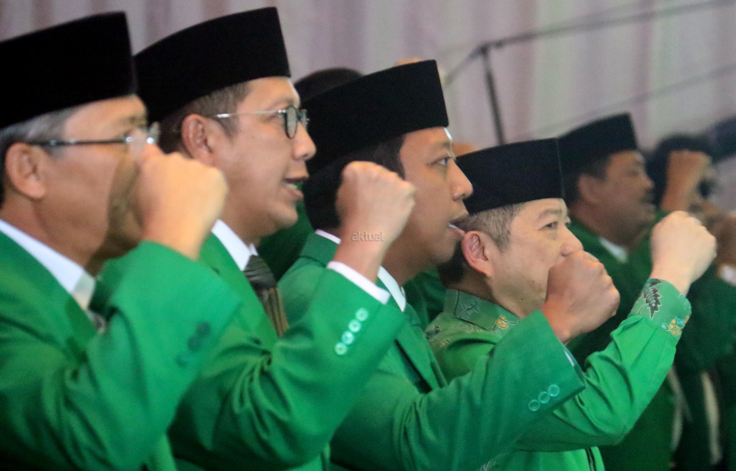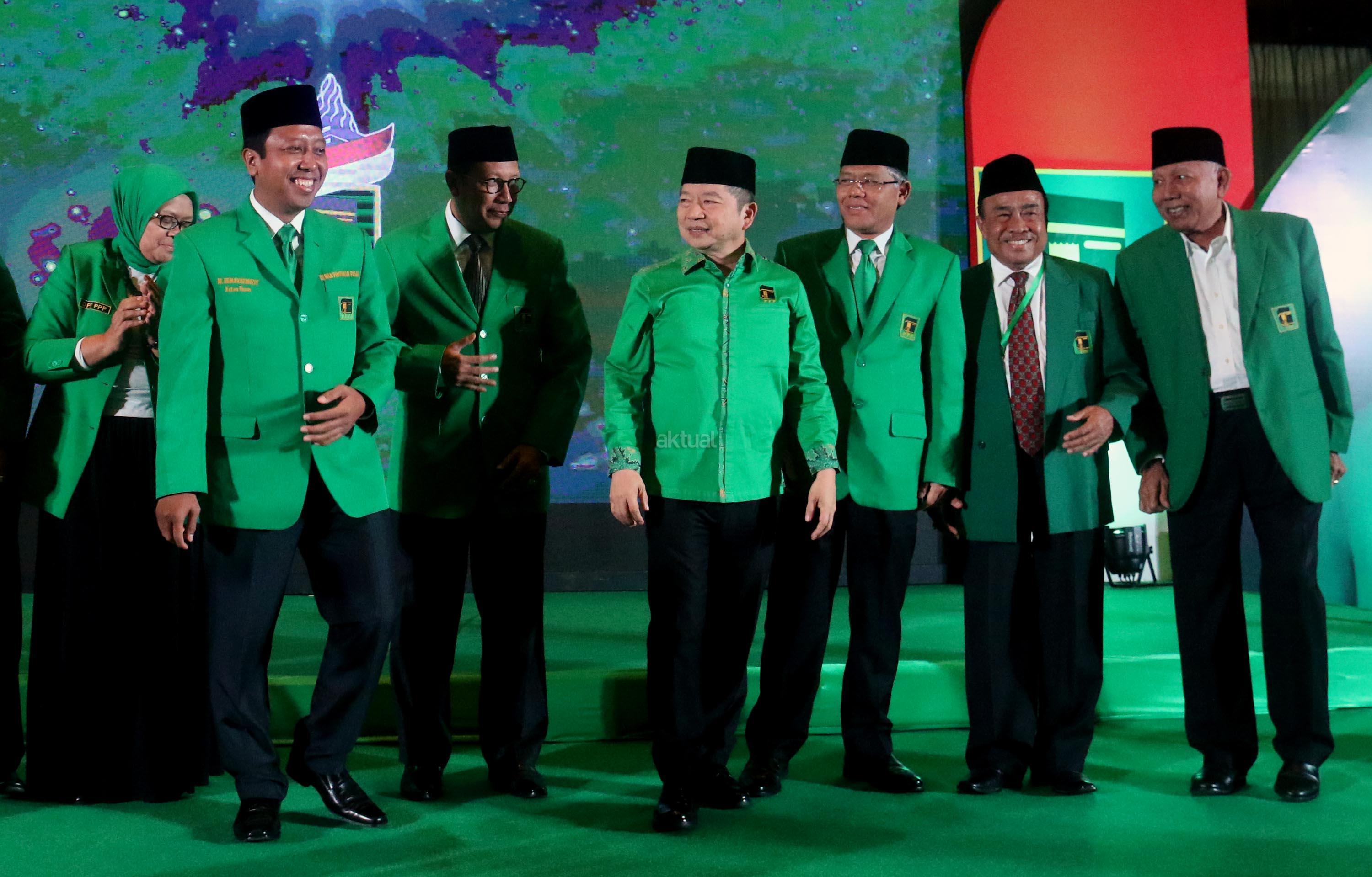 Ketua Umum Partai Persatuan Pembangunan (PPP) Romahurmuziy (tengah) dan pengurus DPP PPP berfoto bersama usai membuka Mukernas II Bimtek Anggota DPRD PPP di Jakarta, Rabu (19/7/2017), malam. Dalam Mukernas tersebut sebanyak 34 DPW PPP se-Indonesia akan menyampaikan pandangan secara umum terkait sikap politik maupun situasi politik terkini serta konsolidasi organisasi dan membahas persiapan pemilu serentak 2019 dan pelaksanaan Pemilukada 2018. AKTUAL/Munzir