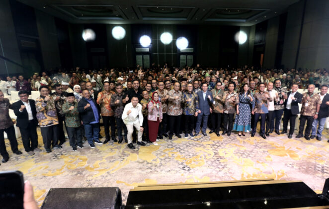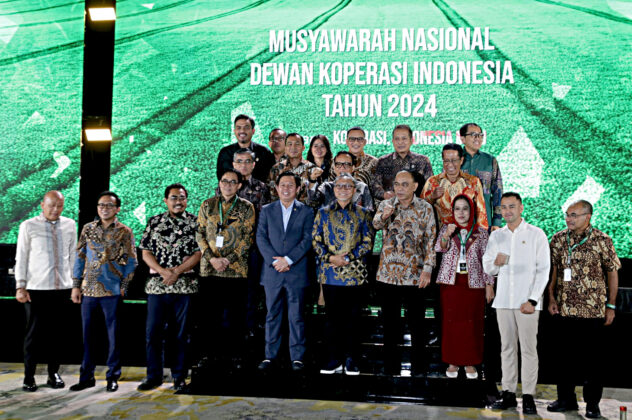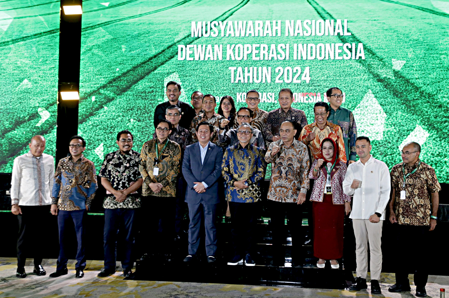 Sejumlah menteri, anggota DPR dan undangan foto bersama pengurus Dewan Koperasi Indonesia (Dekopin) saat pembukaan Munas Dekopin di Jakarta, Jum'at (27/12/2024).