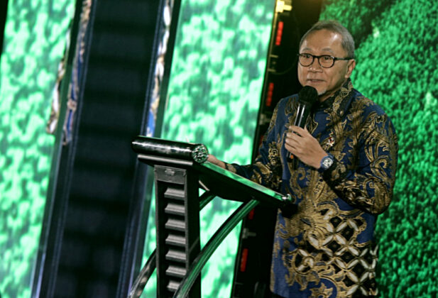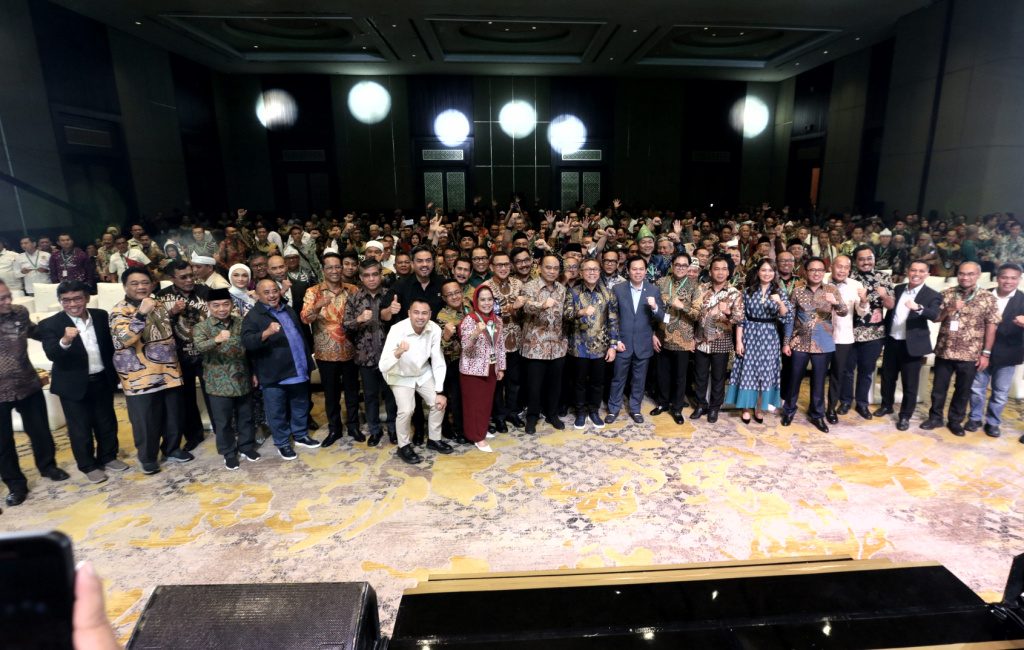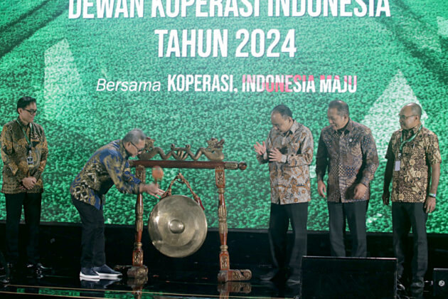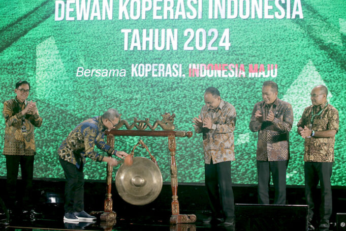 Menteri Koordinator Bidang Pangan Indonesia Zulkifli Hasan (Zulhas) memukul gong didampingi Menteri Koperasi Budi Arie, Ketua Panitia Munas Dewan Koperasi Indonesia (Dekopin), Haris Rusly Moti, Ketum Dewan Koperasi Indonesia (Dekopin) Priskhianto dan Wakil Menteri Koperasi, Ferry Joko Yuliantono saat pembukaan Munas Dewan Koperasi Indonesia (Dekopin) di Jakarta, Jum'at (27/12/2024).