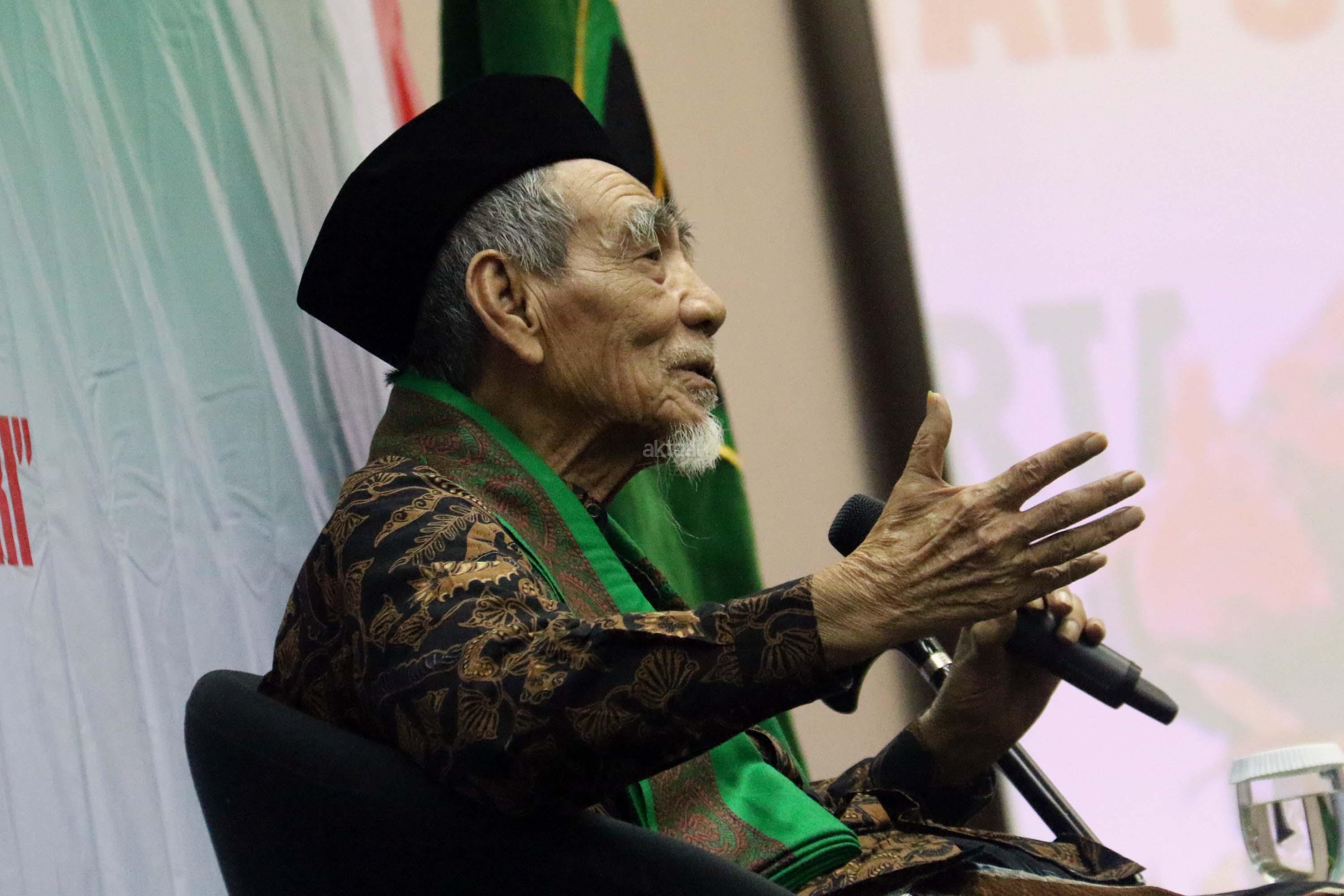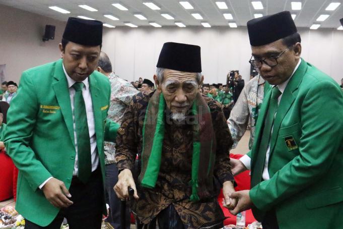 Ketua Majelis Syariah PPP KH Maimun Zubair saat memberikan tausiah dalam acara pembukaan Rapat Pimpinan Nasional (Rapimnas) II PPP versi muktamar Surabaya di Hotel Ibis Cawang, Jakarta Timur, Selasa (23/5/2017). Dalam pidato politiknya tersebut Romi, panggilan akrabnya mendorong kader PPP untuk membawa agama, terutama agama Islam menjadi mitra yang simbiosis mutualisme dengan negara. AKTUAL/Munzir