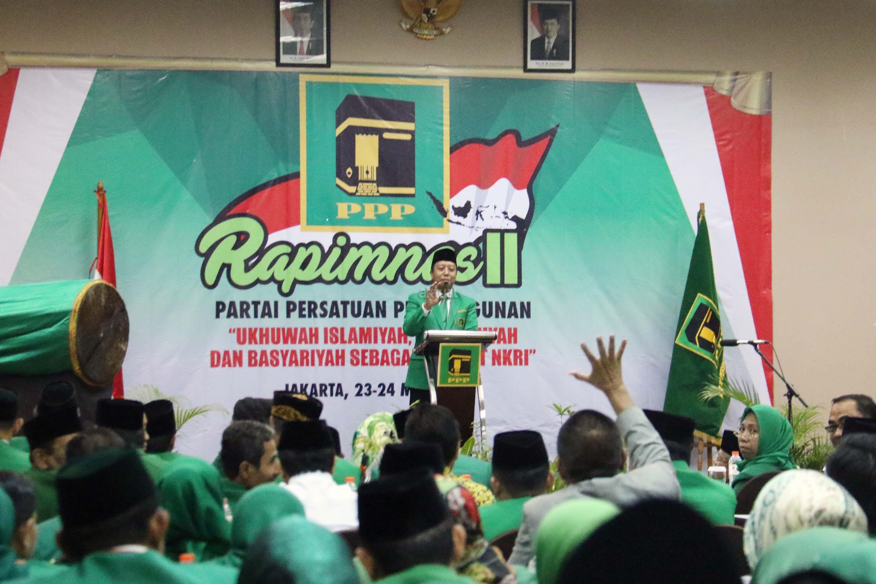 Ketua Umum Dewan Pimpinan Pusat Partai Persatuan Pembangunan (DPP PPP) Romahurmuziy memberi pidato politik dalam pembukaan Rapat Pimpinan Nasional (Rapimnas) II PPP versi muktamar Surabaya di Hotel Ibis Cawang, Jakarta Timur, Selasa (23/5/2017). Dalam pidato politiknya tersebut Romi, panggilan akrabnya mendorong kader PPP untuk membawa agama, terutama agama Islam menjadi mitra yang simbiosis mutualisme dengan negara. AKTUAL/Munzir