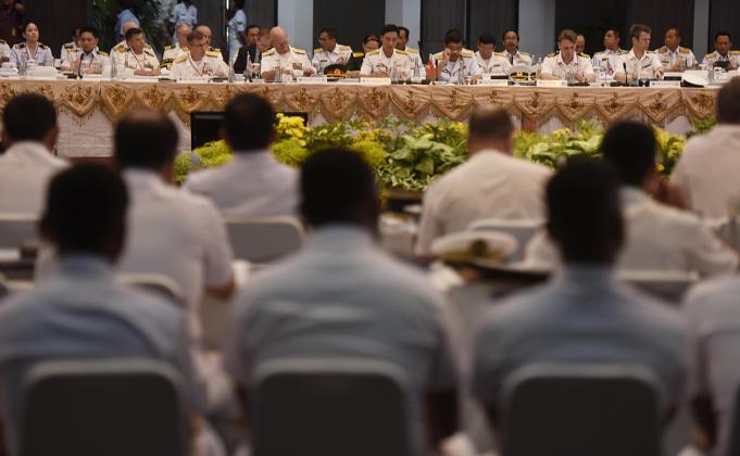 Delegasi Angkatan Laut dari sejumlah negara mengikuti Western Pasific Naval Symposium (WPNS) ke-15 di Padang, Sumatera Barat, Rabu (13/4). WPNS yang diikuti delegasi angkatan laut dari 27 negara itu mengangkat tema Kerjasama Maritim untuk menjaga stabilitas di wilayah Pasific Barat. ANTARA FOTO/Akbar Nugroho Gumay/pd/16