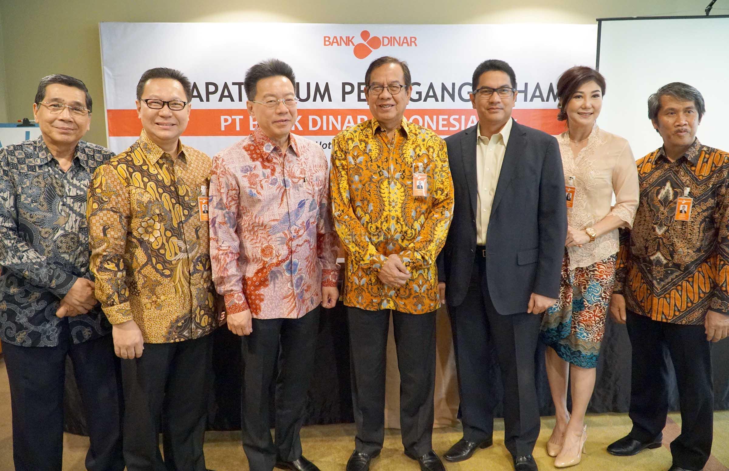 Dari kiri ke kanan, Direktur Kepatuhan PT Bank Dinar Indonesia Tbk (DNAR) Idham Aziz, Direktur Utama Hendra Lie, Pemegang saham Nio Yantony, Komisaris Utama Syaiful Amir, Pemegang saham Andre Mirza Hartawan, Komisaris Independen Efen Lingga Utama, Direktur Operasional Joyo berfoto bersama usai Rapat Umum Pemegang Saham Tahunan (RUPST) dan Rapat Umum Pemegang Saham Luar Biasa (RUPSLB) di Jakarta, Senin (10/4). Rapat menyetujui laporan direksi tentang kinerja perseroan dan pengesahan neraca serta perhitungan Laba/Rugi perseroan yang berakhir untuk tahun 31 Desember 2016. Sementara kinerja Bank Dinar selama 2016 mencatat peningkatan total aset Rp 2,31 triliun, jumlah ini tumbuh Rp 237,56 miliar atau 11,46 persen lebih tinggi dibanding Rp 2,07 triliun pada 2015. Pencapaian total aset Bank Dinar pada 2016 ditopang, antara lain oleh pertumbuhan dana pihak ketiga (DPK) sebesar Rp 1,62 triliun, meningkat sebesar Rp 144,20 miliar dari 2015. Untuk pencapaian kredit perseroan 2016 sebesar Rp 1,33 triliun atau tumbuh 17,20% dari capaian tahun sebelumnya sebesar Rp 1,14 triliun. AKTUAL/Eko S Hilman