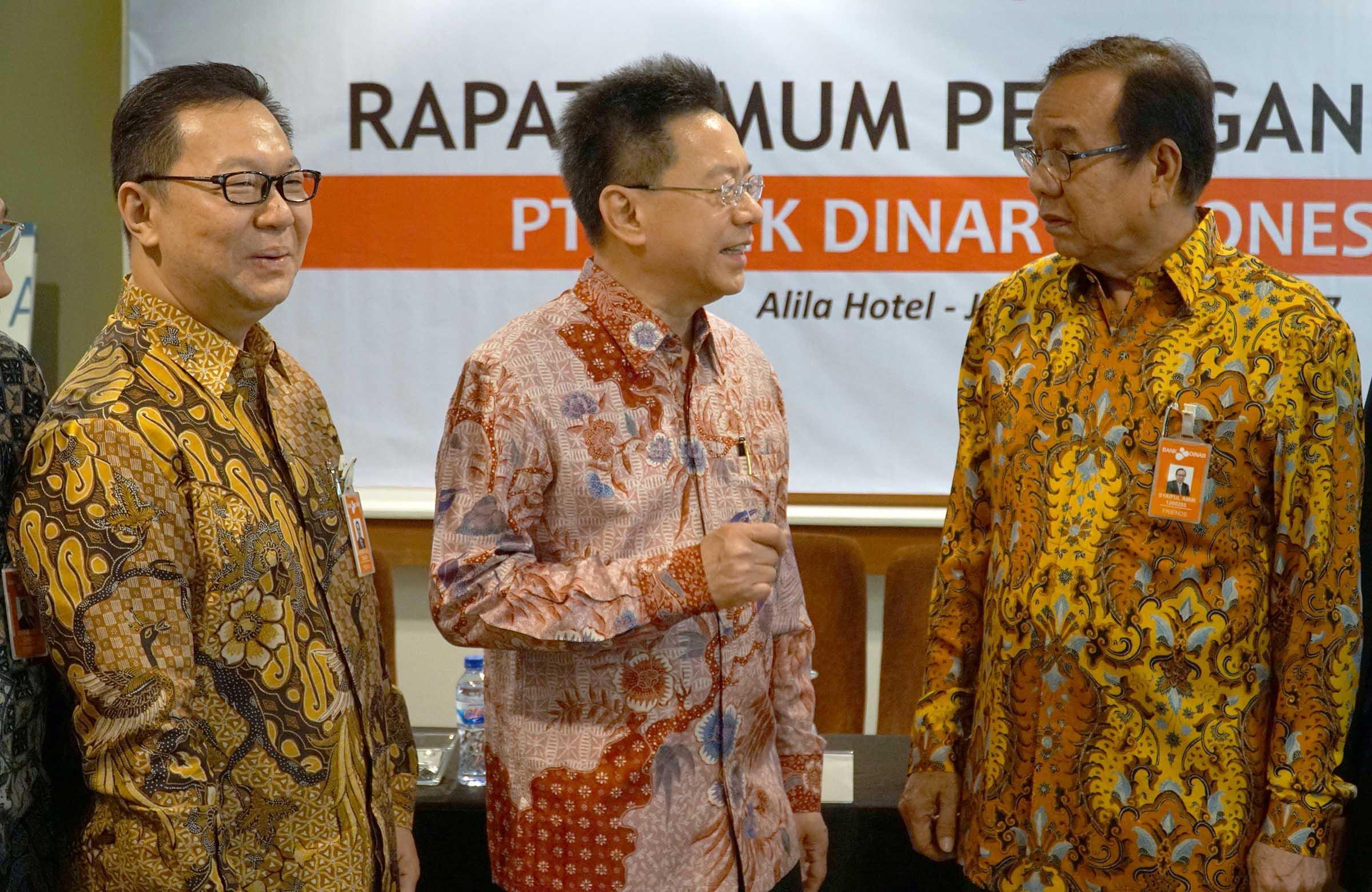 Pemegang saham PT Bank Dinar Indonesia Tbk (DNAR) Nio Yantony (tengah) berbincang dengan Komisaris Utama Syaiful Amir (kanan) dan Direktur Utama Hendra Lie (kiri) usai Rapat Umum Pemegang Saham Tahunan (RUPST) dan Rapat Umum Pemegang Saham Luar Biasa (RUPSLB) di Jakarta, Senin (10/4). Rapat menyetujui laporan direksi tentang kinerja perseroan dan pengesahan neraca serta perhitungan Laba/Rugi perseroan yang berakhir untuk tahun 31 Desember 2016. Sementara kinerja Bank Dinar selama 2016 mencatat peningkatan total aset Rp 2,31 triliun, jumlah ini tumbuh Rp 237,56 miliar atau 11,46 persen lebih tinggi dibanding Rp 2,07 triliun pada 2015. Pencapaian total aset Bank Dinar pada 2016 ditopang, antara lain oleh pertumbuhan dana pihak ketiga (DPK) sebesar Rp 1,62 triliun, meningkat sebesar Rp 144,20 miliar dari 2015. Untuk pencapaian kredit perseroan 2016 sebesar Rp 1,33 triliun atau tumbuh 17,20% dari capaian tahun sebelumnya sebesar Rp 1,14 triliun. AKTUAL/Eko S Hilman
