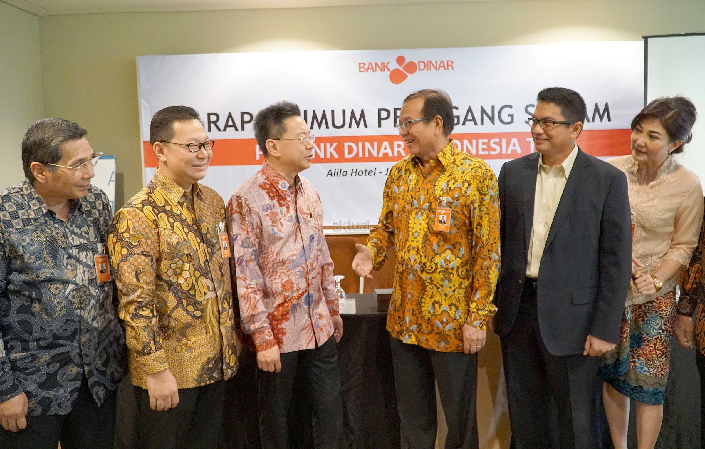 Dari kiri ke kanan, Direktur Kepatuhan PT Bank Dinar Indonesia Tbk (DNAR) Idham Aziz, Direktur Utama Hendra Lie, Pemegang saham Nio Yantony, Komisaris Utama Syaiful Amir, Pemegang saham Andre Mirza Hartawan, Komisaris Independen Efen Lingga Utama berbincang usai Rapat Umum Pemegang Saham Tahunan (RUPST) dan Rapat Umum Pemegang Saham Luar Biasa (RUPSLB) di Jakarta, Senin (10/4). Rapat menyetujui laporan direksi tentang kinerja perseroan dan pengesahan neraca serta perhitungan Laba/Rugi perseroan yang berakhir untuk tahun 31 Desember 2016. Sementara kinerja Bank Dinar selama 2016 mencatat peningkatan total aset Rp 2,31 triliun, jumlah ini tumbuh Rp 237,56 miliar atau 11,46 persen lebih tinggi dibanding Rp 2,07 triliun pada 2015. Pencapaian total aset Bank Dinar pada 2016 ditopang, antara lain oleh pertumbuhan dana pihak ketiga (DPK) sebesar Rp 1,62 triliun, meningkat sebesar Rp 144,20 miliar dari 2015. Untuk pencapaian kredit perseroan 2016 sebesar Rp 1,33 triliun atau tumbuh 17,20% dari capaian tahun sebelumnya sebesar Rp 1,14 triliun. AKTUAL/Eko S Hilman