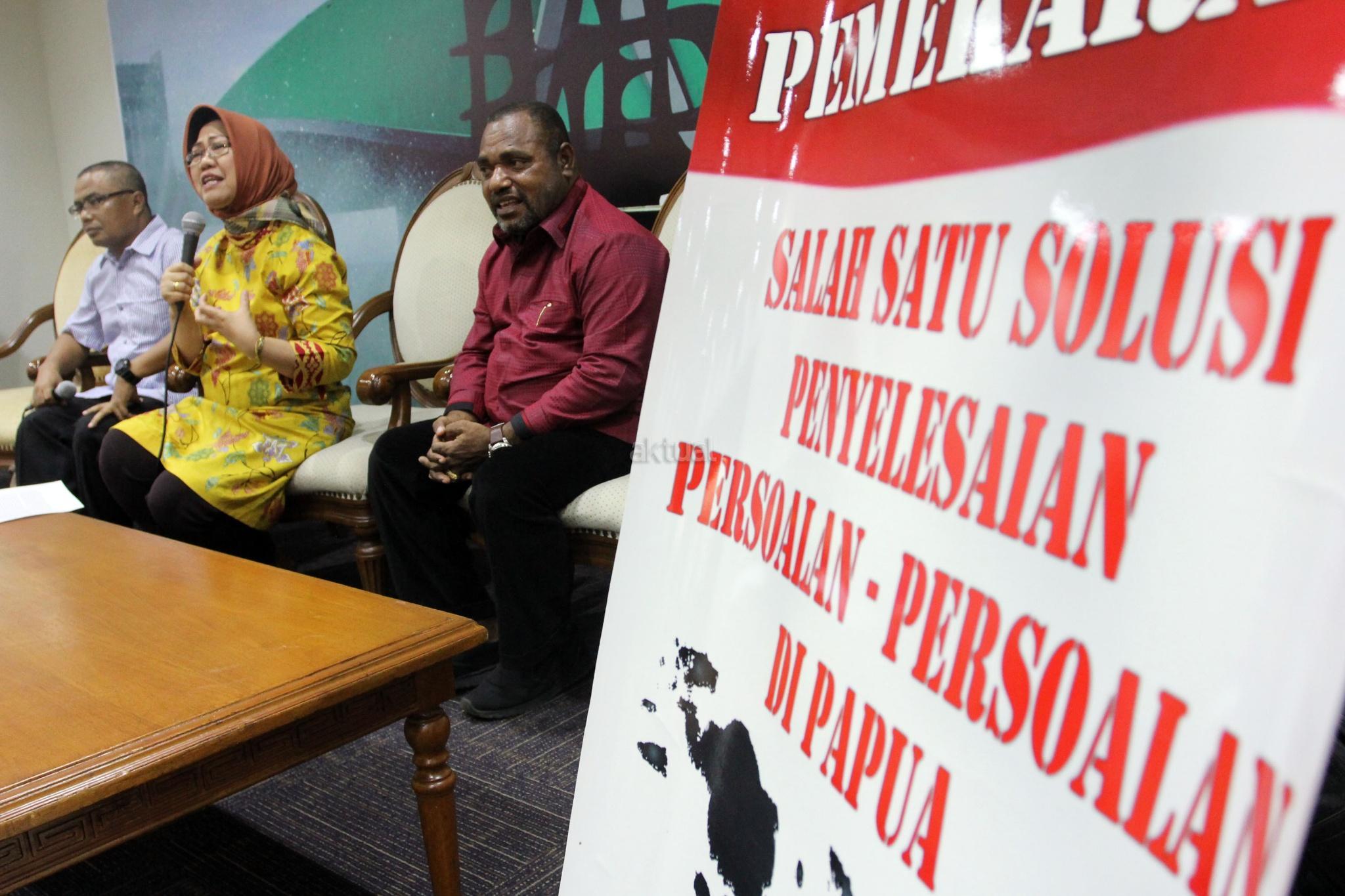 Anggota DPR Fraksi PDIP Dapil Papua Jemmie Demianus Ijie (kanan) dan Peneliti LIPI Siti Zuhro (tengah) berbicara dalam diskusi publik, di Gedung Nusantara III, Kompleks Parlemen Senayan, Jakarta, Selasa (20/2). Dalam diskusi yang bertajuk “Pemekaran Papua Menjadi Solusi atau Petaka?”, mereka berpaandangan bahwa pemekaran dua Propinsi yang sudah ada di Papua yaitu Papua dan Papua Barat, dengan ditambah dengan Provinsi Papua Selata, Papua Tengah dan Papua Barat Daya, akan membuat penataan dan pemerataan pembanguan ekonomi dan Sumber Daya Manusia lebih konstruktif dan efektif, namun harus melalui kajian dan aturan untuk memayungi pelaksanaannya agar tidak menjadi sekadar memuasakan kepentingan kelompok elit saja. AKTUAL/Tino Oktaviano
