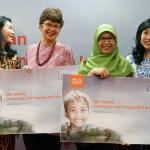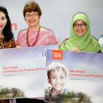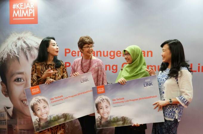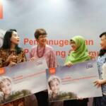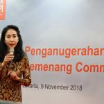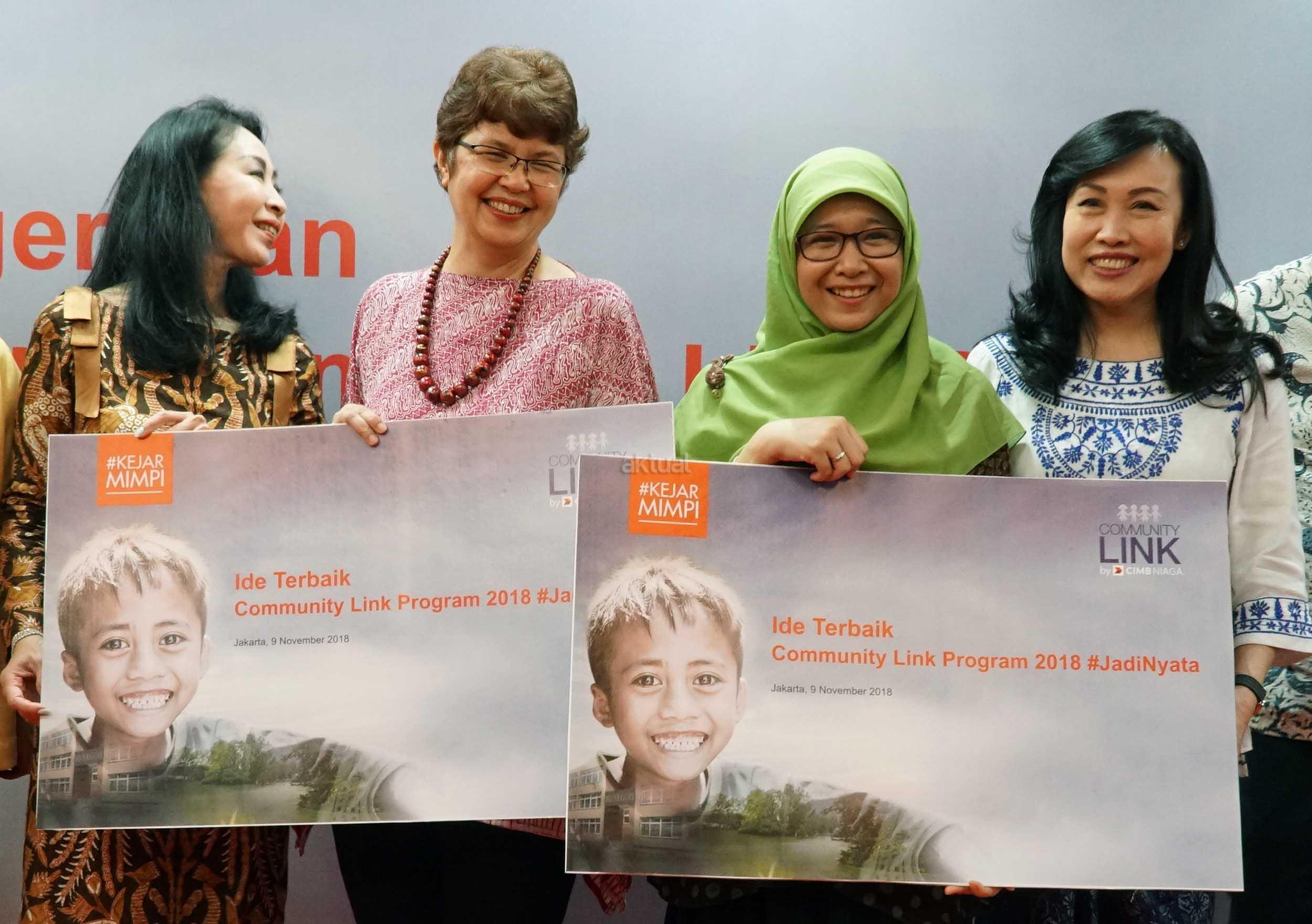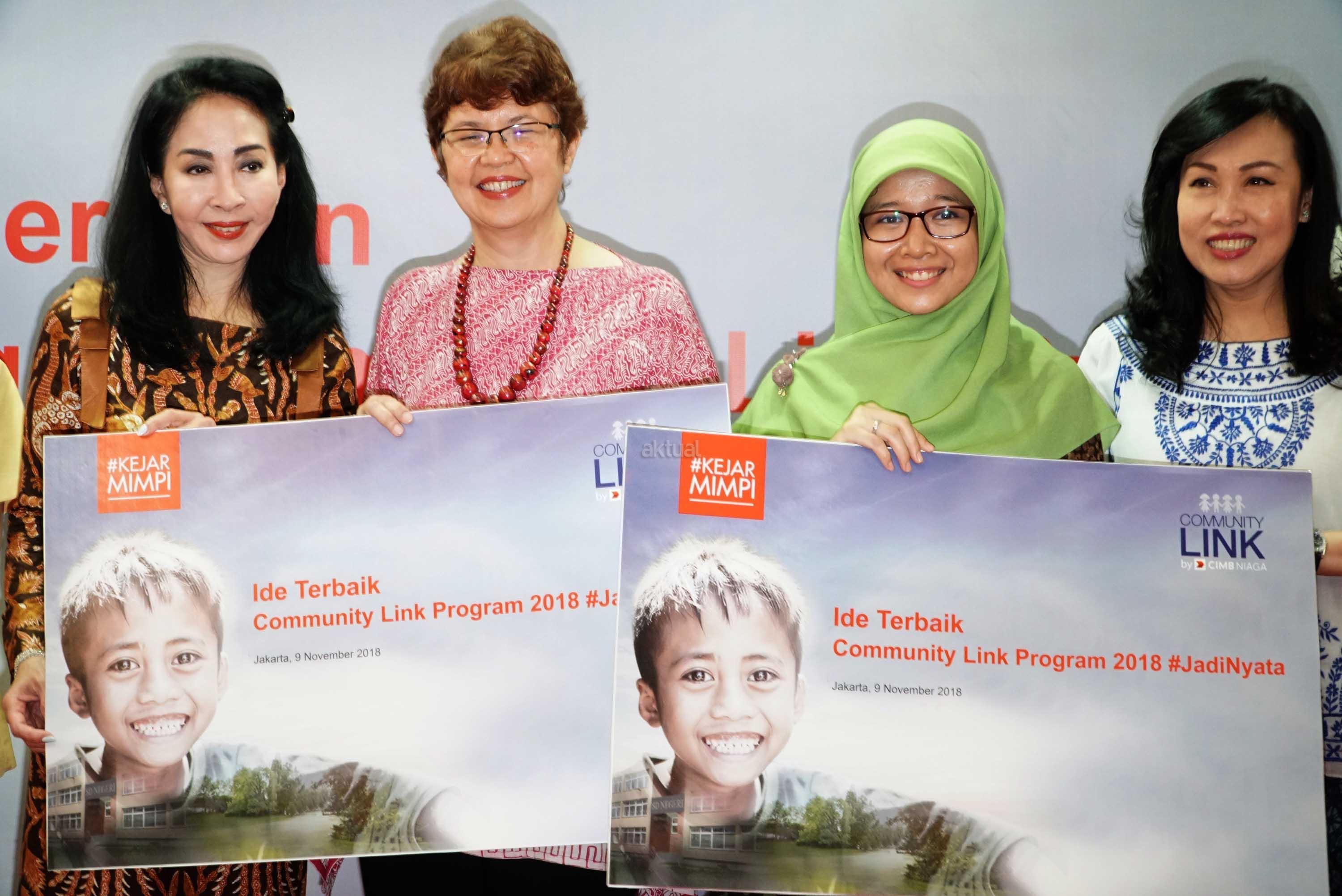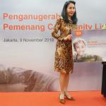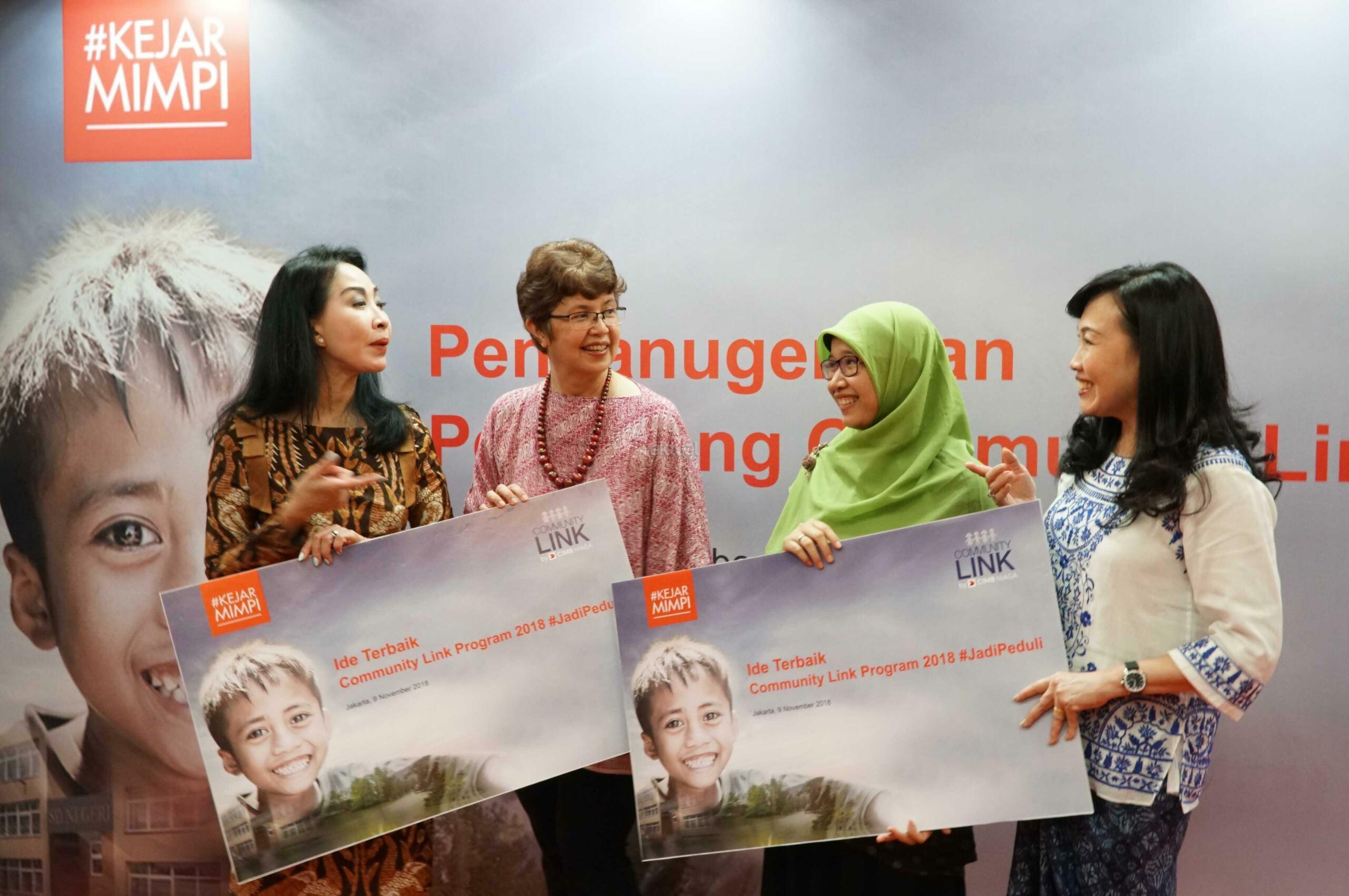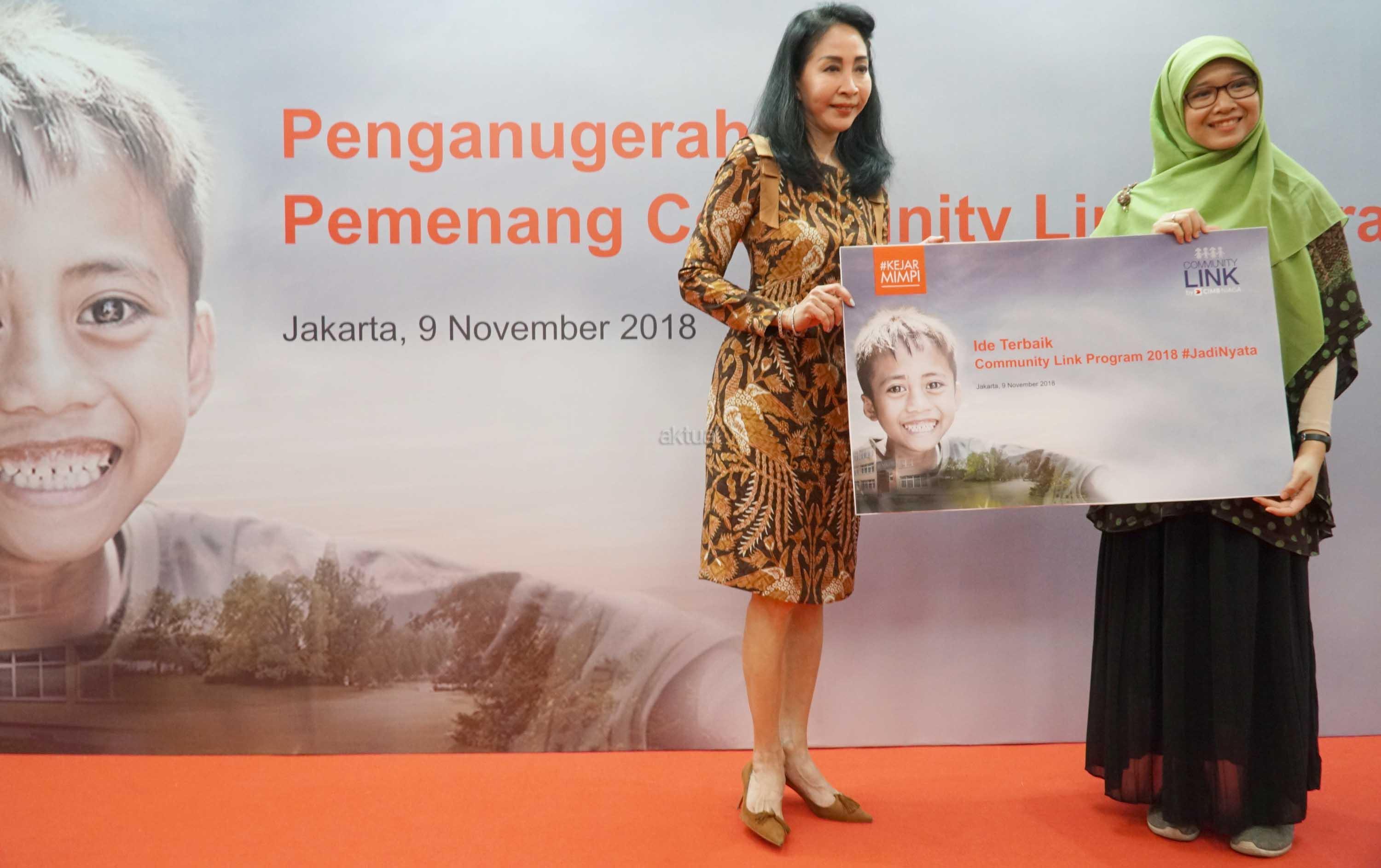 Direktur Compliance, Corporate Secretary and Legal CIMB Niaga Fransiska Oei (kiri) bersama Direktur Consumer Banking CIMB Niaga Lani Darmawan (kanan) menyerahkan hadiah kepada pemenang kompetisi ide corporate social responsibility (CSR) bertajuk Community Link Program 2018 kategori #JadiNyata di Jakarta, Jumat (9/11/2018). Melalui Community Link Program 2018, CIMB Niaga mengajak partisipasi aktif nasabah dan karyawannya untuk melakukan kegiatan CSR guna memberi nilai tambah bagi masyarakat. AKTUAL/Eko S Hilman