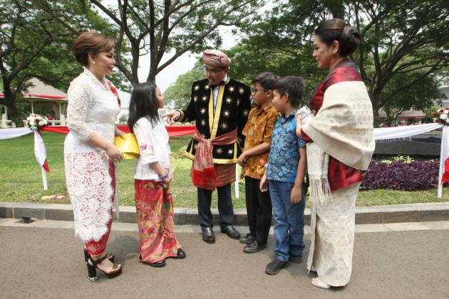 Ketua Harmoni Indonesia Firdaus Ali (tengah), Pengurus Harmoni Indonesia Fetty Aziza (kiri) dan Carmelita Hartoto (kanan) foto bersama dengan anak-anak pemenang lomba vlog tentang "Aku untuk Indonesia" usai mengikuti Detik-Detik Proklamasi di Istana Merdeka, Jakarta, Sabtu (17/8/2019). AKTUAL/HO