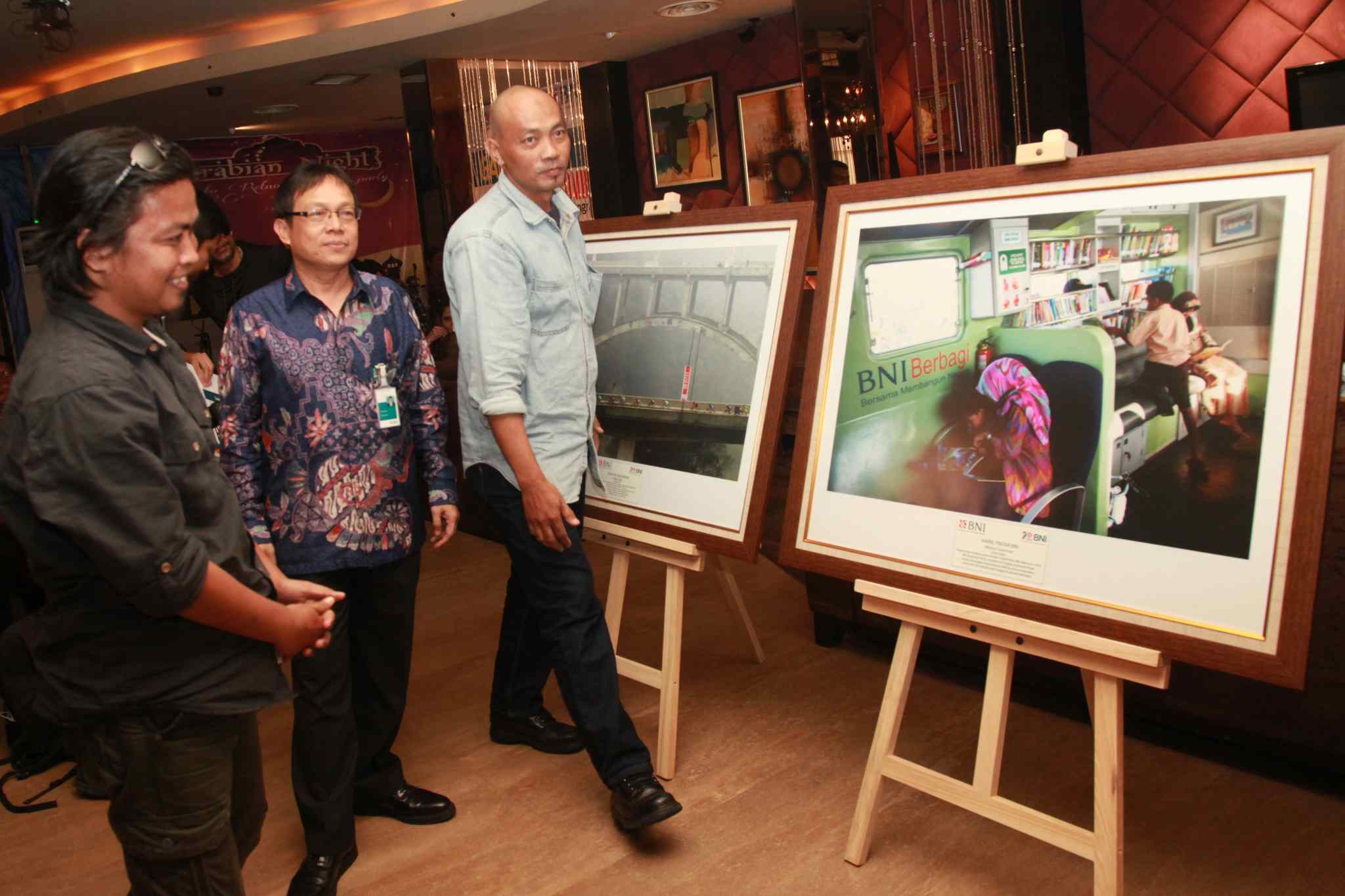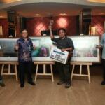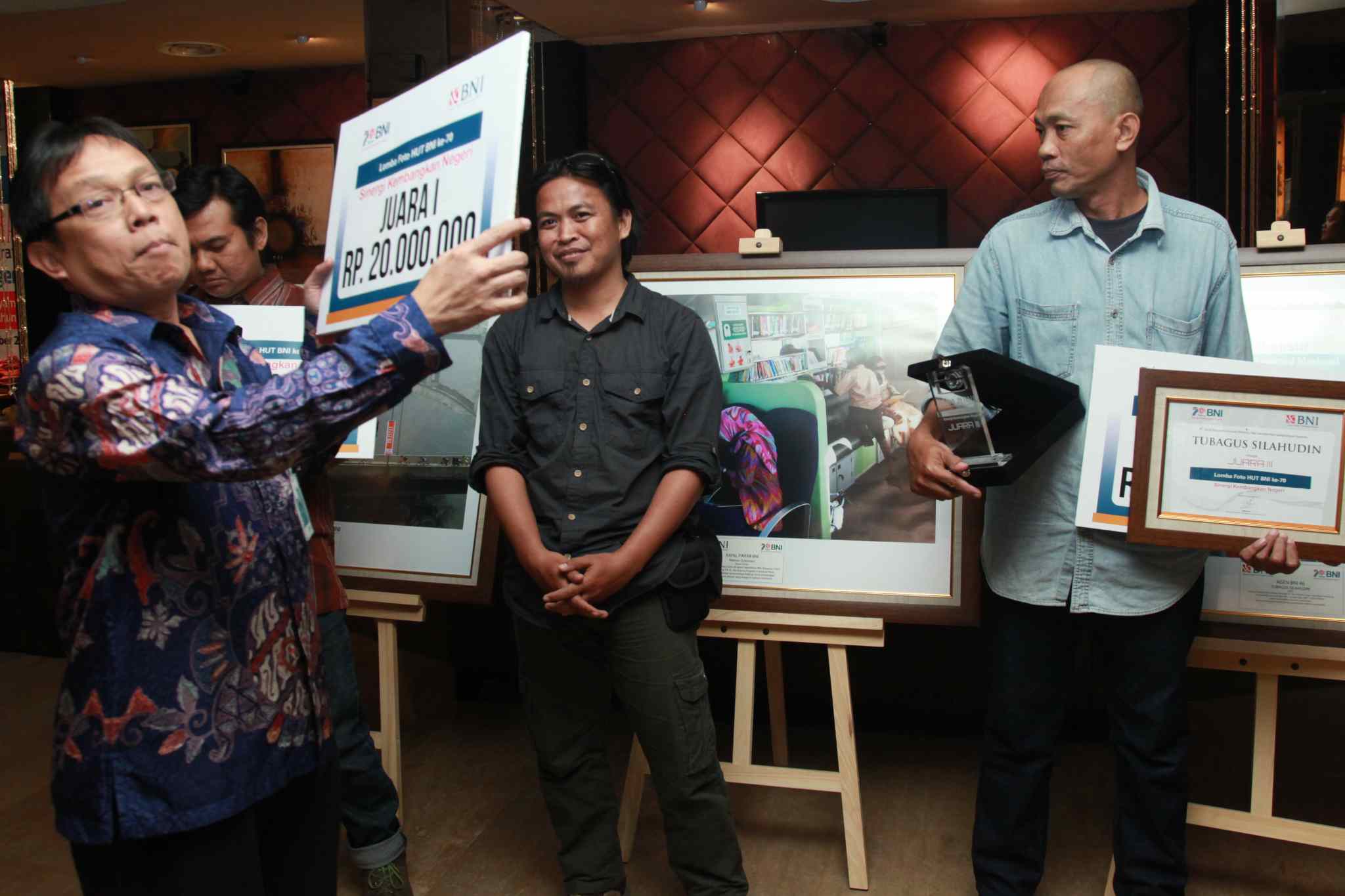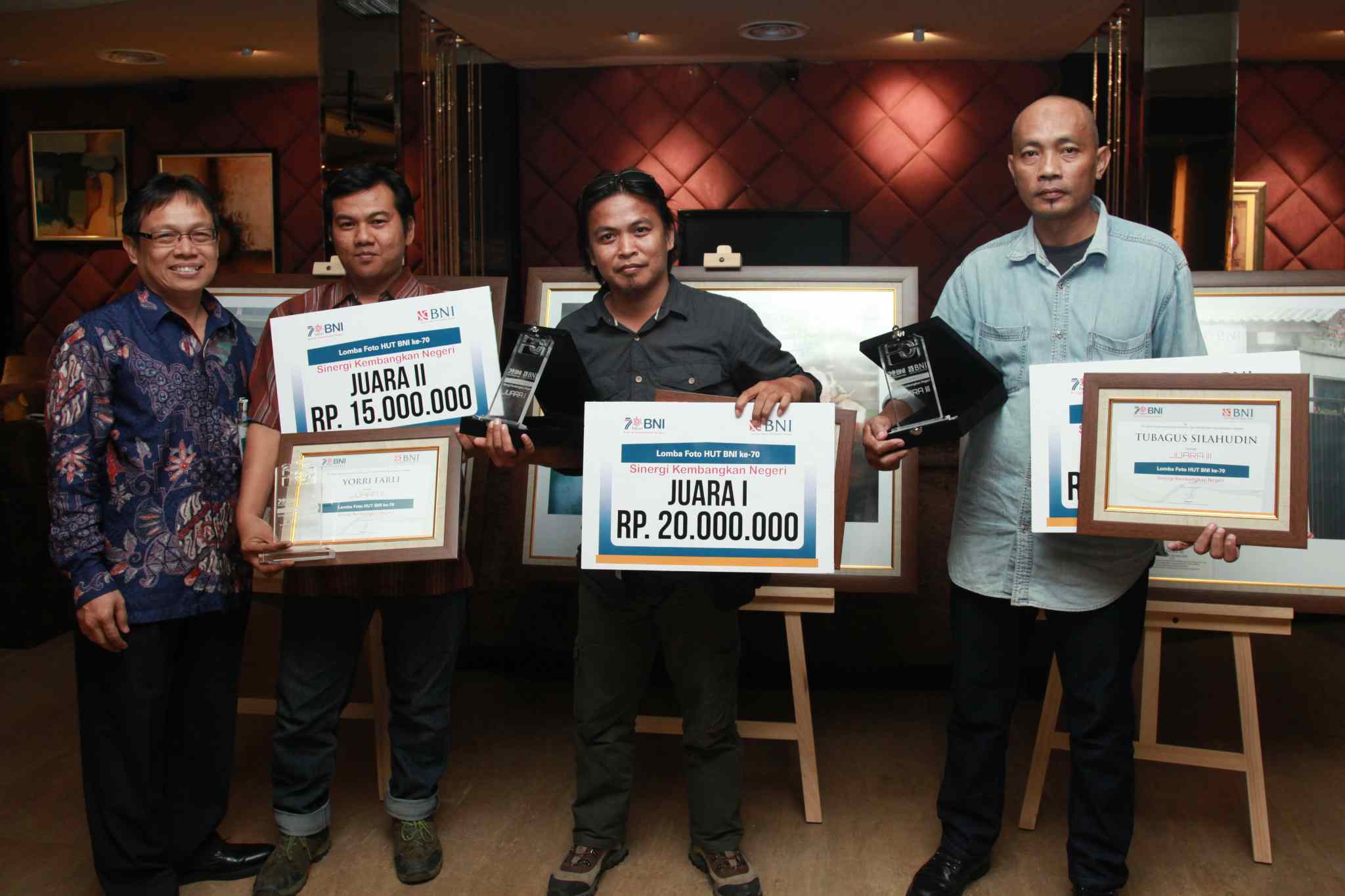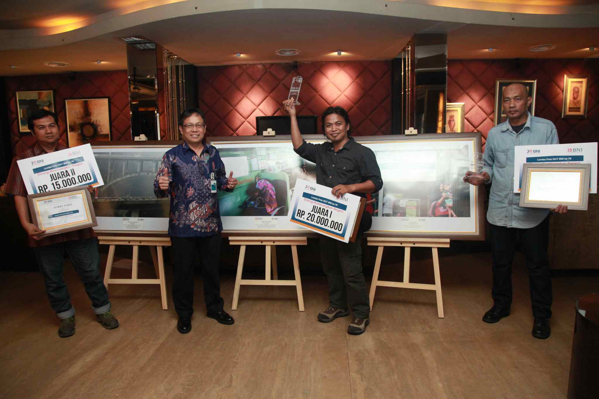 Corporate Secretary PT Bank Negara Negara Indonesia (Persero) Tbk, Kiryanto, bersama pemenang lomba Foto HUT BNI Ke-70 (ki-ka): Salman (perwakilan), Maman Sukirman dan Tubagus Silahudin, saat pengumuman dan penyerahan hadiah di Jakarta, Rabu (7/9). Lomba ini mengangkat tema "70 Tahun BNI Sinergi Kembangkan Negeri". AKTUAL/TINO OKTAVIANO