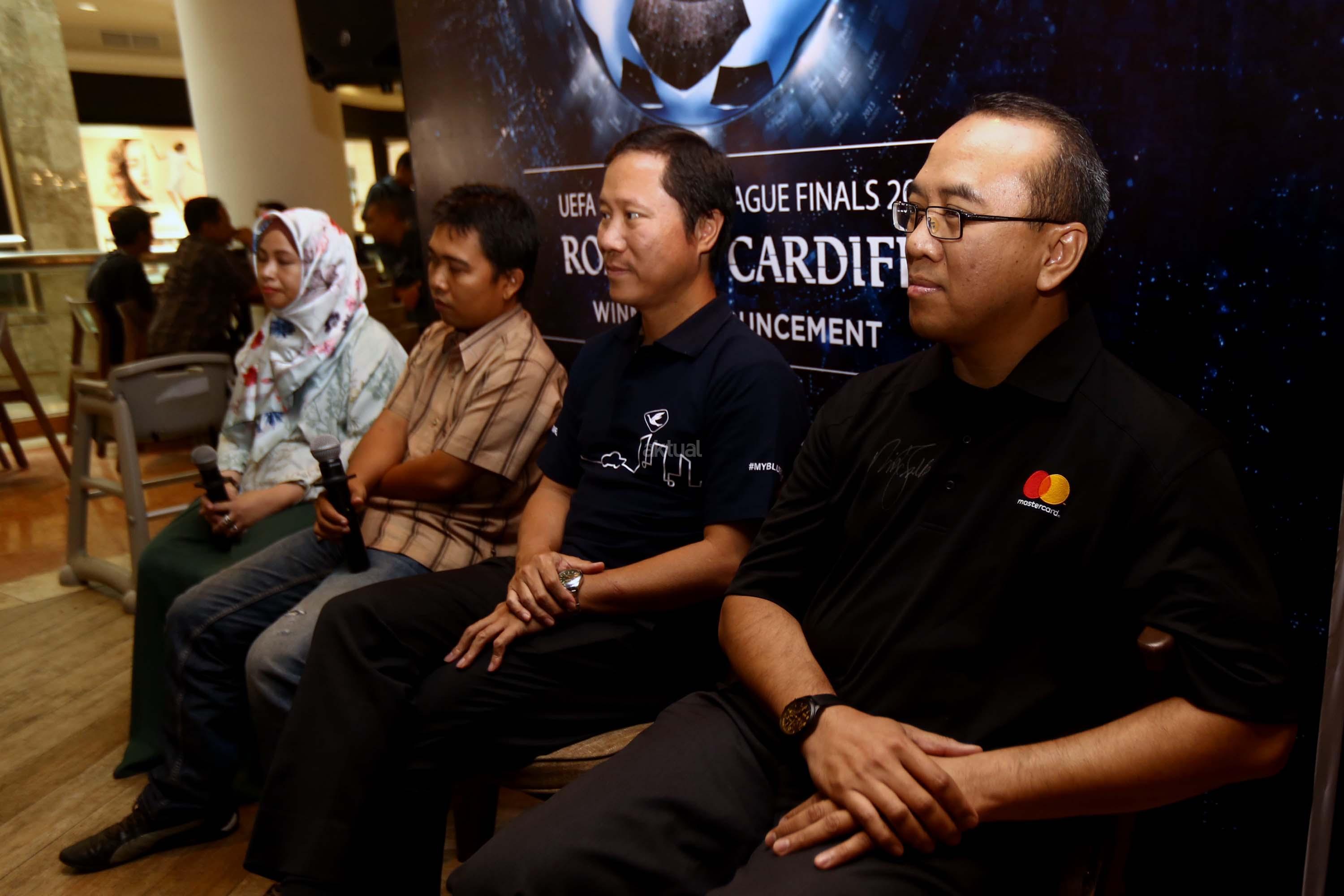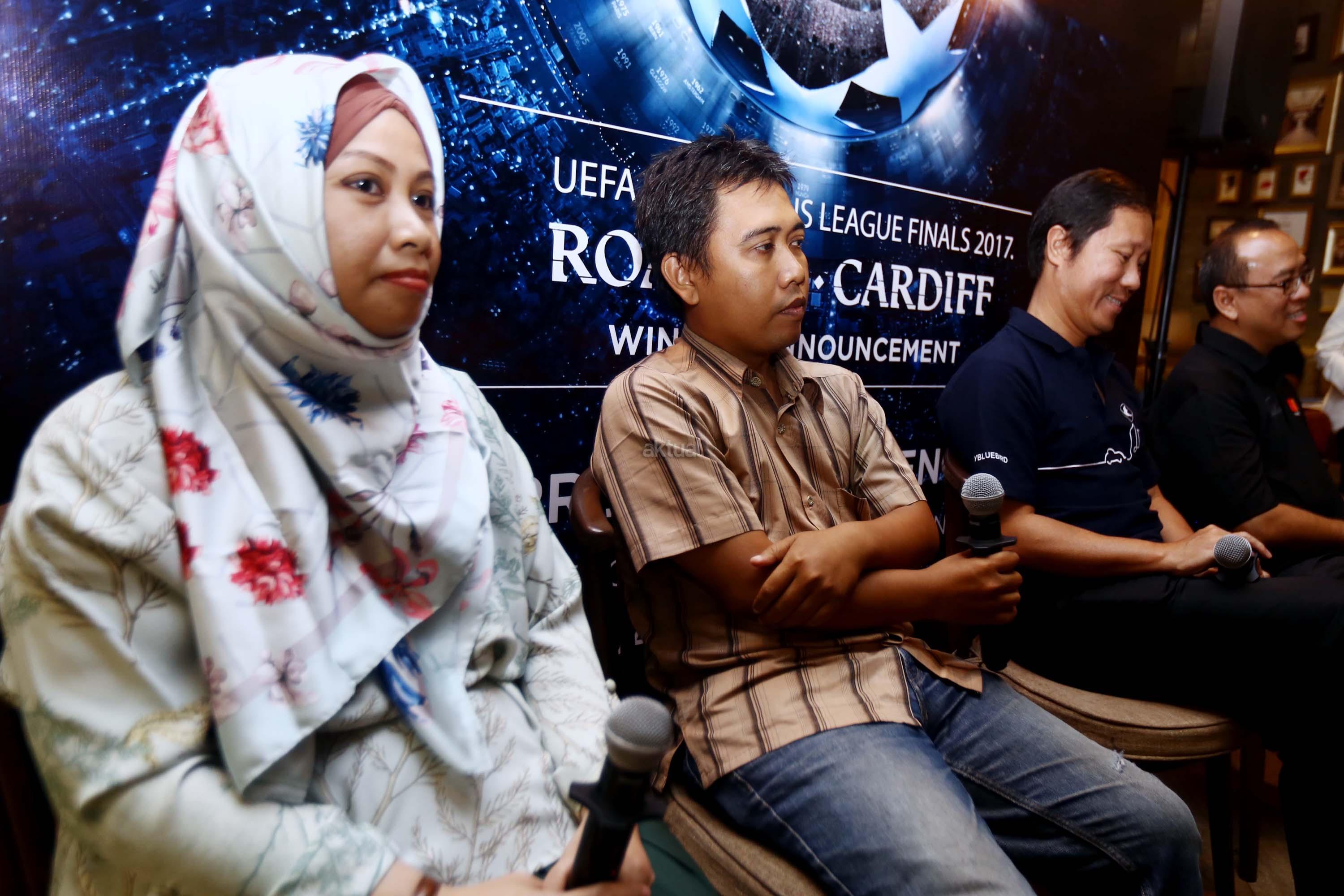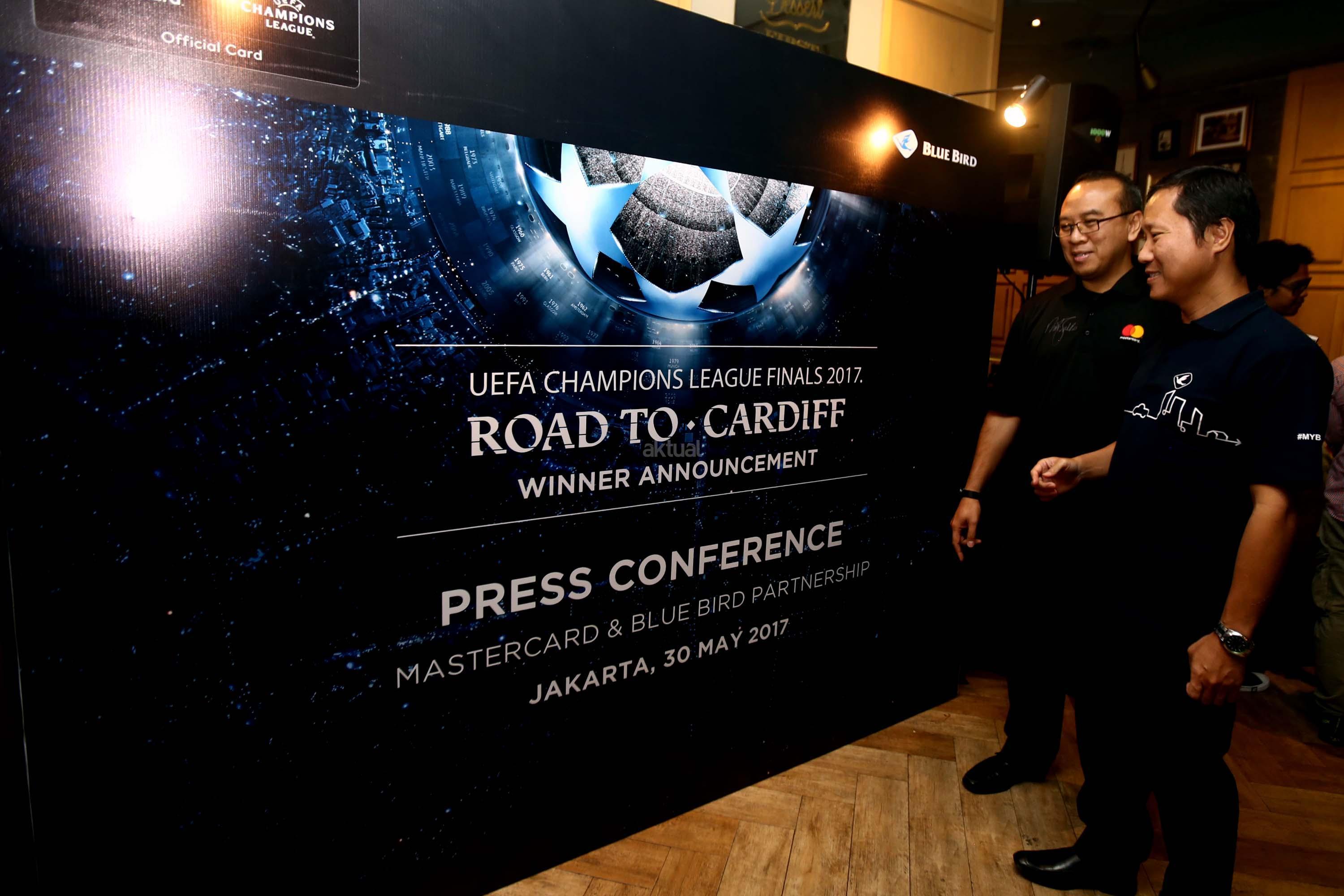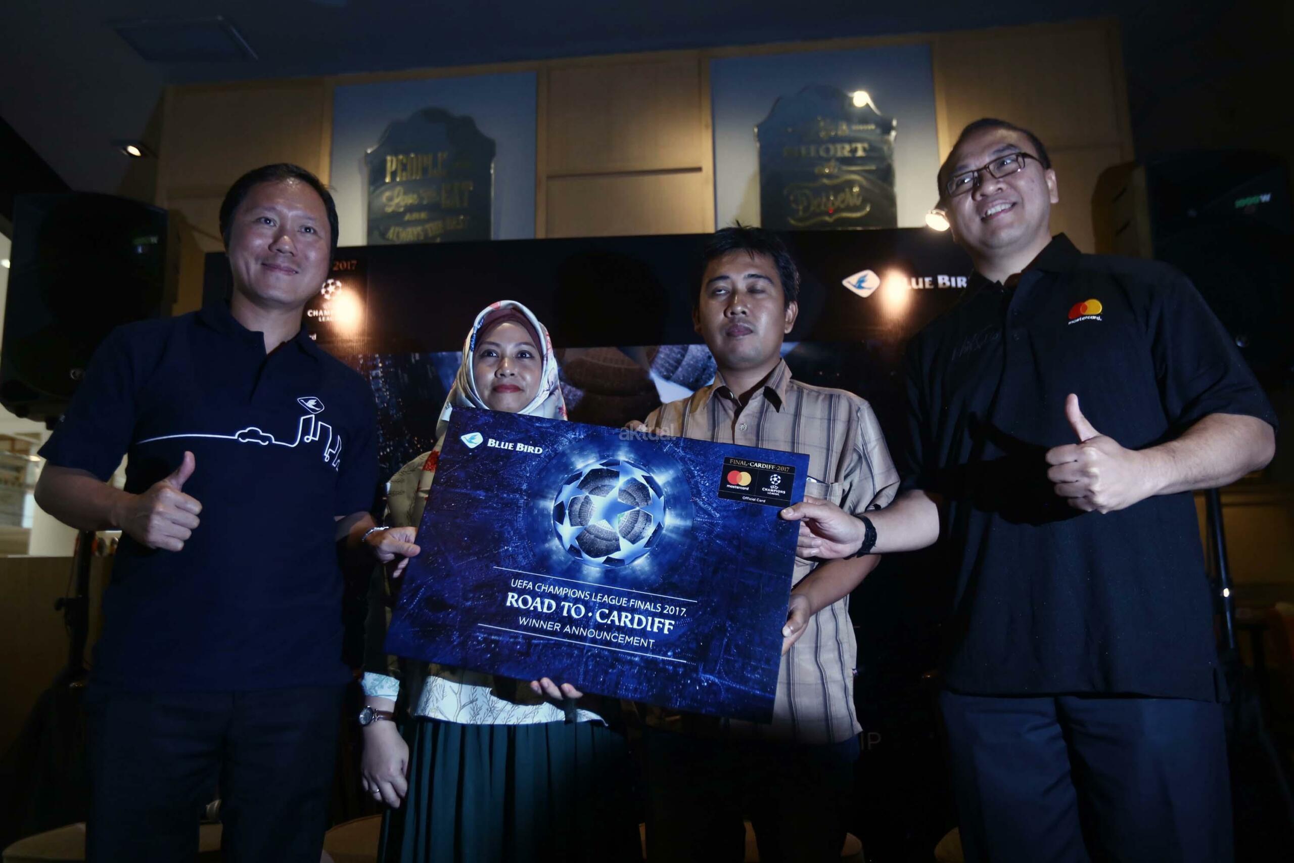 Direktur PT. Blue Bird Tbk Sigit Priawan Djokosoetono (kiri) bersama Direktur Master Card Tommy Singgih (kanan) memberikan hadiah secara simbolis kepada Sri Wahyuni dan Handoyo sebagai pemenang "Road to Cardiff" yang mendapatkan kesempatan menyaksikan langsung pertandingan final Liga Champion UEFA di Jakarta, Kamis(1/6/2017). Selain mengumumkan pemenang, Blue Bird dan Mastercard juga menghadikan promo Ramadan dengan beragam potongan harga menarik bagi pelanggan setia kartu kredit Master card yang melakukan pemesanan taksi melalui aplikasi My Blue Bird. AKTUAL/Munzir