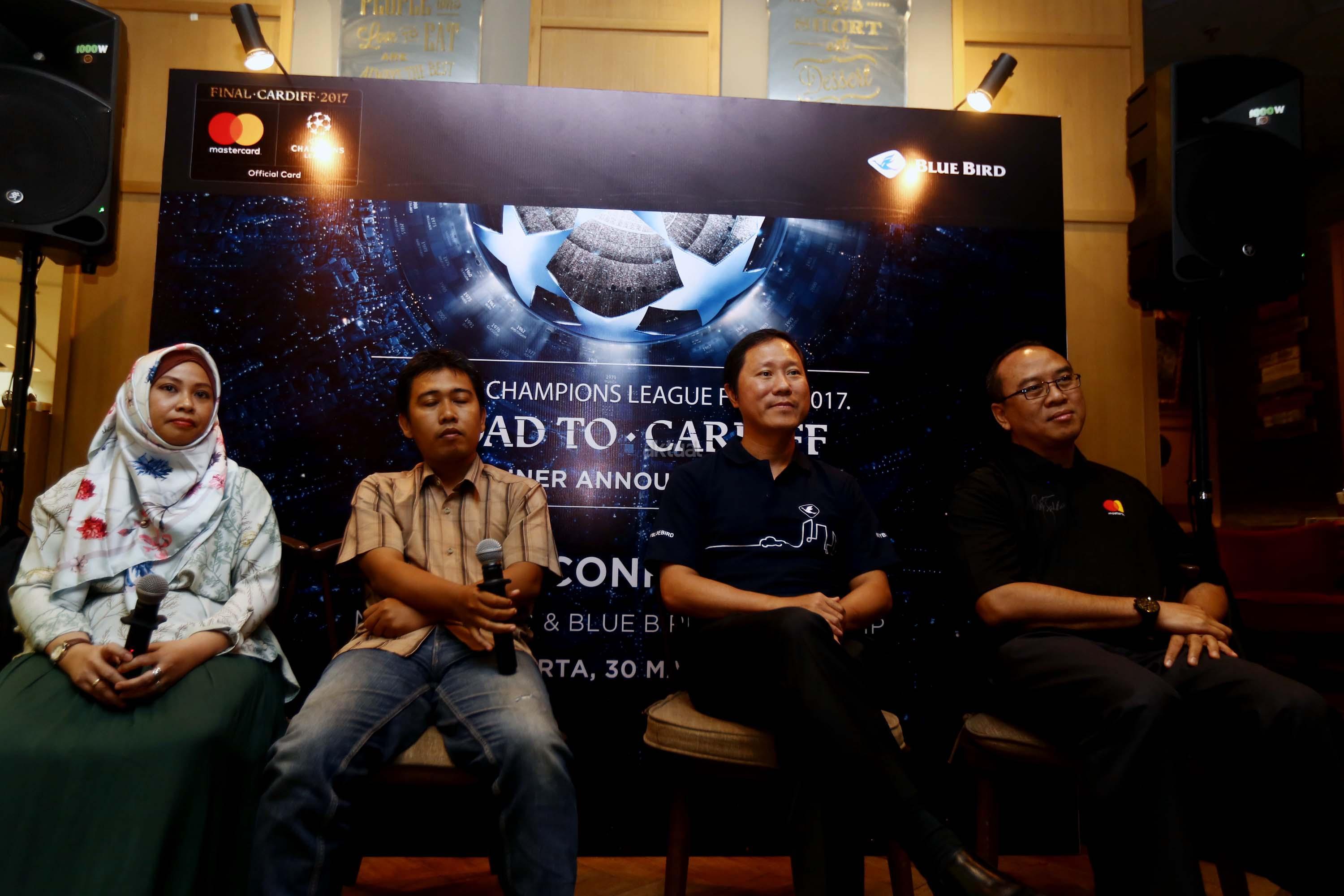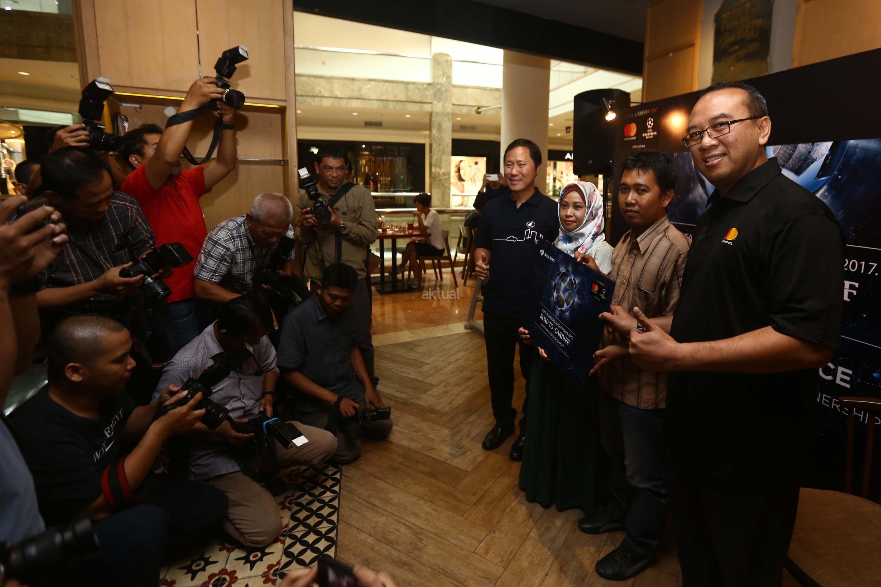Direktur PT. Blue Bird Tbk Sigit Priawan Djokosoetono (kiri) bersama Direktur Master Card Tommy Singgih (kanan) memberikan hadiah secara simbolis kepada Sri Wahyuni dan Handoyo sebagai pemenang “Road to Cardiff” yang mendapatkan kesempatan menyaksikan langsung pertandingan final Liga Champion UEFA di Jakarta, Kamis(1/6/2017). Selain mengumumkan pemenang, Blue Bird dan Mastercard juga menghadikan promo Ramadan dengan beragam potongan harga menarik bagi pelanggan setia kartu kredit Master card yang melakukan pemesanan taksi melalui aplikasi My Blue Bird. AKTUAL/Munzir